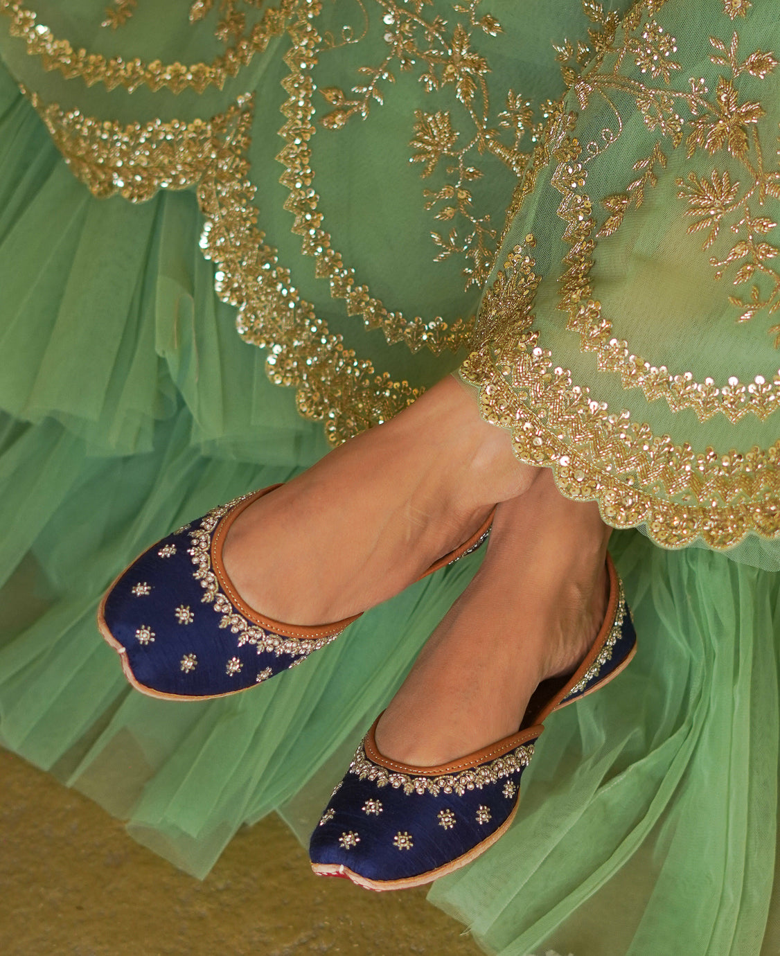Alizeh - a jutti as chic as its name. With delicate embroidery using champagne gold glass beads and off-white pearls resting on a beautiful navy blue base, this pair features the scallop bead motif that has become a distinctive feature of Anushree’s designs. If your colour preferences lean toward the blue end of the palette then this beautiful pair is a must-have in your shoe closet. Versatile and classy, this jutti can be seamlessly paired with both Indian and western outfits.
