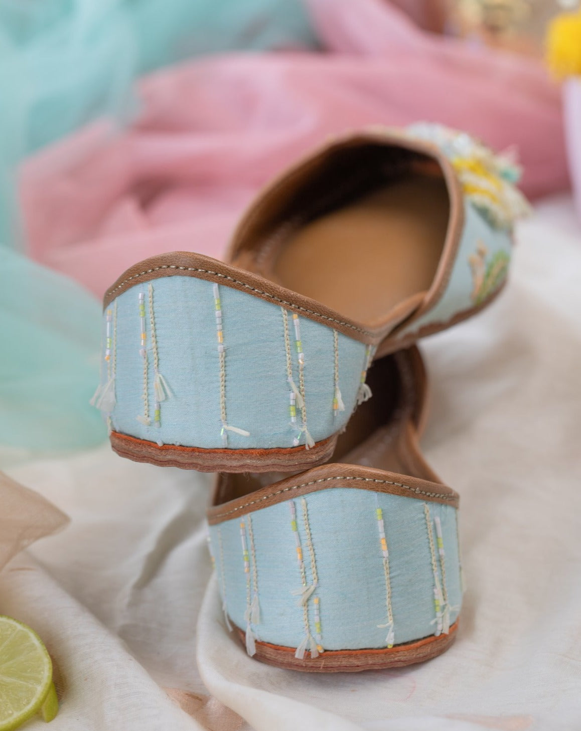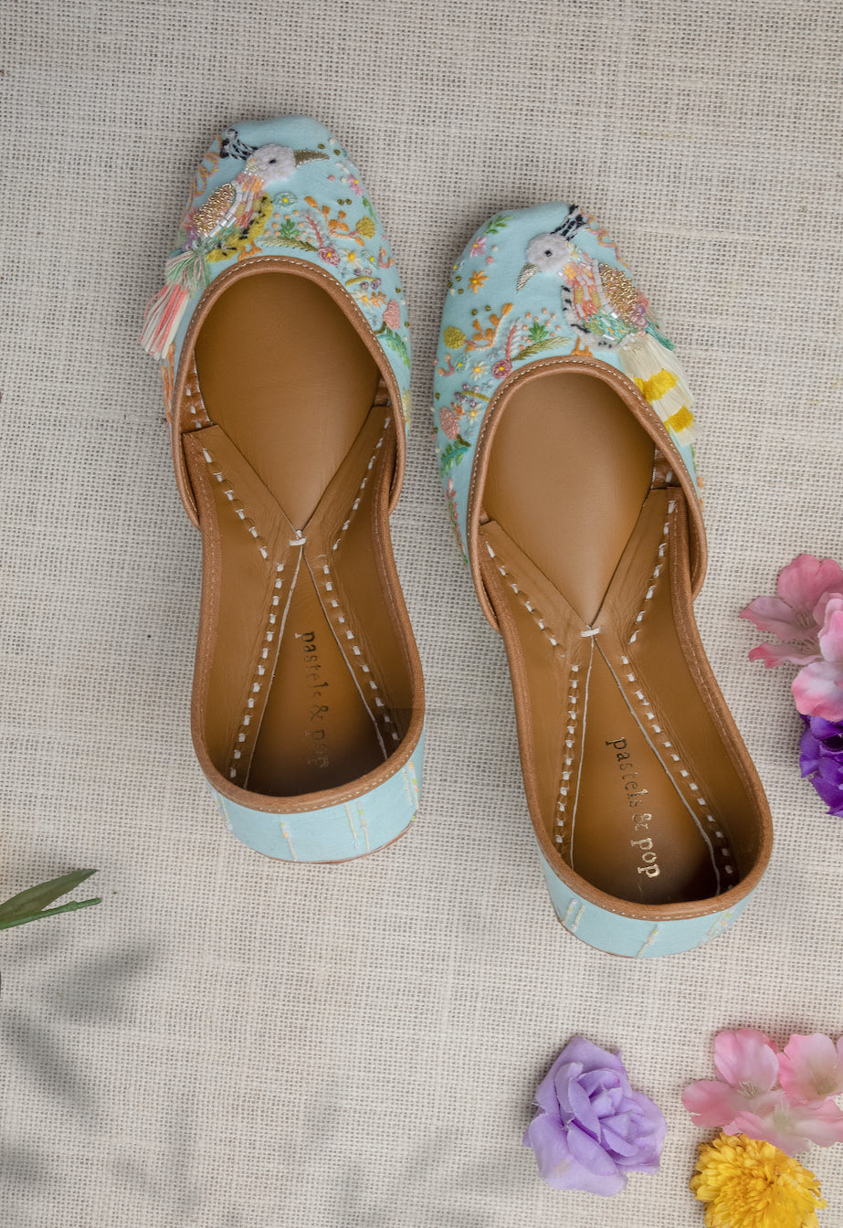 Designed by ‘Design your Jutti’ contest winner, Vahini Ravichandran, executed by our design team. Birds of Paradise is an artist’s impression of a slice of heaven. Shades of soft sky blue play as a backdrop to 3D tropical birds, hand-embroidered in different hues of pink, yellow and green. Intricate needlework has gone into each detail, using elements like threads, raffia, beads and gold threads. Some of the most proficient of karigars have worked on this tirelessly, taking 19 man hours on average for hand-embroidery alone,