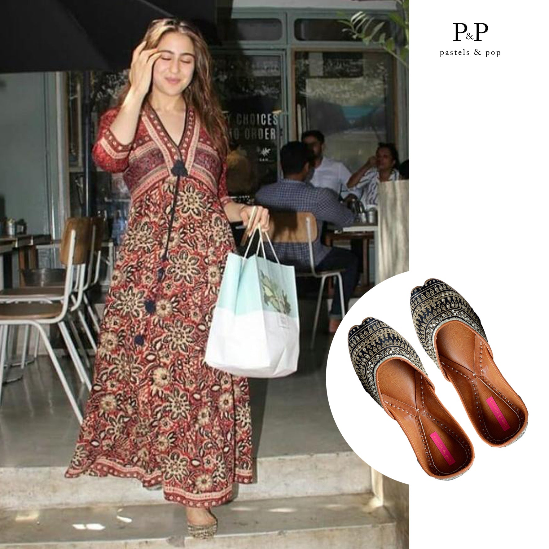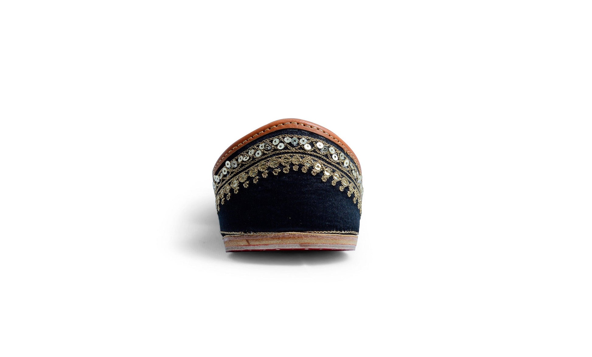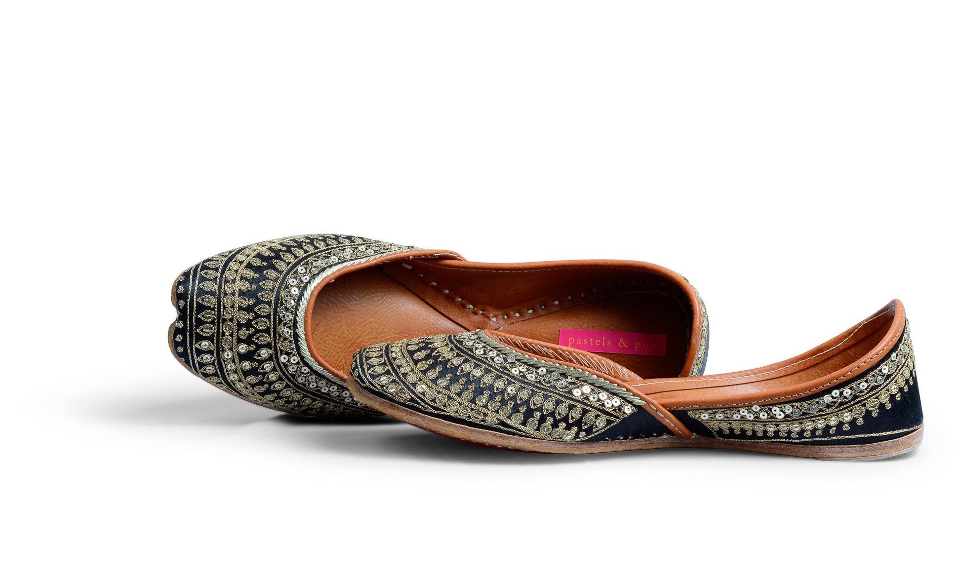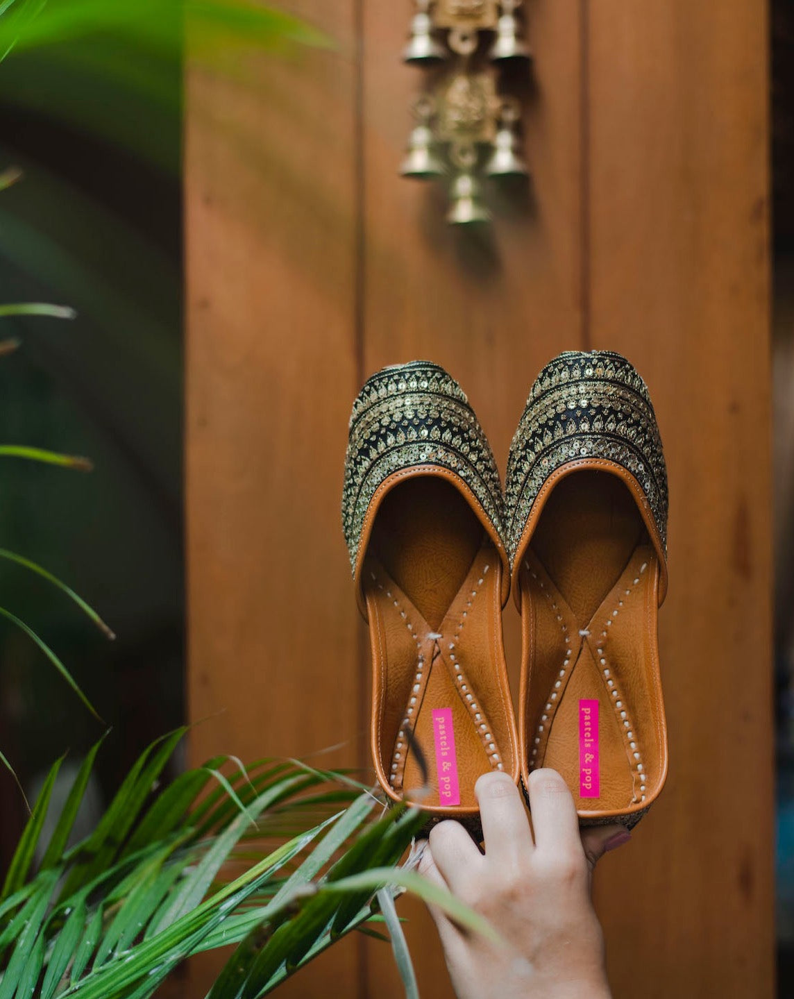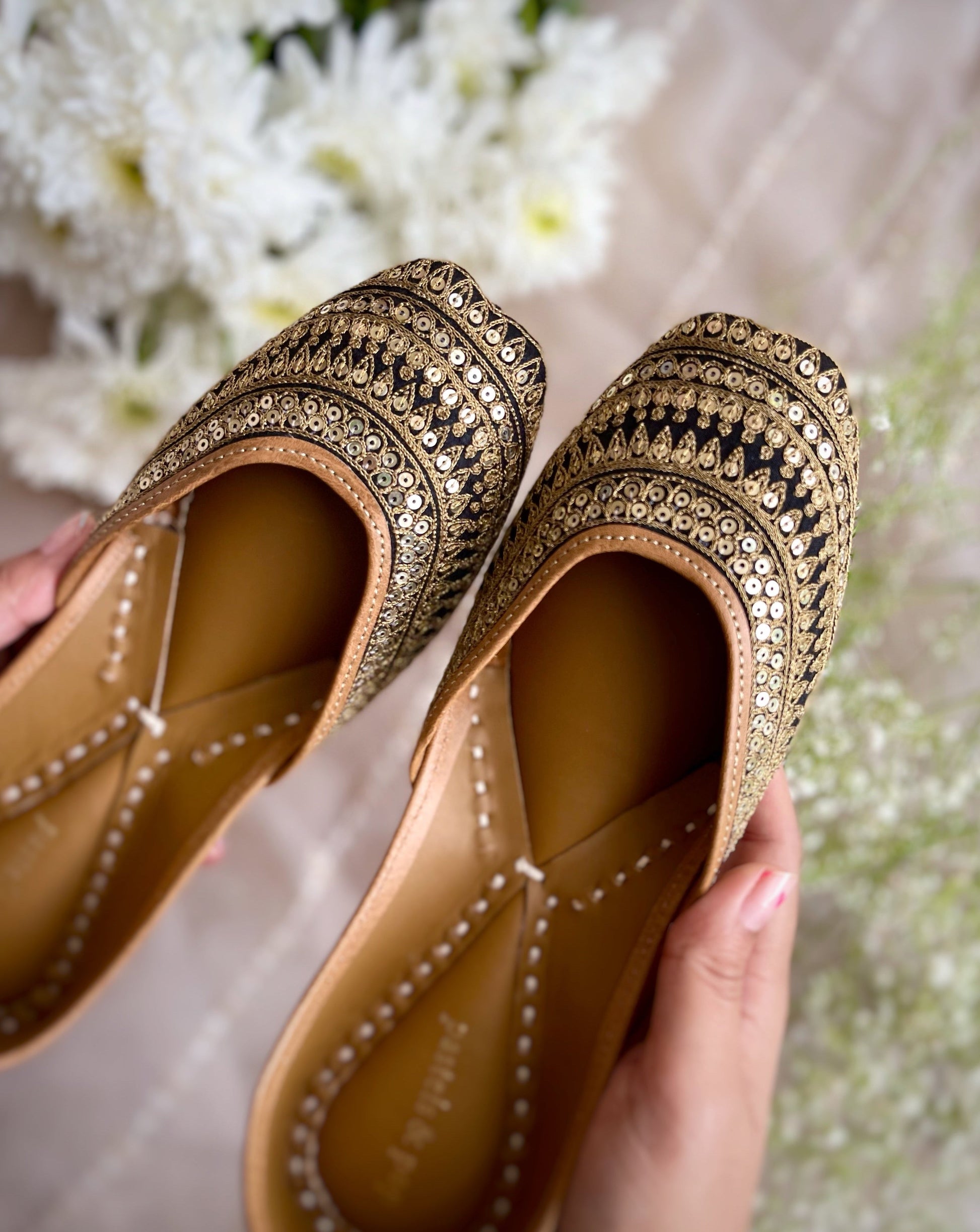 Treat yourself to the luxurious comfort and style of our Queen Black and Gold Silk Jutti. The jutti is the perfect addition to your ethnic footwear collection. Crafted with a black silk base, this stunning black jutti for girls features hand-embroidered muted gold zari in a beautiful pattern that adds a touch of royalty to your outfit. The intricate embroidery is further enhanced with gold sequins that sparkle and shine with every step you take. This beautiful combination of black and gold makes it a versatile piece that you can pair with any outfit, ethnic or Western.