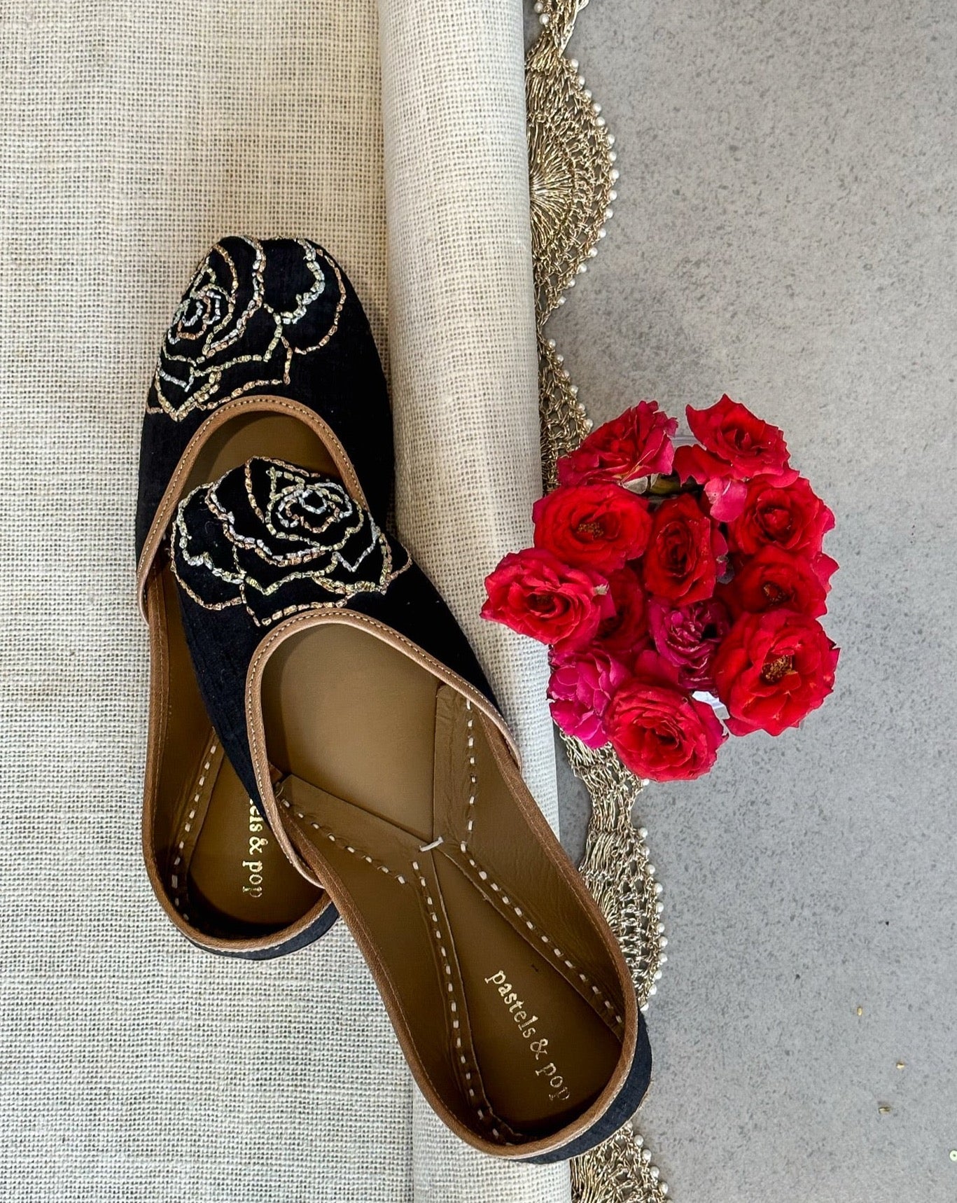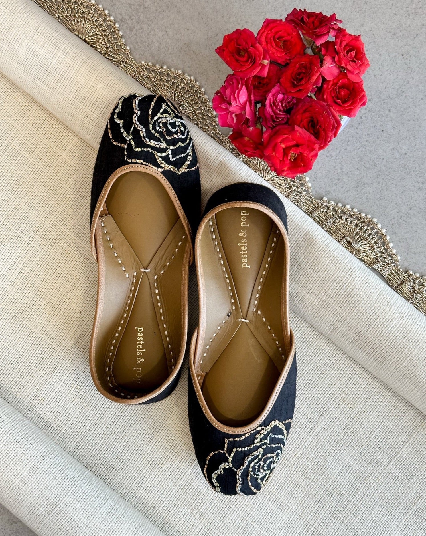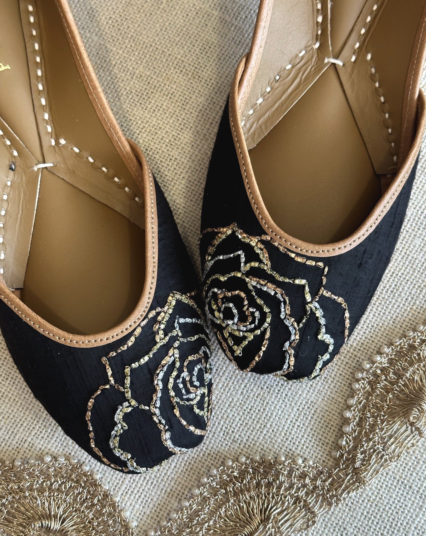 A minimalist jutti with a touch of festive! Featuring a black base, hand embroidered with a delicate rose motif fashioned out of gota work in 3 colours. A simple gradation of silver, gold and antique gold brings this rose to life with that quiet but remarkable sheen.
