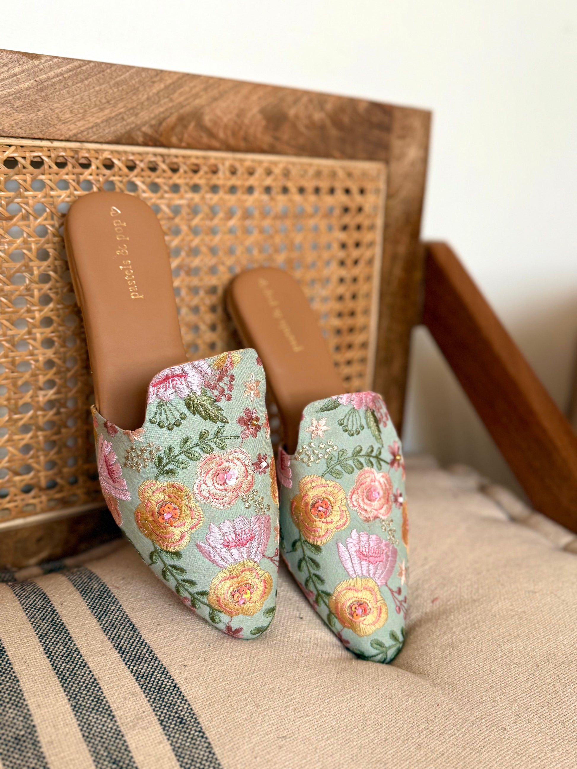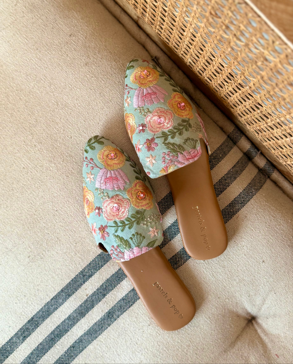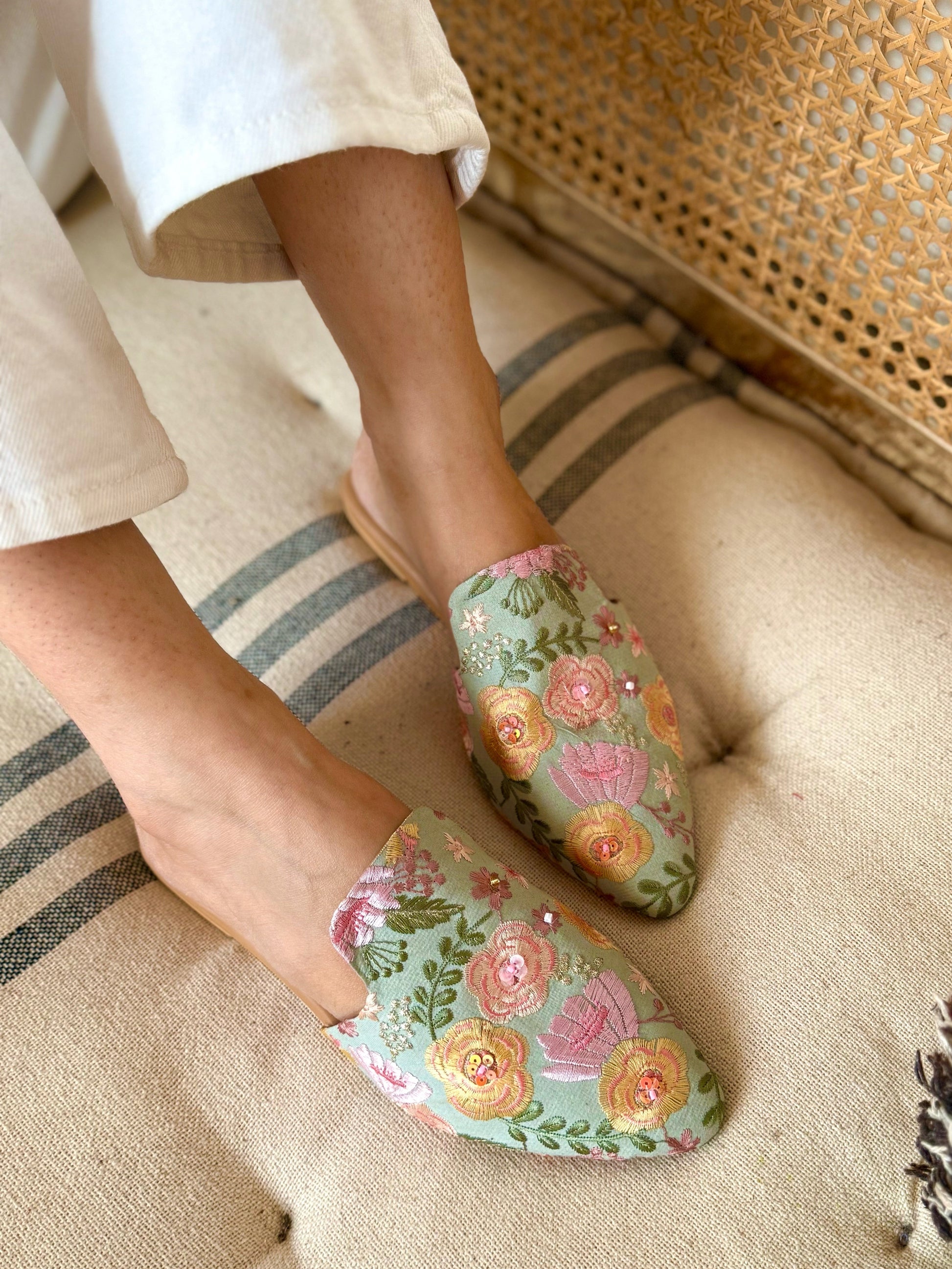 A stunning arrowhead mule crafted in a soothing sage green base, adorned with intricately hand-embroidered blossoms in vibrant hues. Featuring 10-12 shades of reshim and delicate 3D beadwork, the design brings a garden to life with every step. Completely handcrafted and double-cushioned for comfort, this versatile pair adds a subtle pop of color to both Indian and Western outfits. Perfect for long walks and special moments alike, it’s a must-have for your wardrobe.