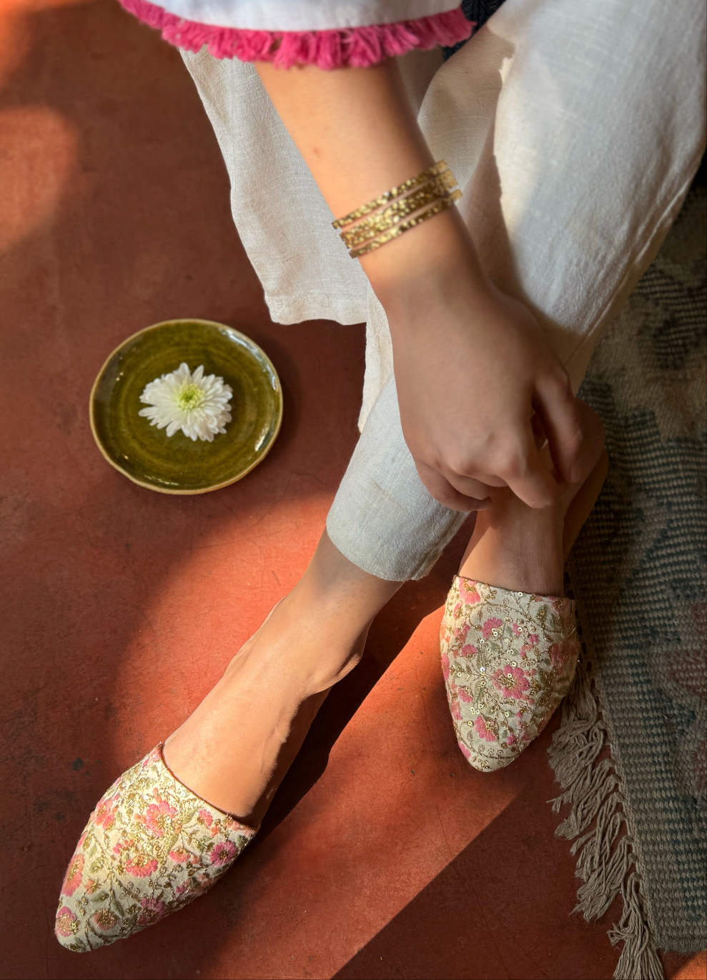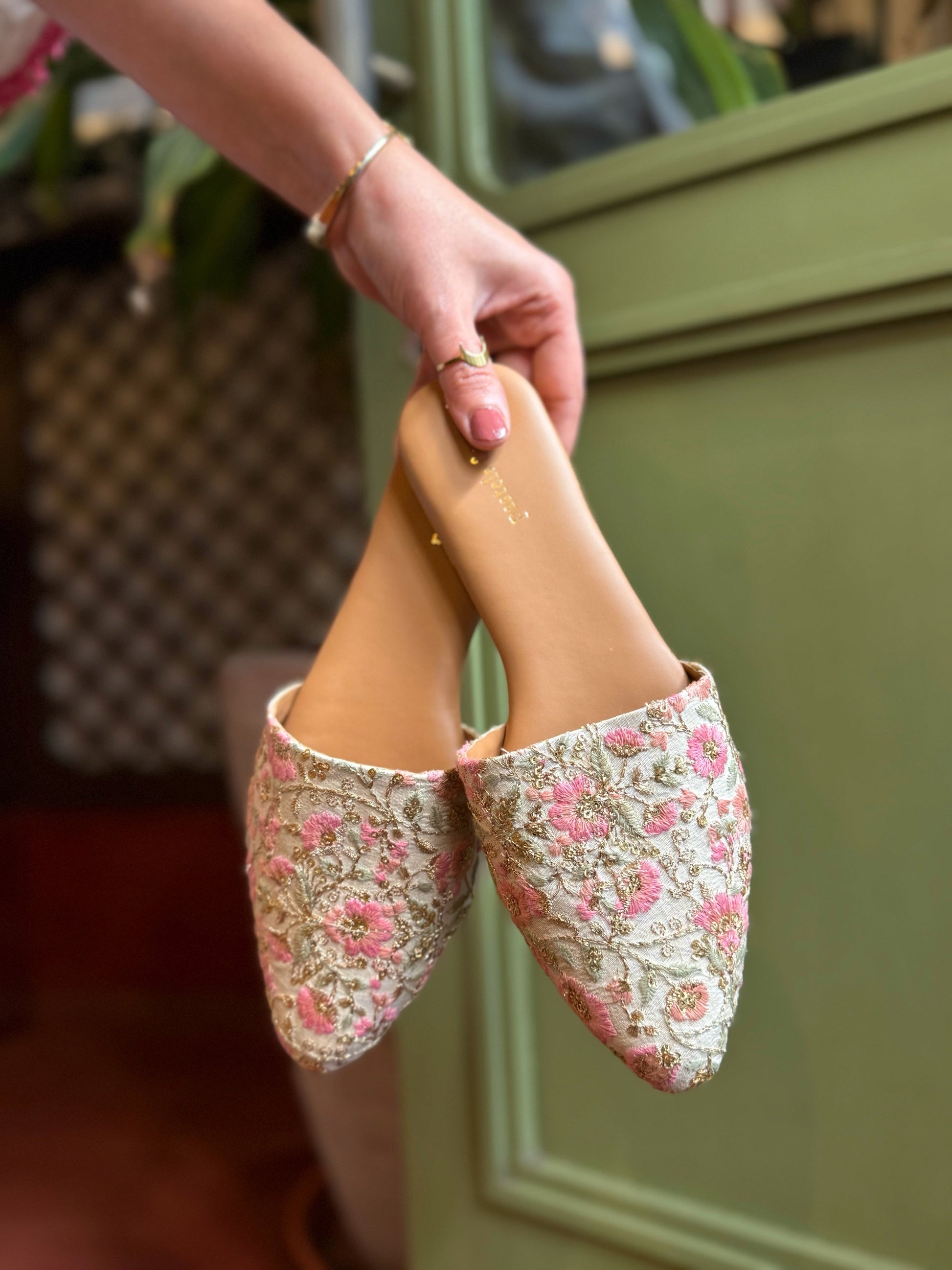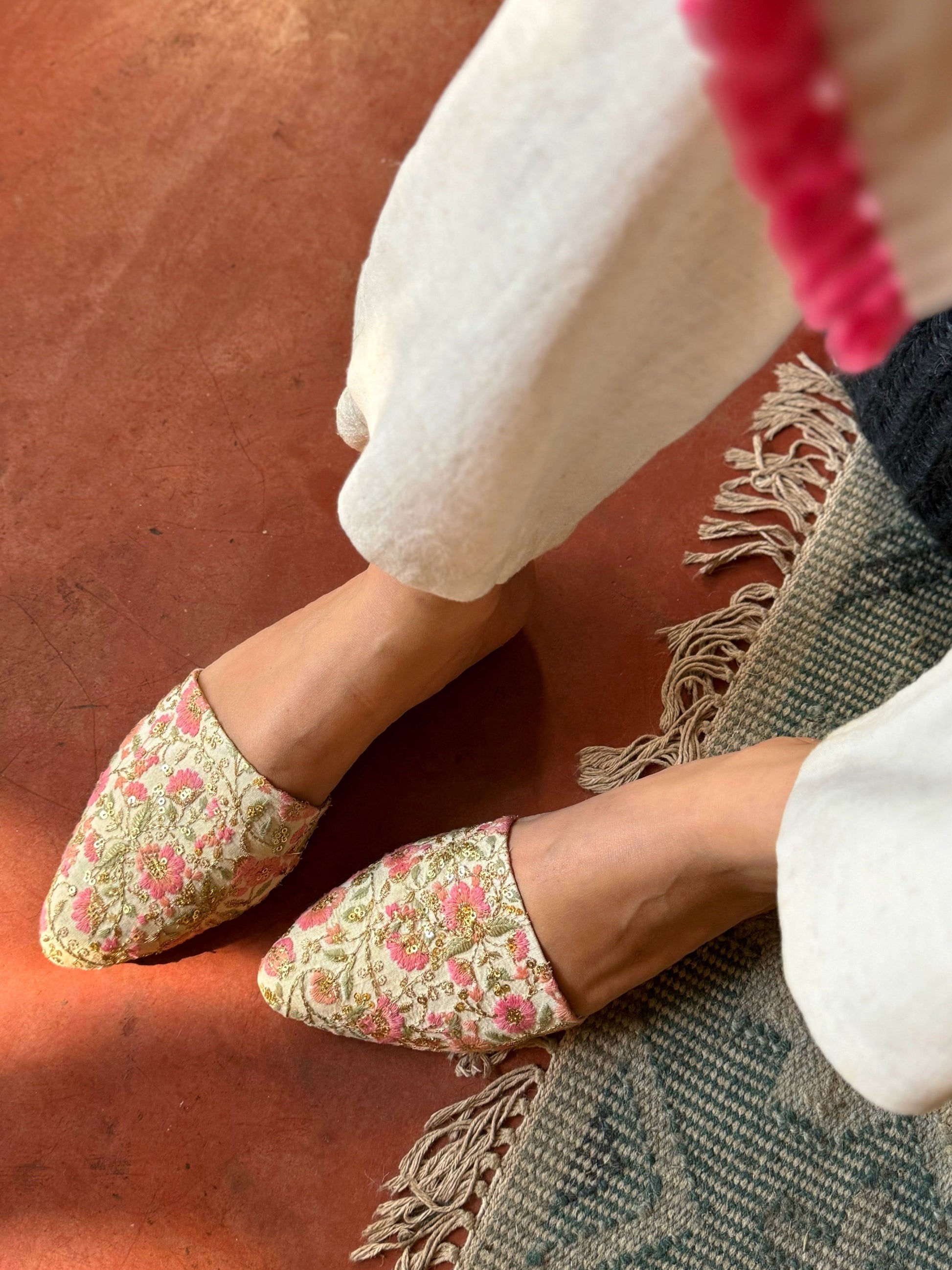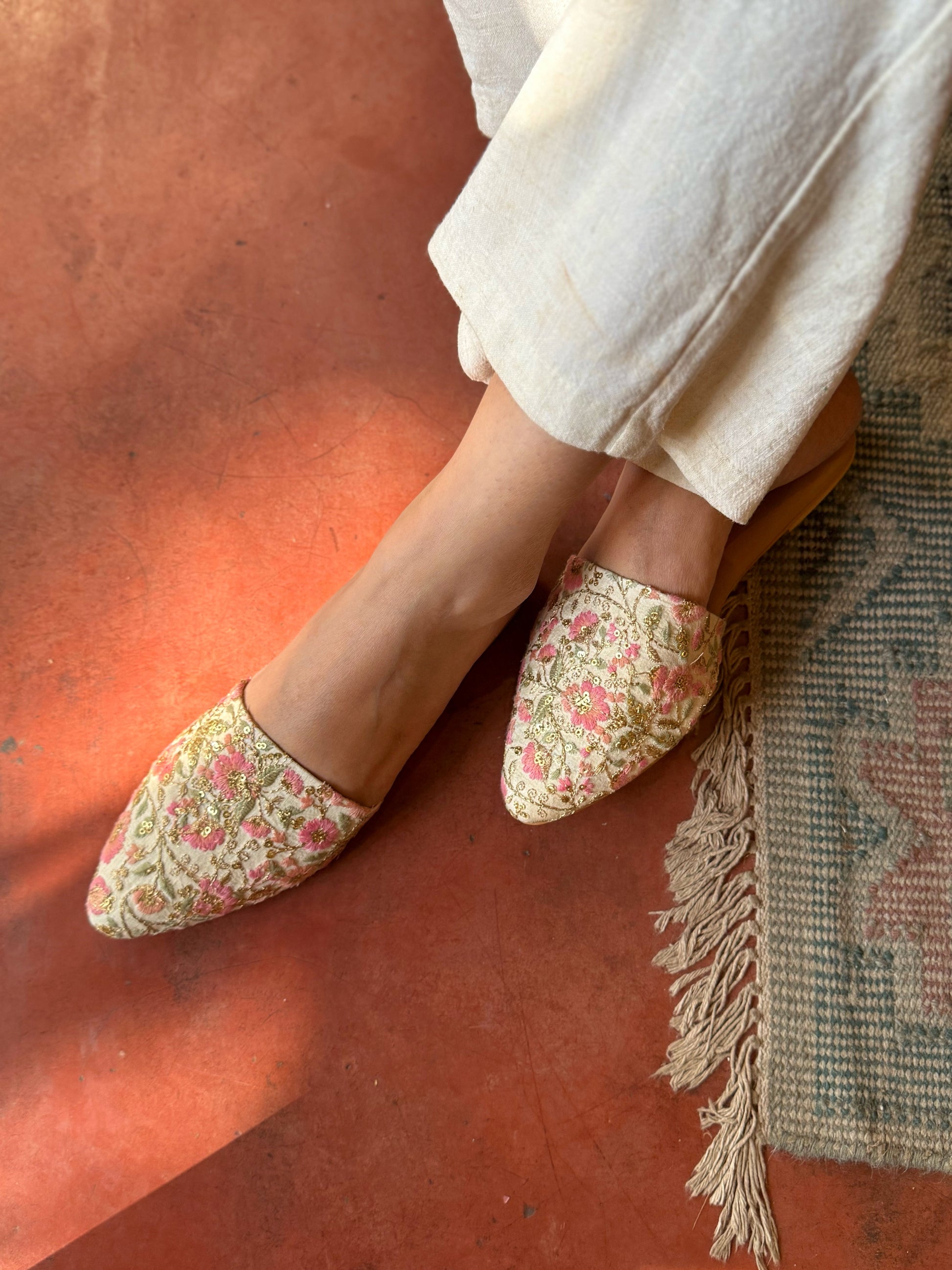 The Blossom mules are designed on an ivory base with vibrant floral embroidery in shades of pink, orange, and mint green. The zari leaves and sequins in gold make them stand out. Perfect for Indian outfits, they can easily be dressed up for special occasions or styled for an everyday elegant look.