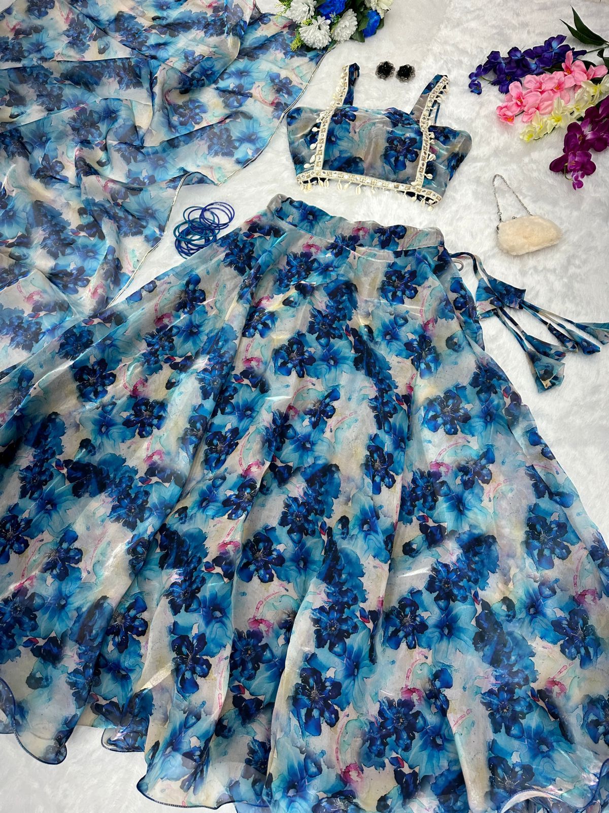 Blue Color Digital Printed Organza Silk Lehenga Choli