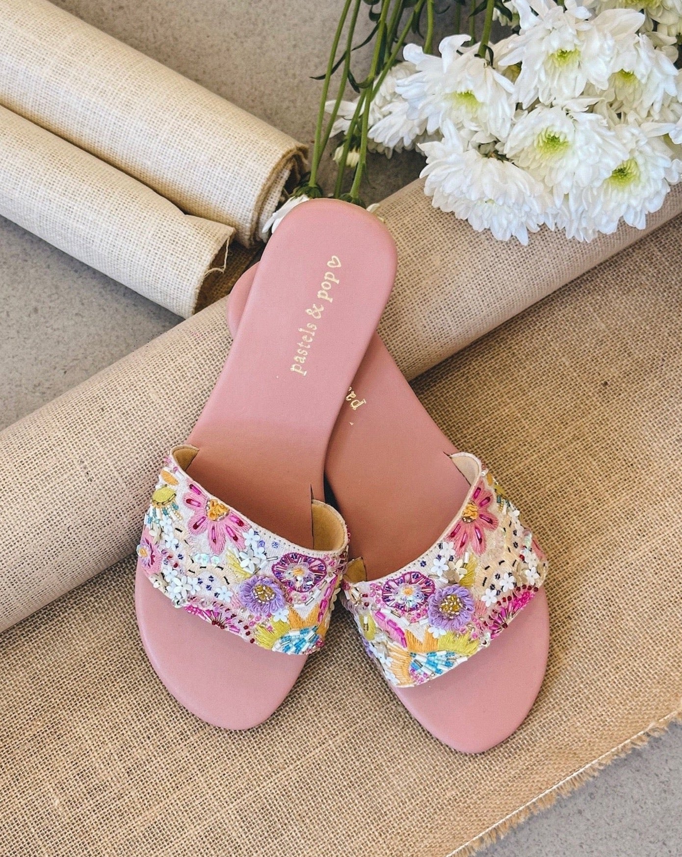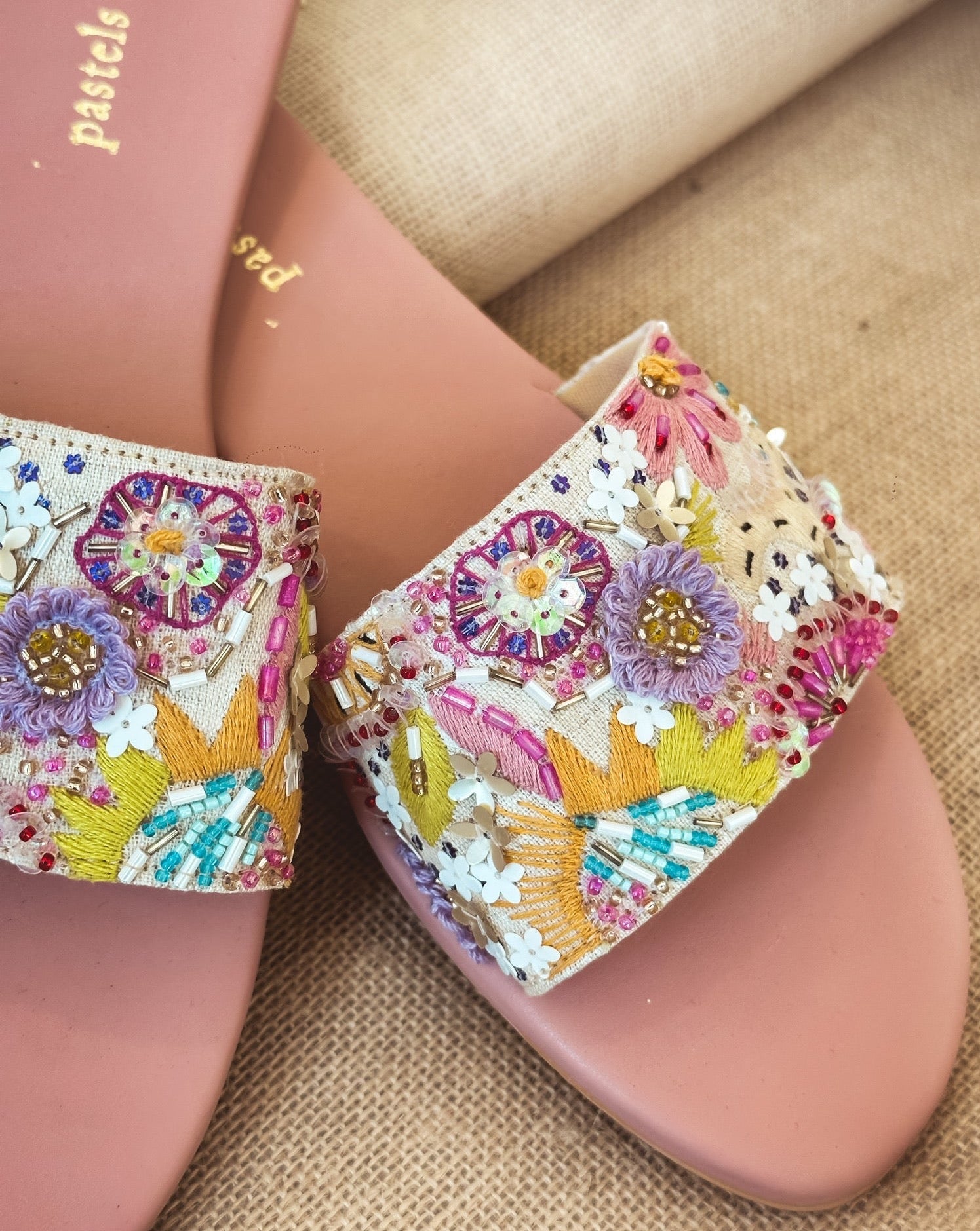 Indulge in the beauty and charm of our Daisy Sandals. 100% handcrafted with utmost care and attention to detail, this pair transports you to a world of Summer bliss! Skillfully adorned with delicate threads, shimmering hand-cut sequins, and captivating beads, Daisy is a work of art.