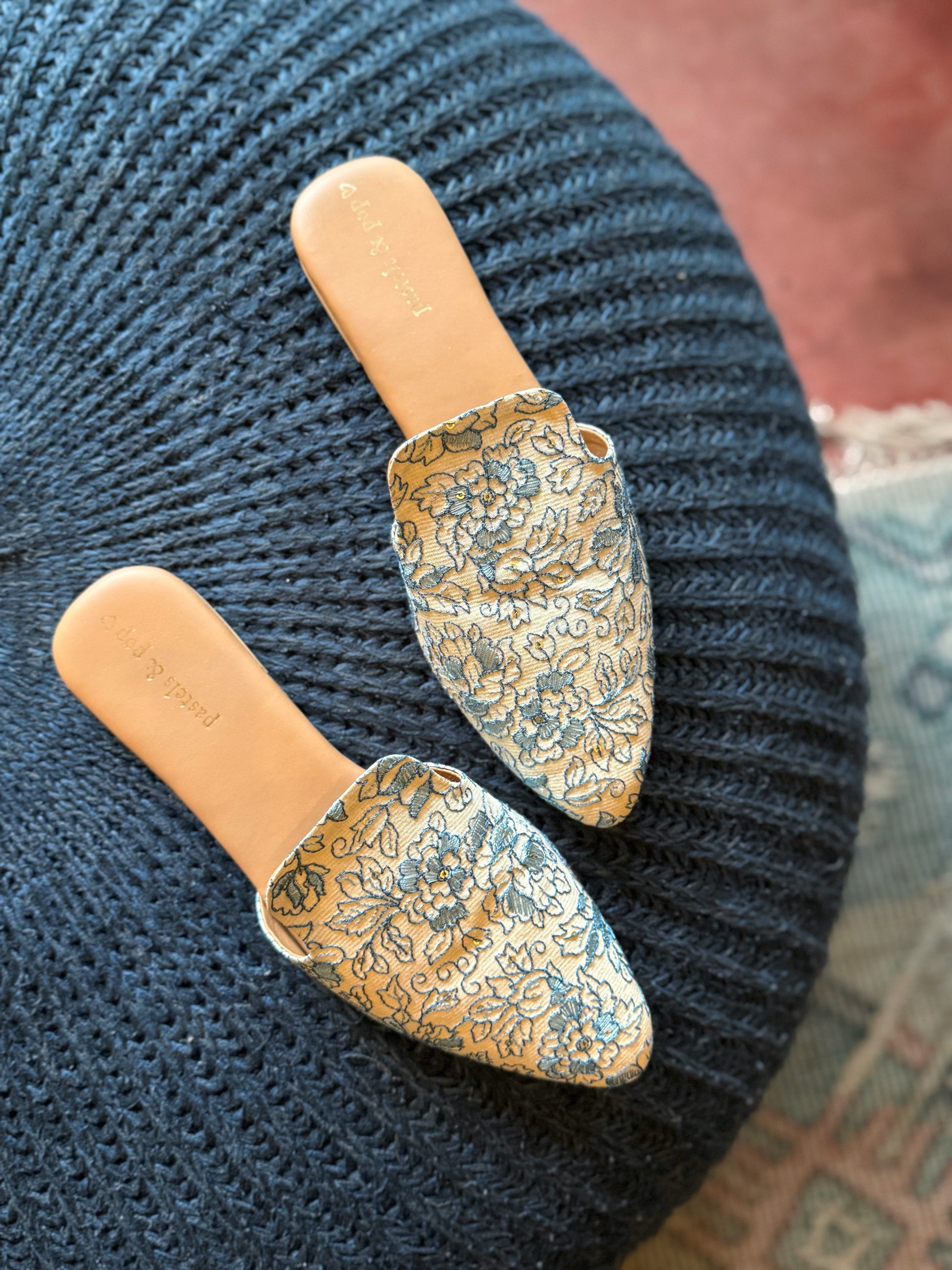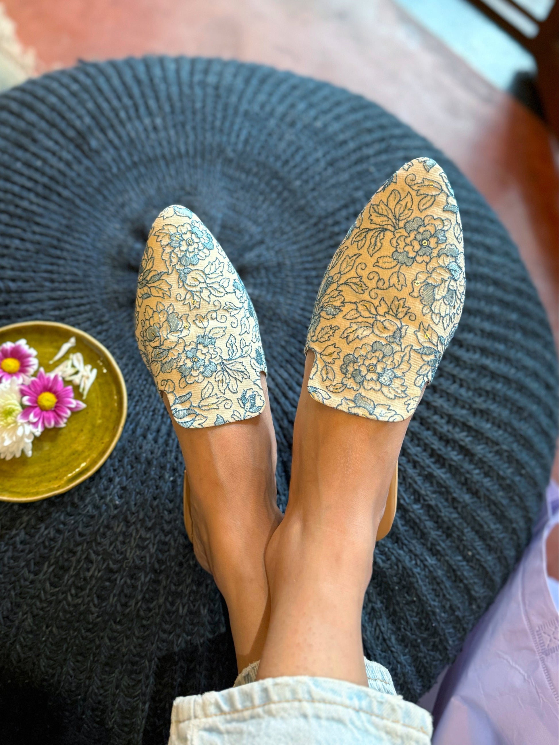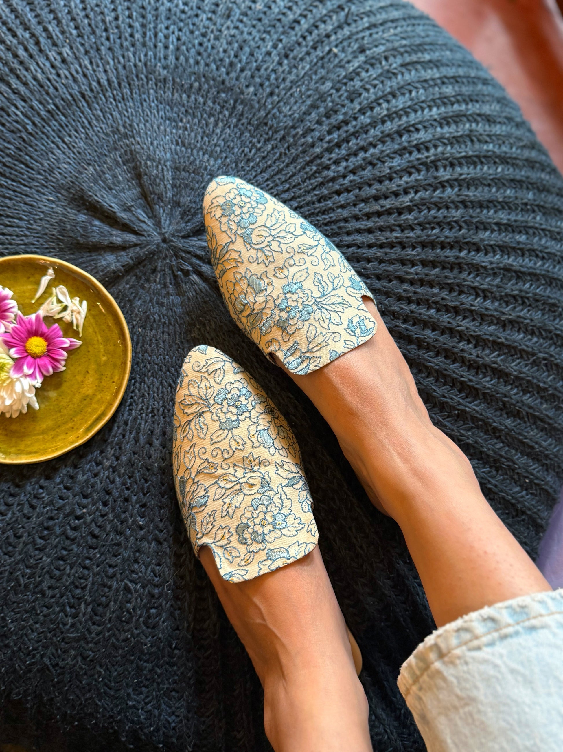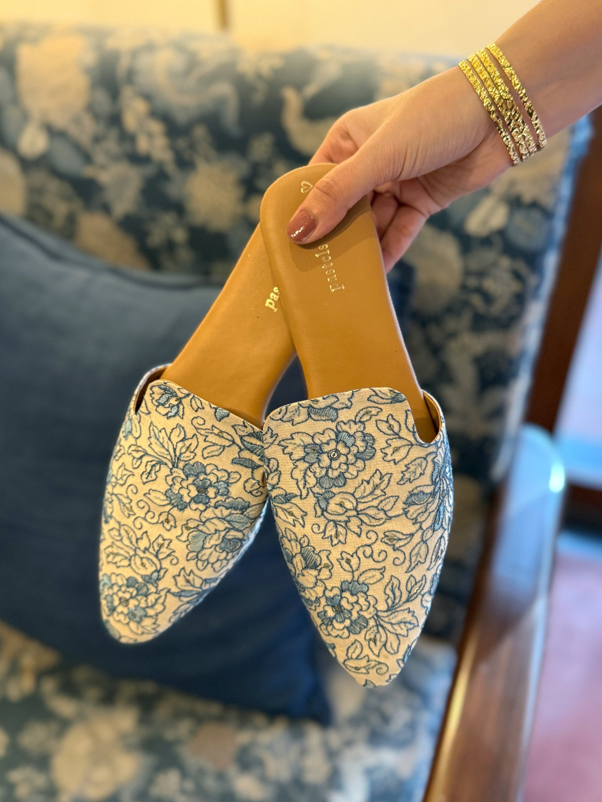 Step into elegance with our Day Dreamer mules, featuring a neutral ivory base with denim blue embroidery and subtle sequin accents. Their arrowhead design pairs effortlessly with denim dresses, everyday jeans, or office wear. Comfortable and versatile, they're the perfect addition to your wardrobe!
