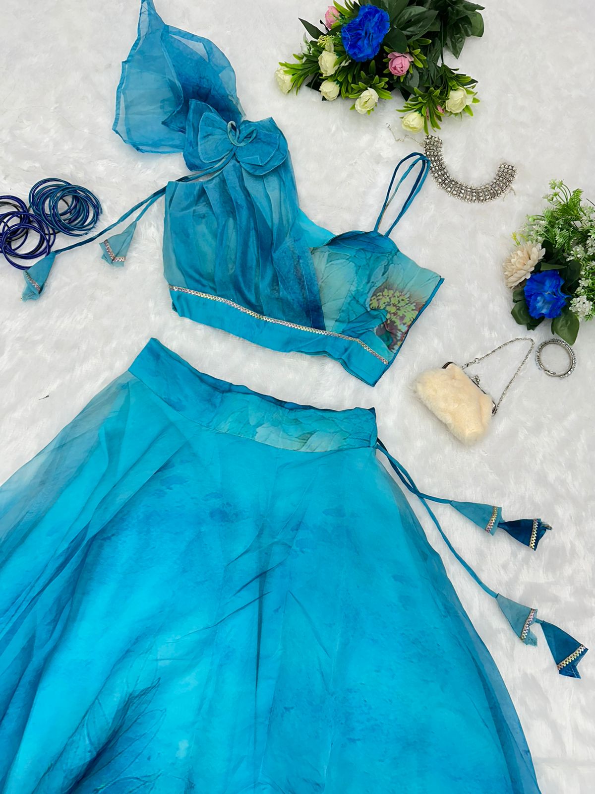 Fabric Pure Organza Silk Work Digital Printed Type Fully stitched Size Free Size Flair 8 Meter Lehnga With Canvas Patta Choli Fabric Pure Organza Silk Type Fully stitched Size Size 38 Padded Blouse ( Margin Given) Occasion Party Wear, Ceremony Wear Product Care Instructions Dry Clean Only