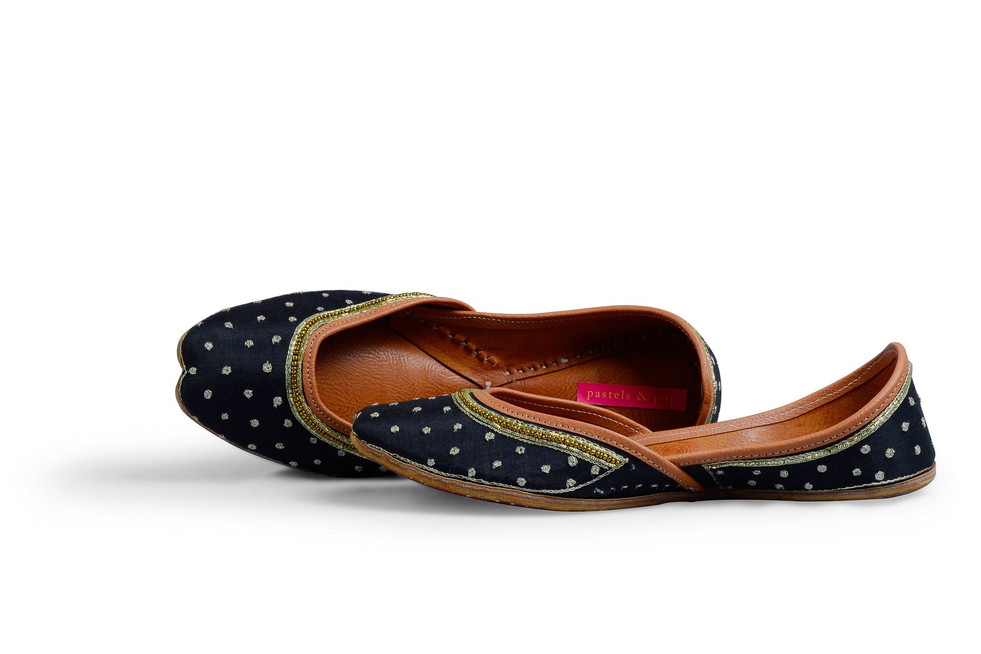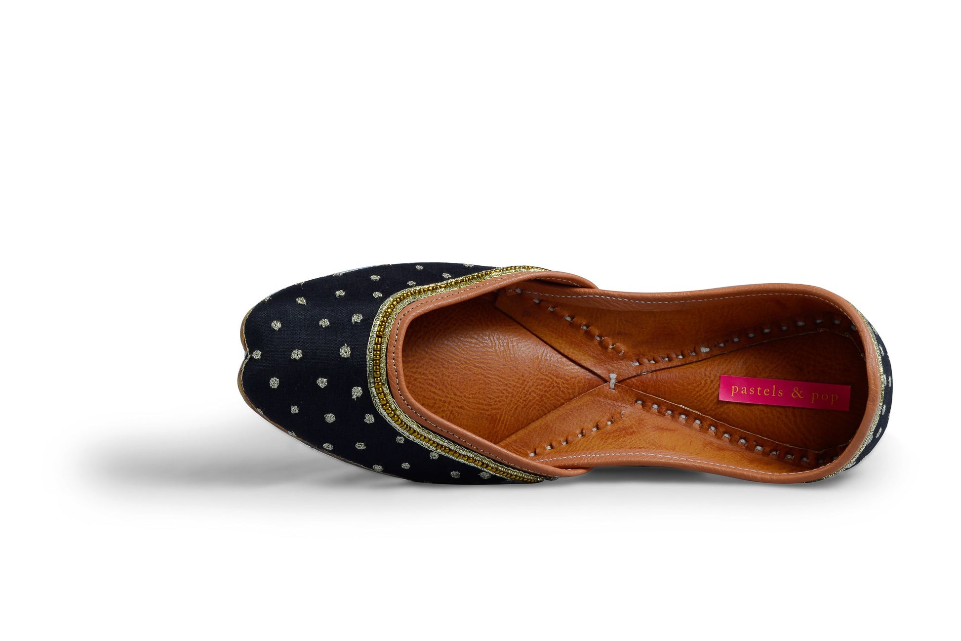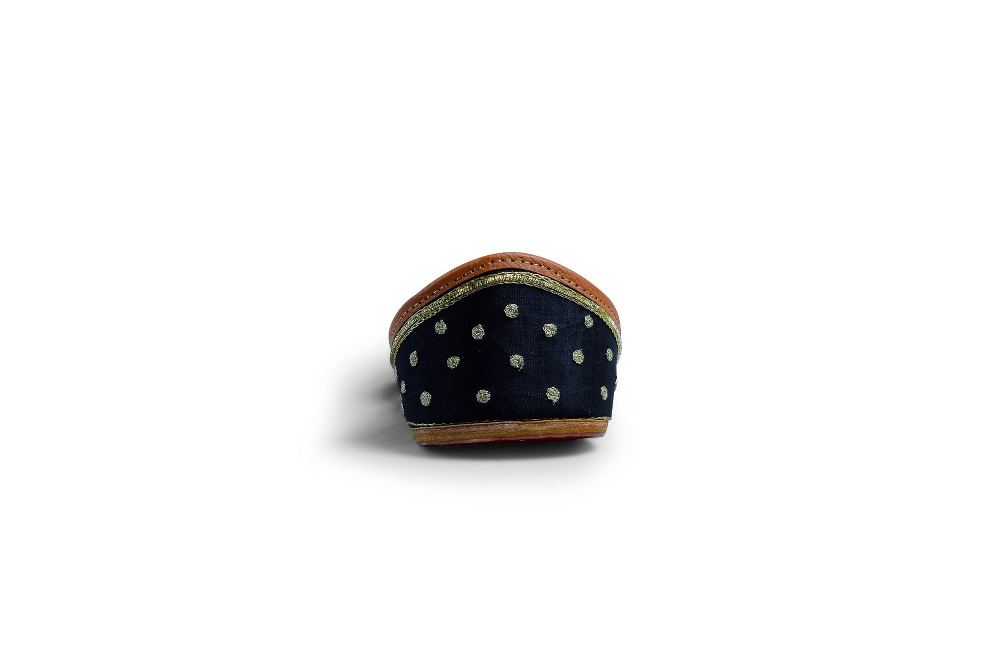 Black base with gold zari dots embroidered all over the jutti finished with zari and gold beads along the neckline. Elegant and stylish, this one's a keeper!