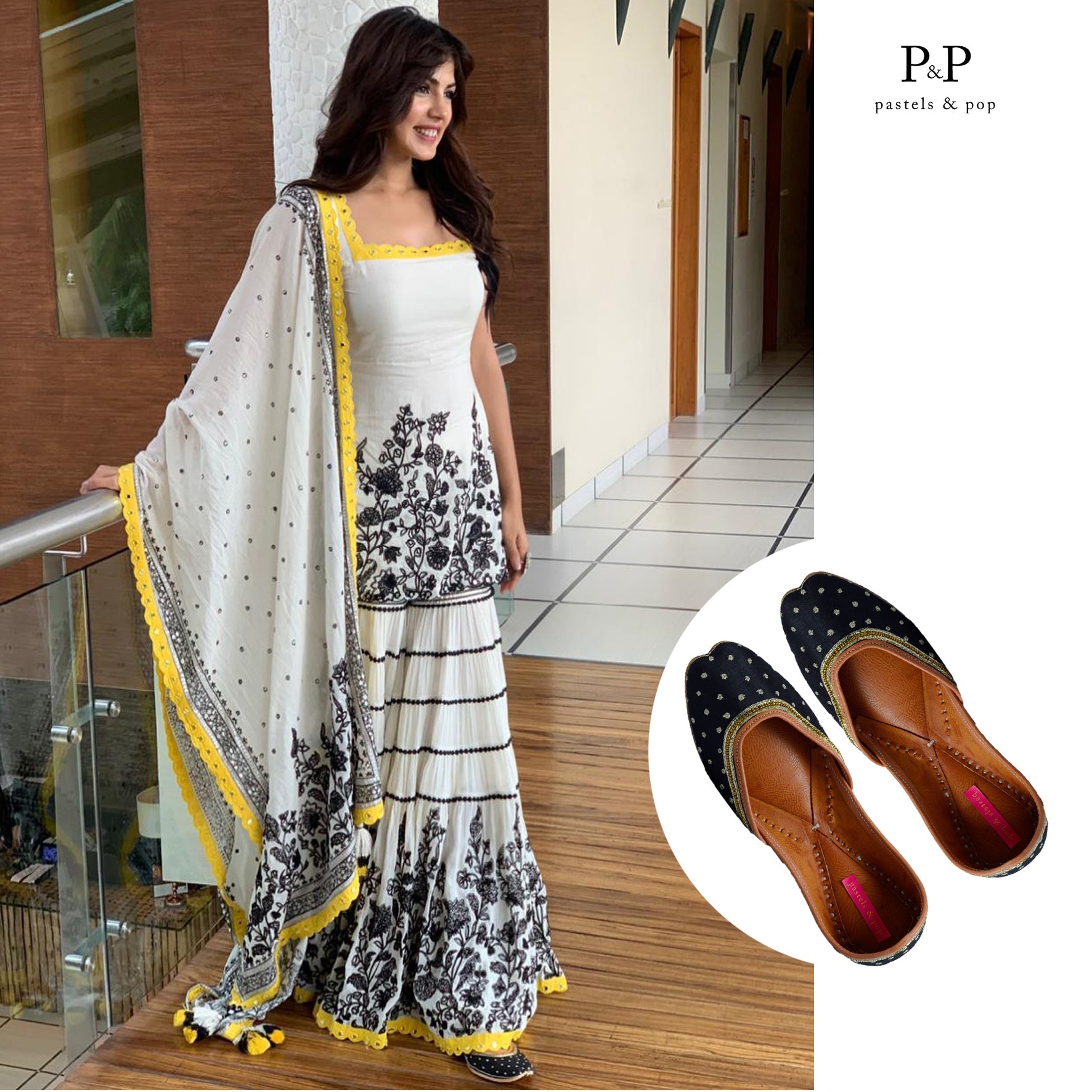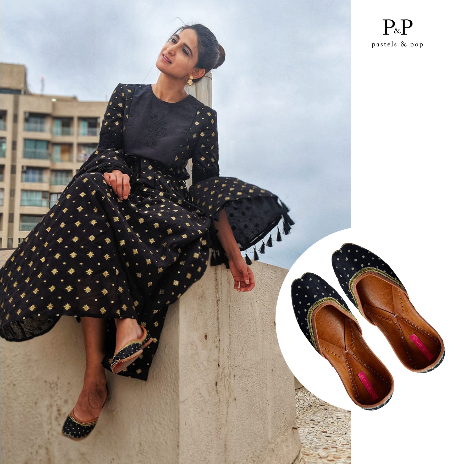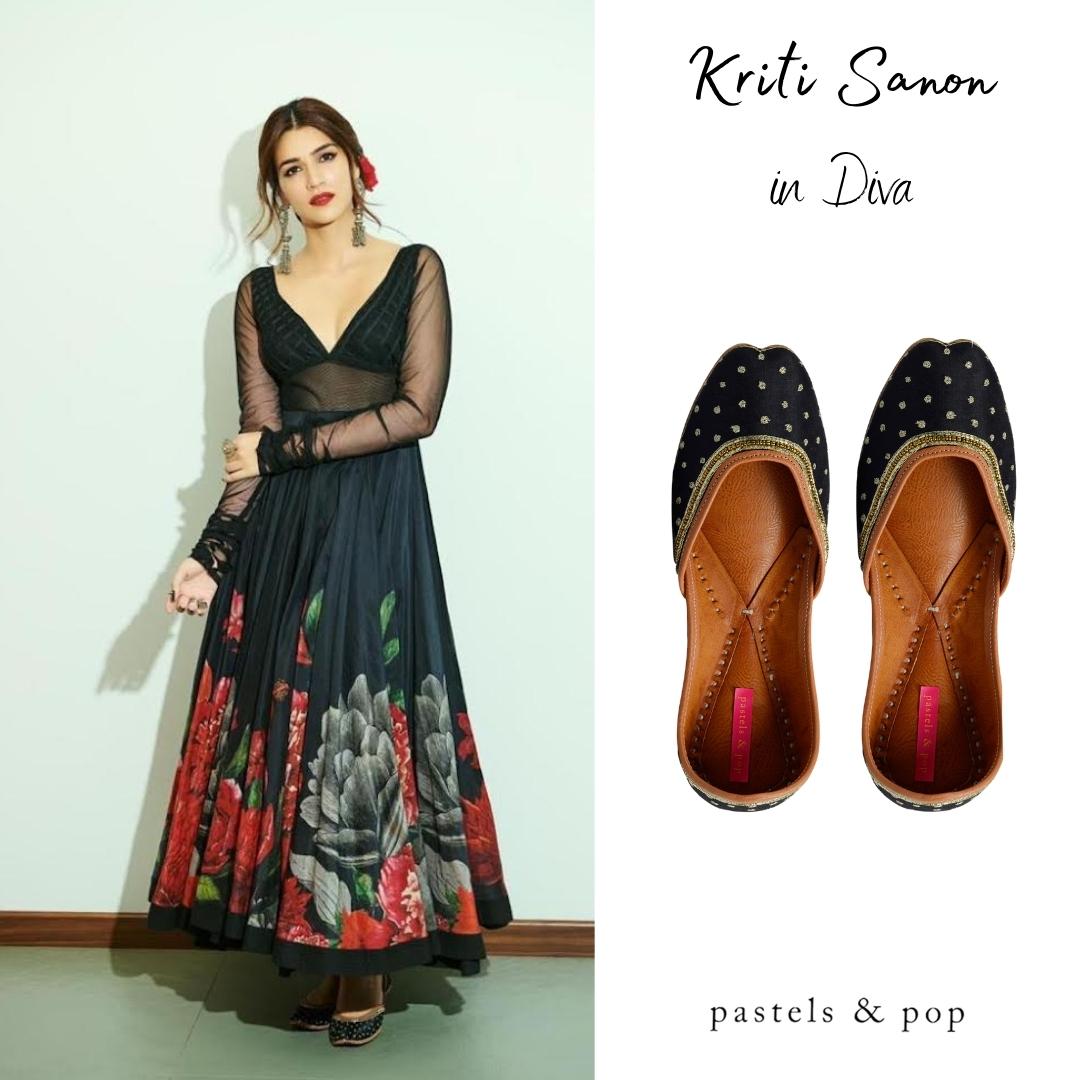 Black base with gold zari dots embroidered all over the jutti finished with zari and gold beads along the neckline. Elegant and stylish, this one's a keeper!