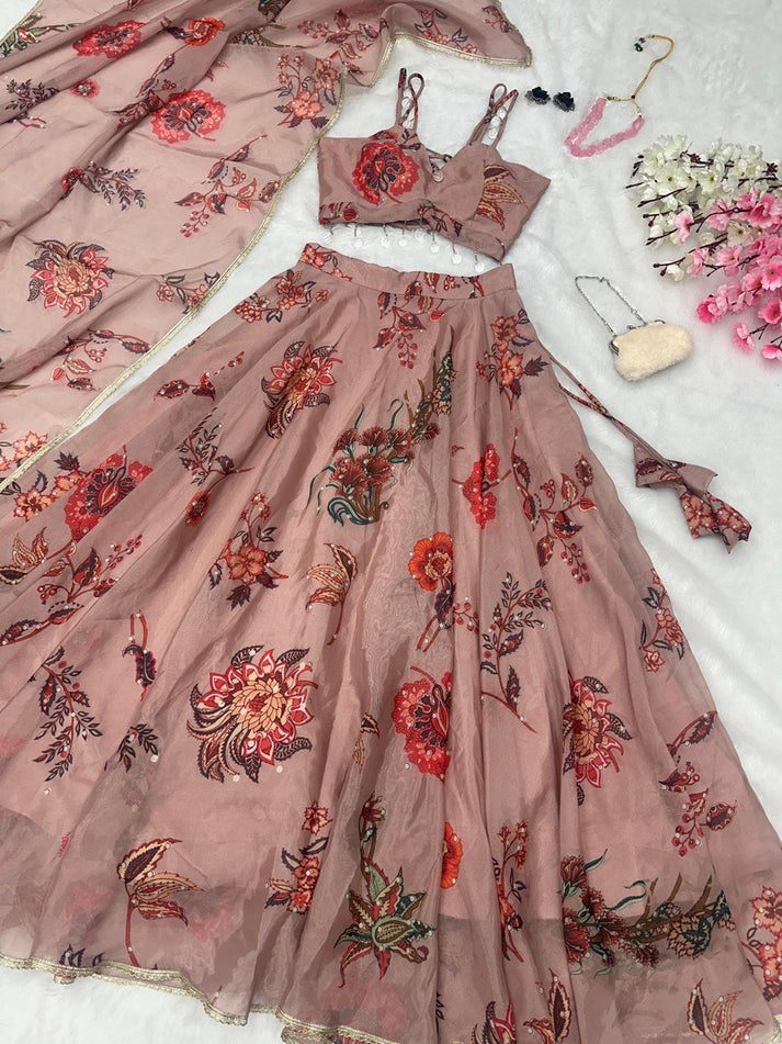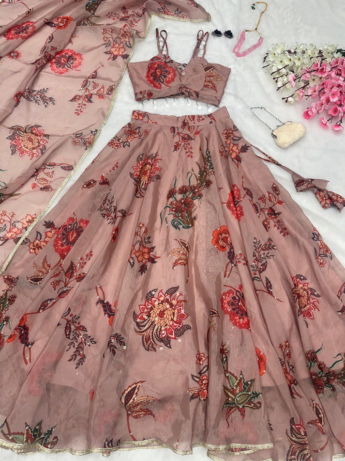 Dusty Pink Organza Silk Floral Printed Lehenga Choli
