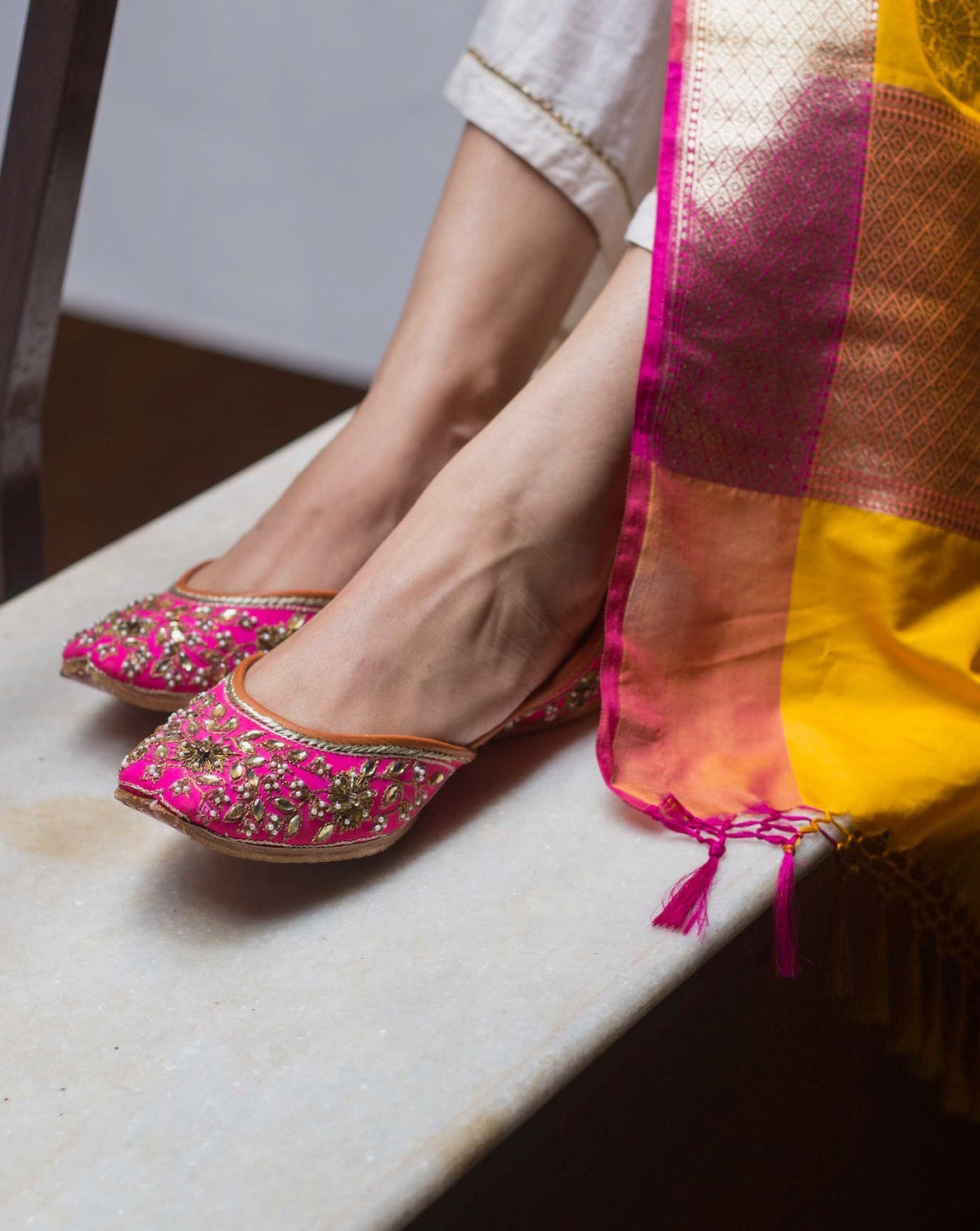 Gorgeous fuchsia silk base with intricate hand-embroidery in zari, pearls bugle beads and kundan. Pair it with a fuchsia outfit for color on color look or with neutral colors to add a pop to your look! It's a festive season fav!
