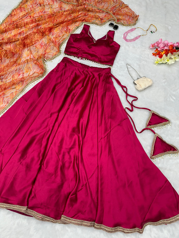 Fabric Pure Satin Silk Lehnga Work Plain Type Fully stitched Length 42" Size Free Size Flair 8 Meter Flair Lehnga With Canvas Patta Choli Fabric / Work Pure Satin Silk Blouse Type Fully stitched Size Size 38 Padded Blouse (Margin Given) Dupatta Fabric Imported Net Dupatta With Lace Border Size 2 Meter Occasion Party Wear, Ceremony Wear Care Instructions Dry Clean Only