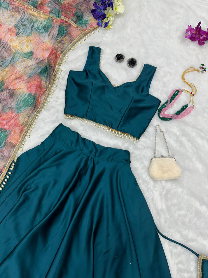 Fancy Satin Silk Teal Blue Lehenga Choli With Net Dupatta