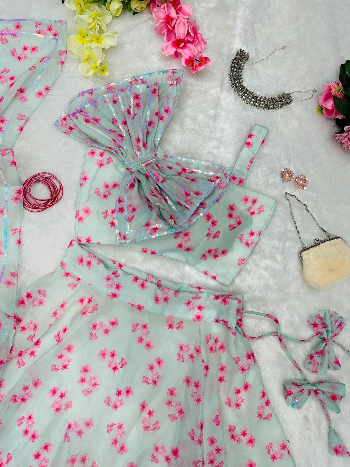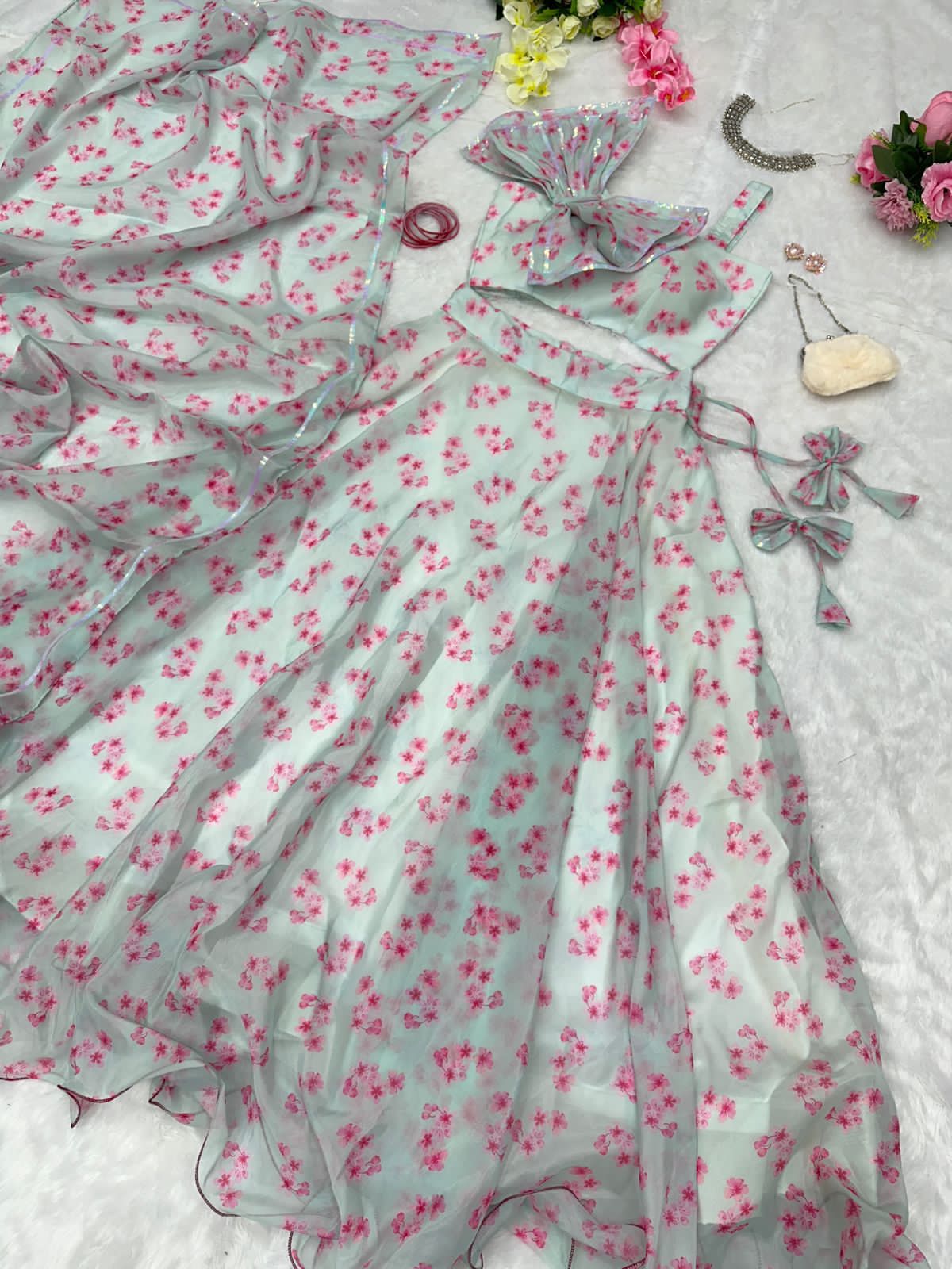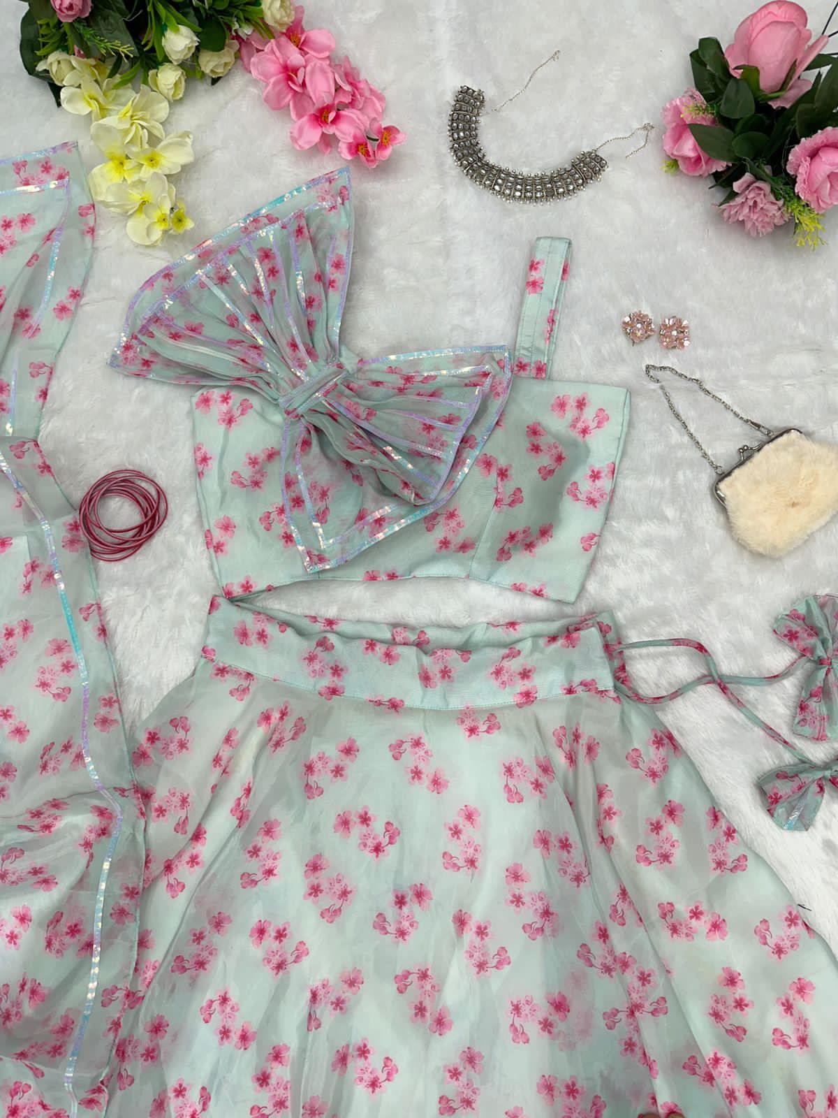 Fashionable Organza Sky Blue Color Lehenga With Blouse
