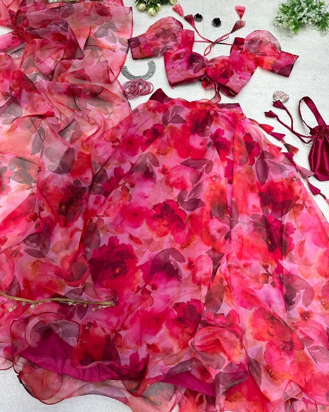 Floral Printed Red Color Organza Silk Lehenga Choli
