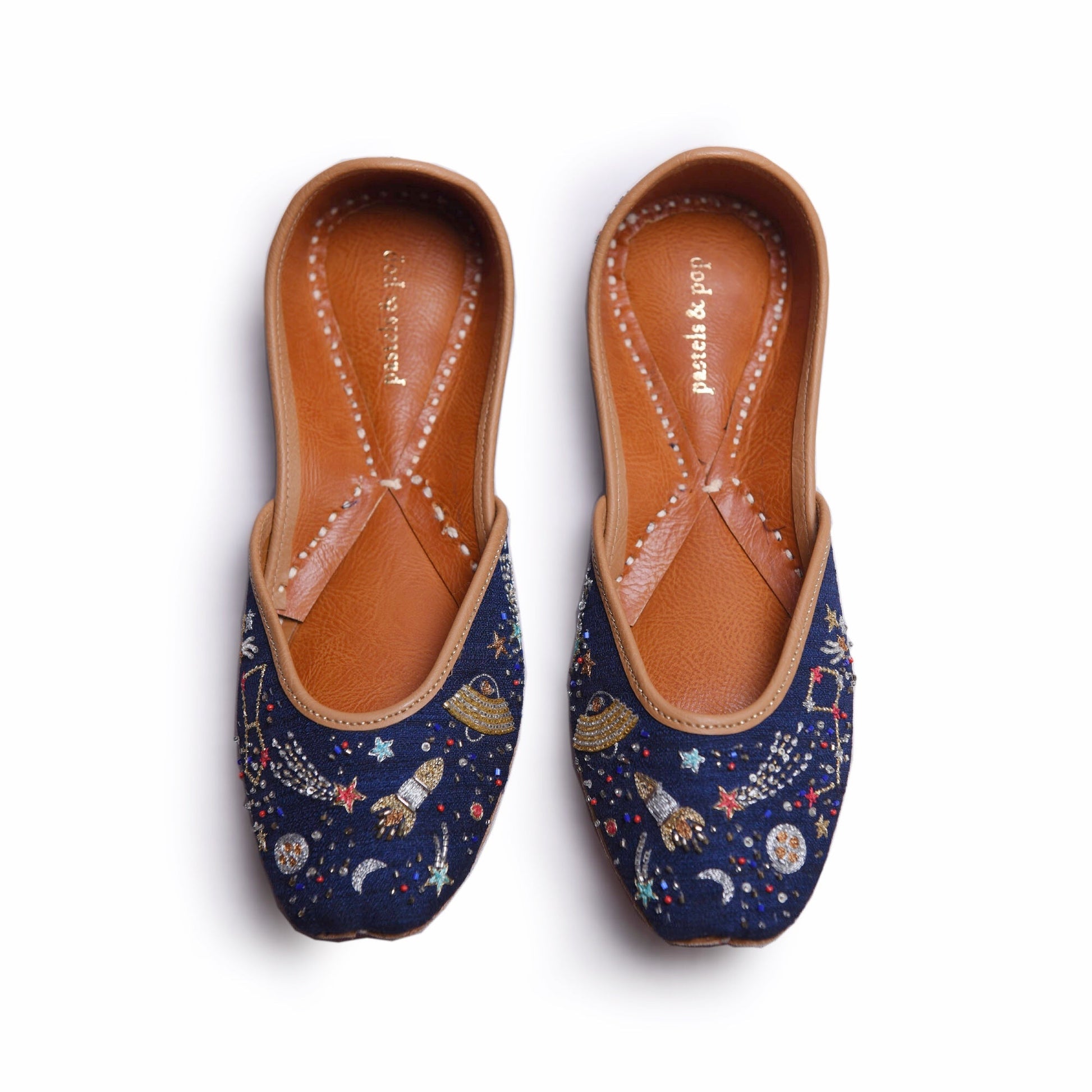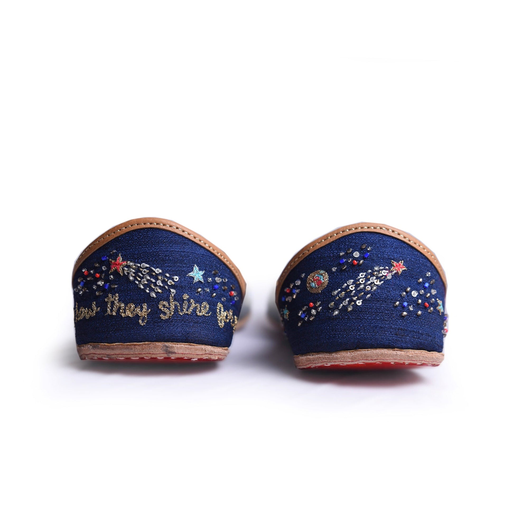 Introducing Galaxy. This Jutti condenses the entire galaxy at your feet! Shooting stars, constellations, planets, the moon, rockets and spaceships - a snapshot of the heavens embroidered onto a night blue base in shiny threads and sequins, finished with glass beads for the twinkle. The back proclaims ‘look how they shine for you’, reminding you of your special, unique place in the universe.