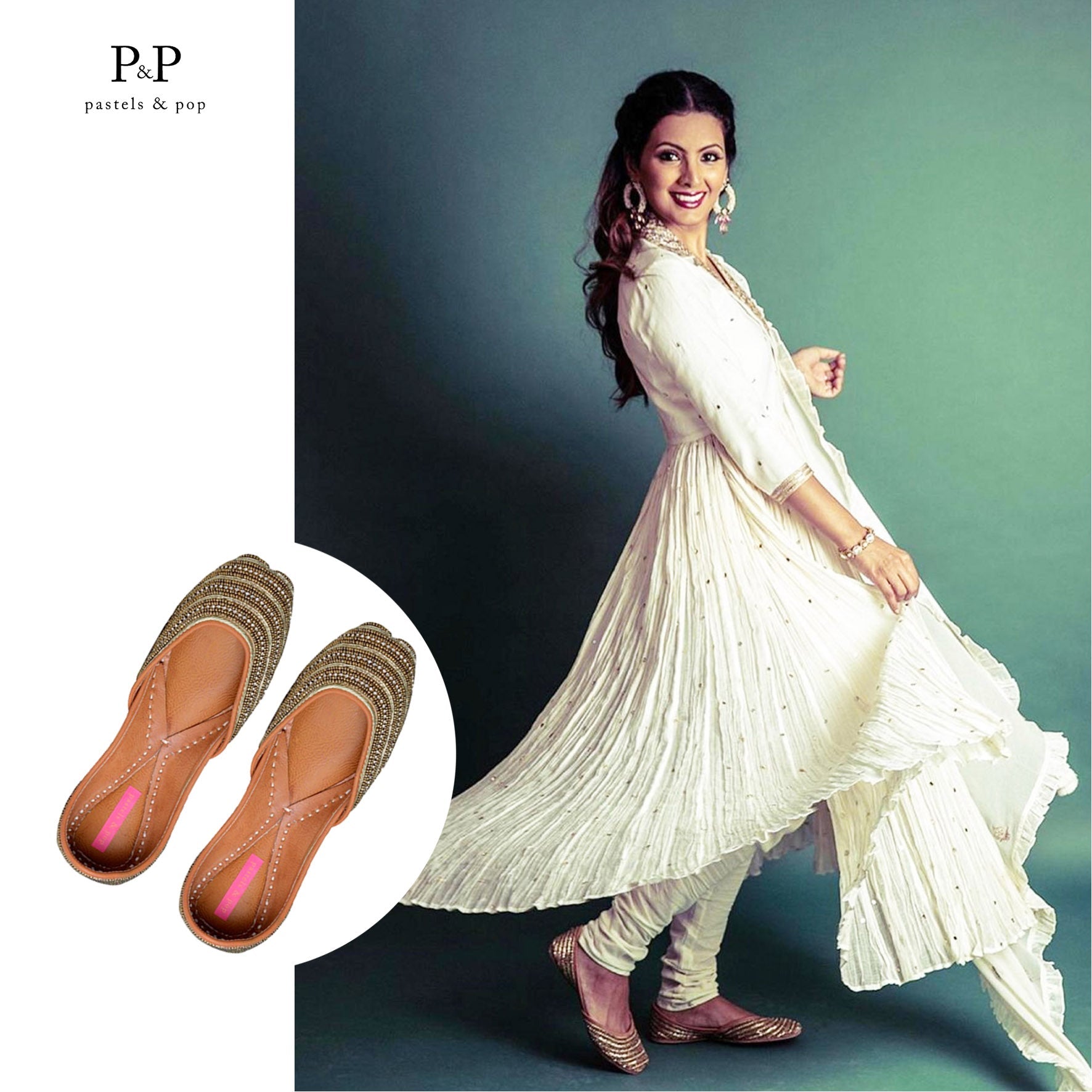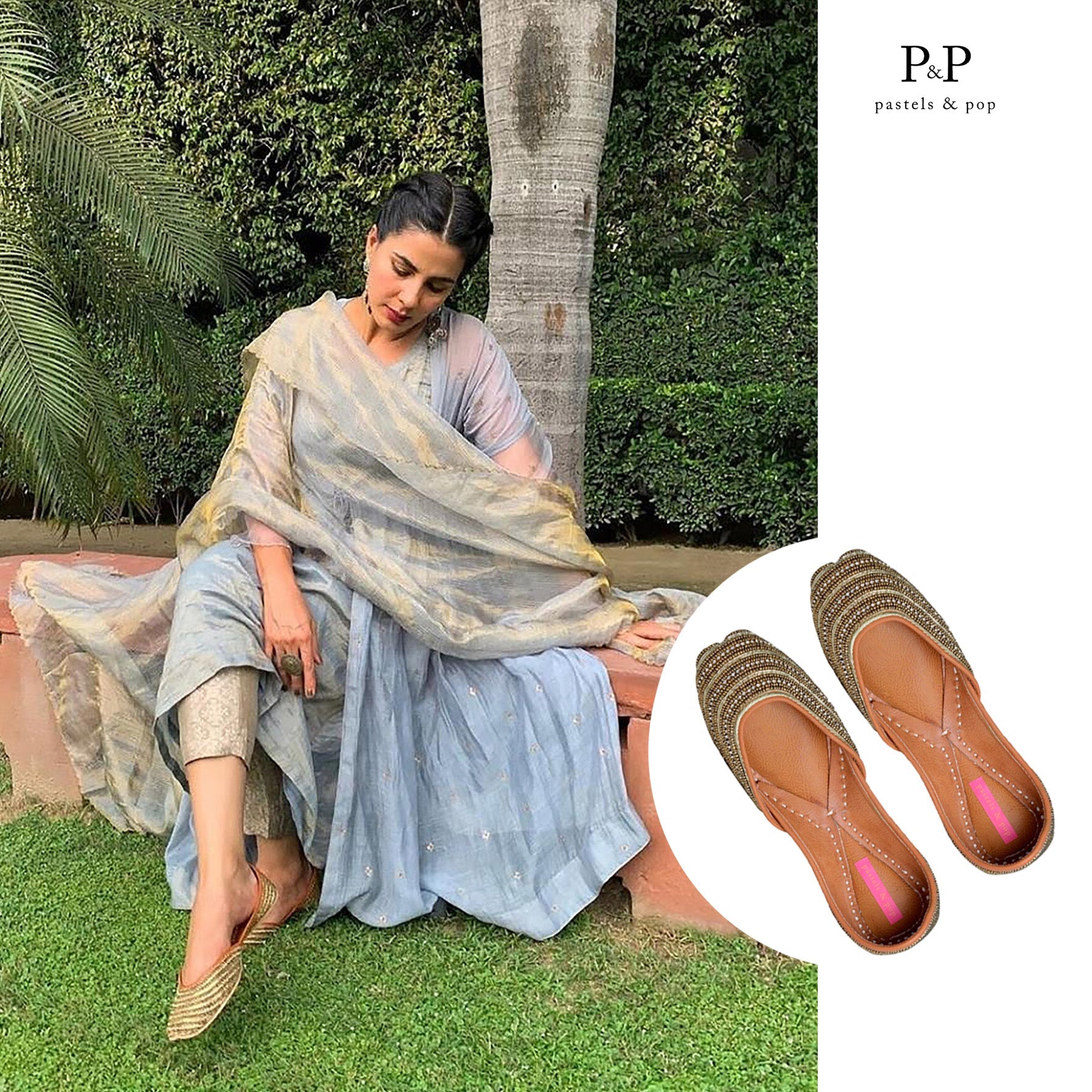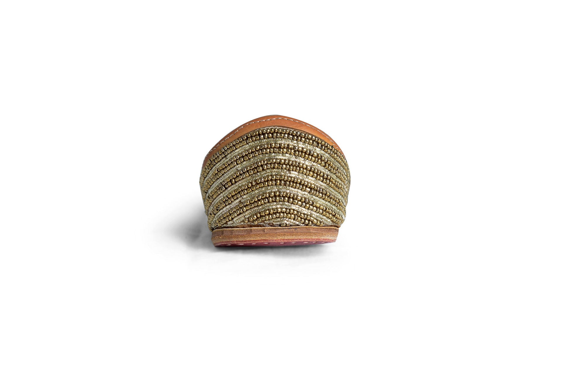 Looking for that perfect tone of gold that's not too bling? Look no further! Embellished with antique gold beads, rhinestones and zari, this jutti with its not-so-bright gold look is everything you need!