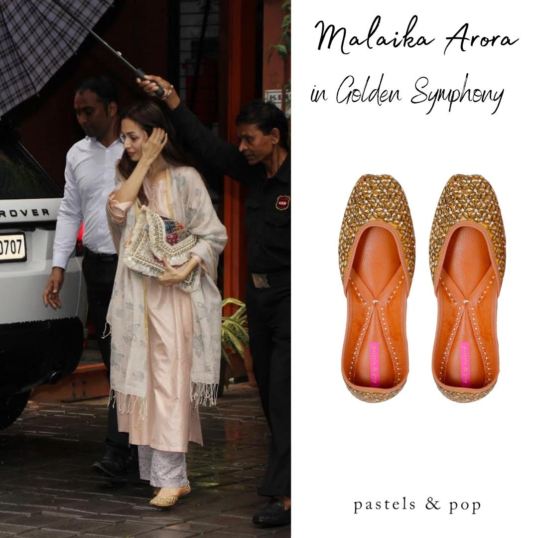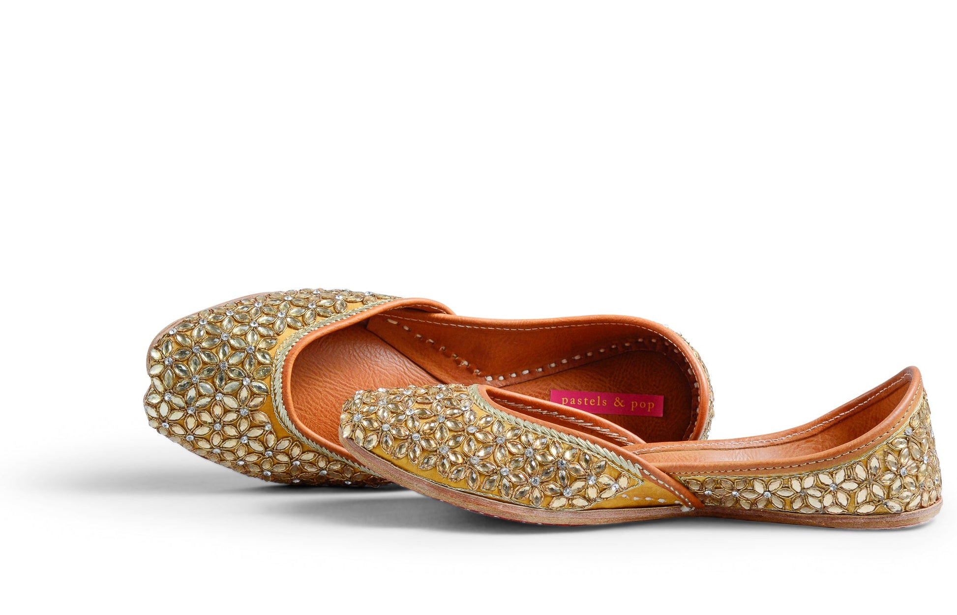 Our Sparkling Golden Symphony Jutti is the most-loved golden pair in our collection. The pictures do not do justice to the sheer beauty of this jutti. This pair of golden juttis for ladies is a must-have addition to your wardrobe if you're looking to add a touch of glam to your attire. Crafted with pure raw silk, this jutti features intricate hand embroidery, which is heavily embellished with gold kundan and crystals. Not only does it add a touch of glam to your look, but it also offers unmatched comfort with its double padded sole and vegetable tanned leather.