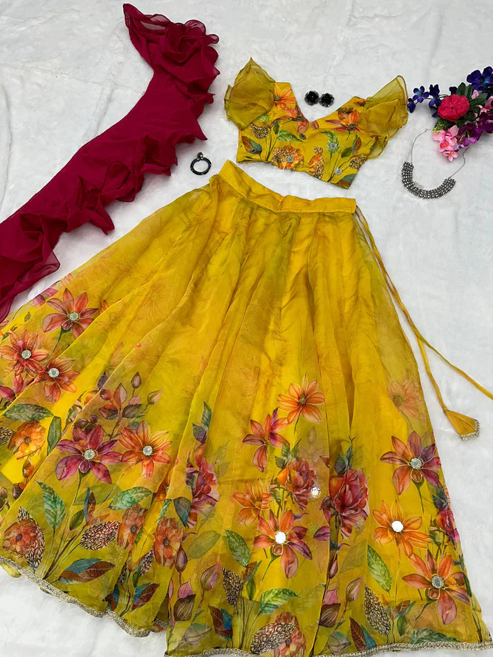 Work | Floral Printed Kali Lehnga With Real Mirror |