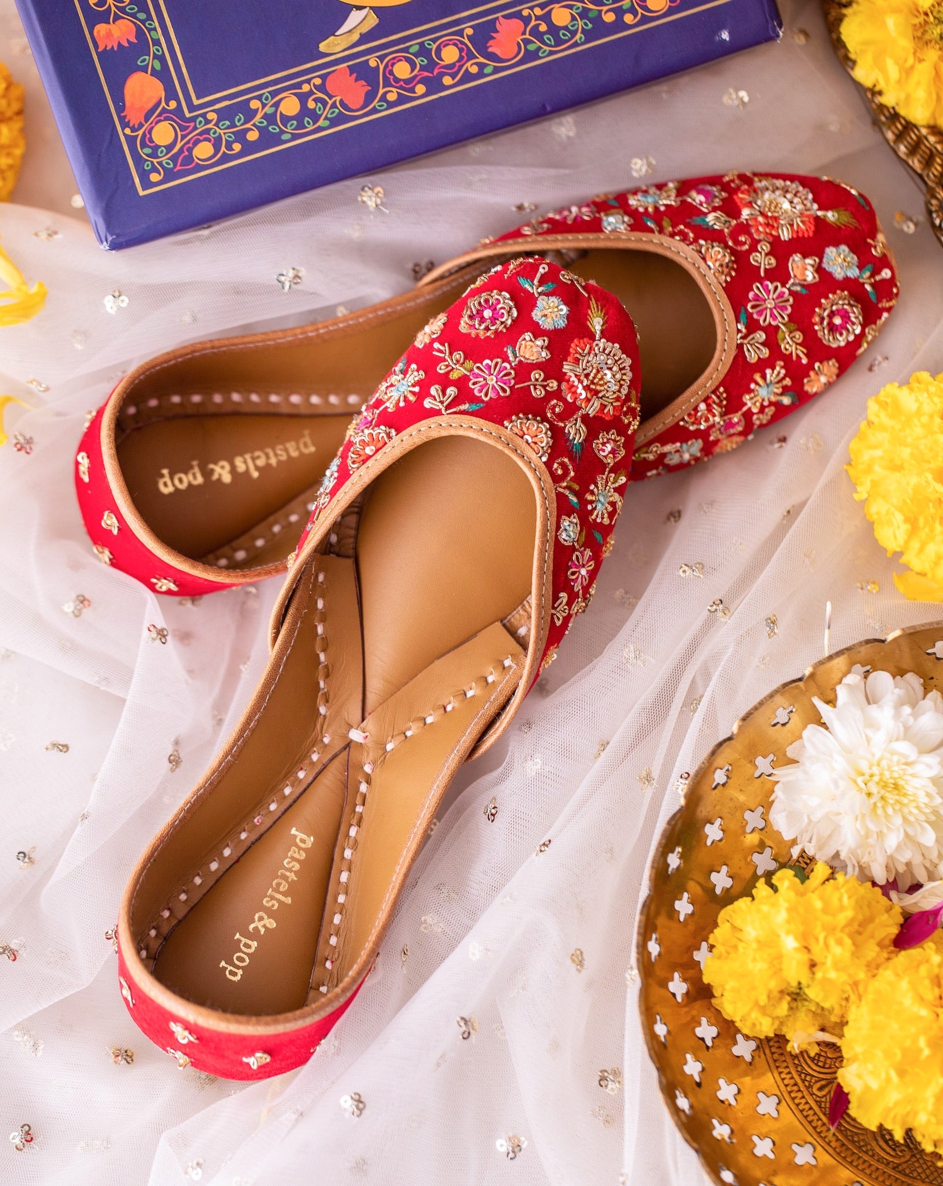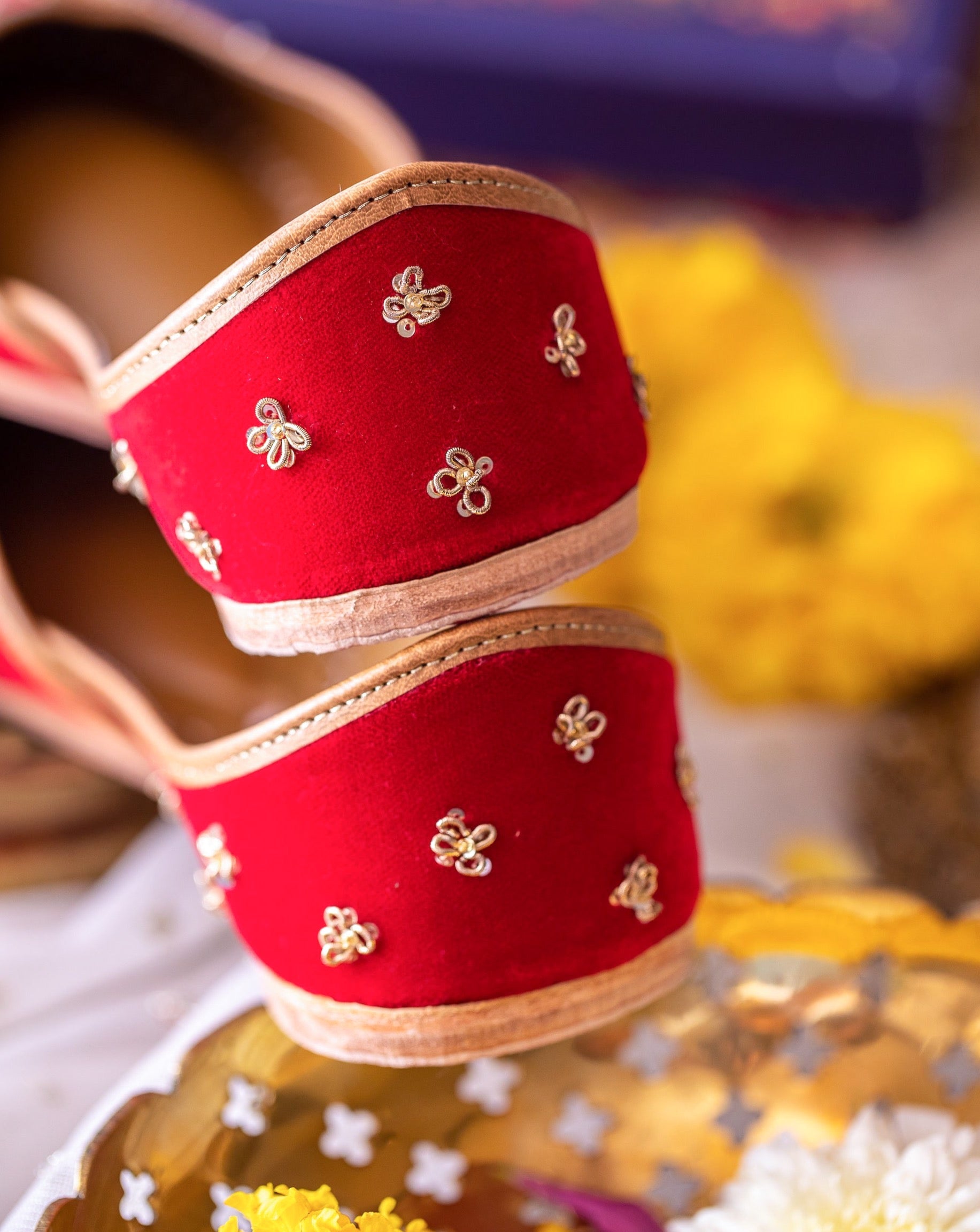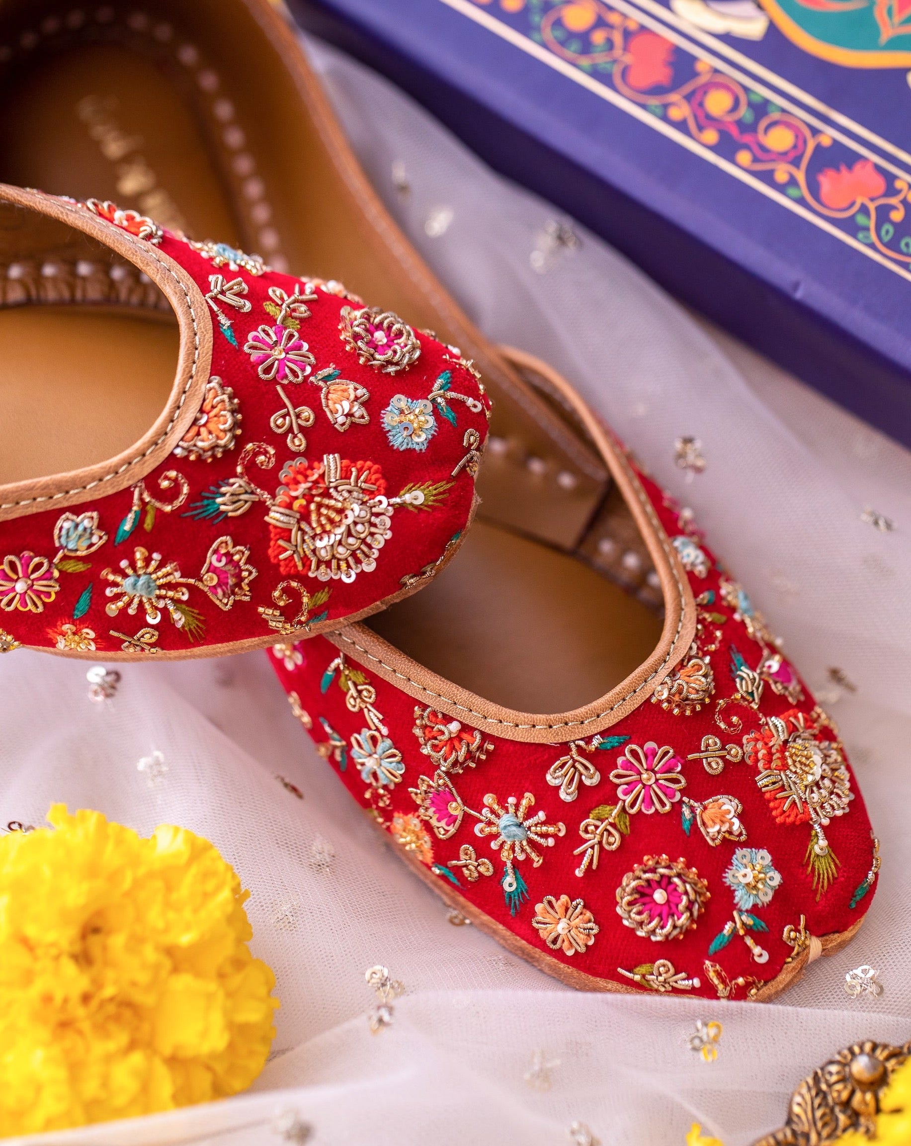 A gorgeous red jutti! Bright red velvet base with delicate bunches of flowers in pink, blue, orange and gold spread beautifully all over the front. The embroidery is done in the most eclectic materials - dabka, sequins, resham, beads and pearls. The back of the stunner features delicate tiny 3-D flowers in gold. The finesse in the detailed embroidery of this pair is truly a work of art, and takes over 3 days to make!