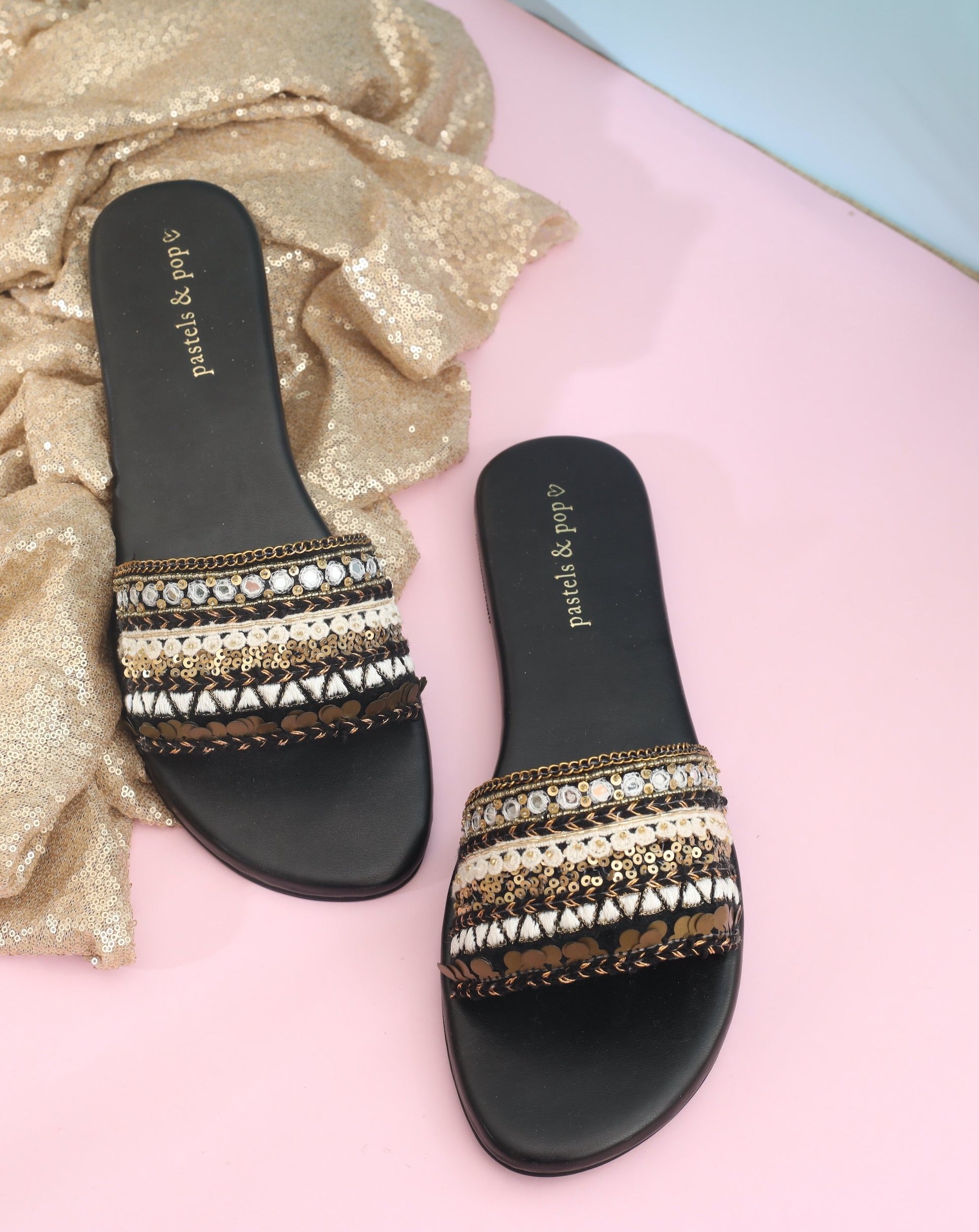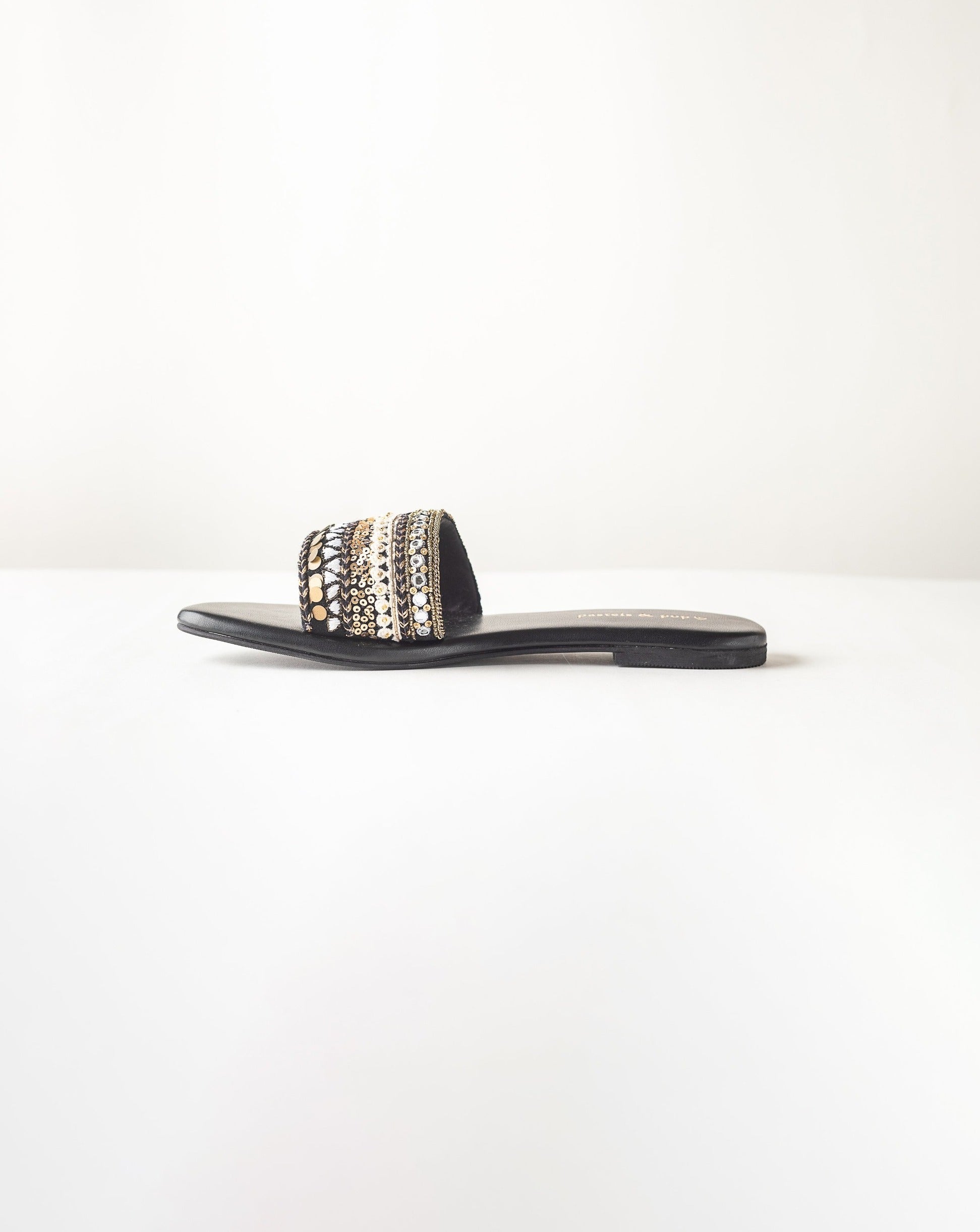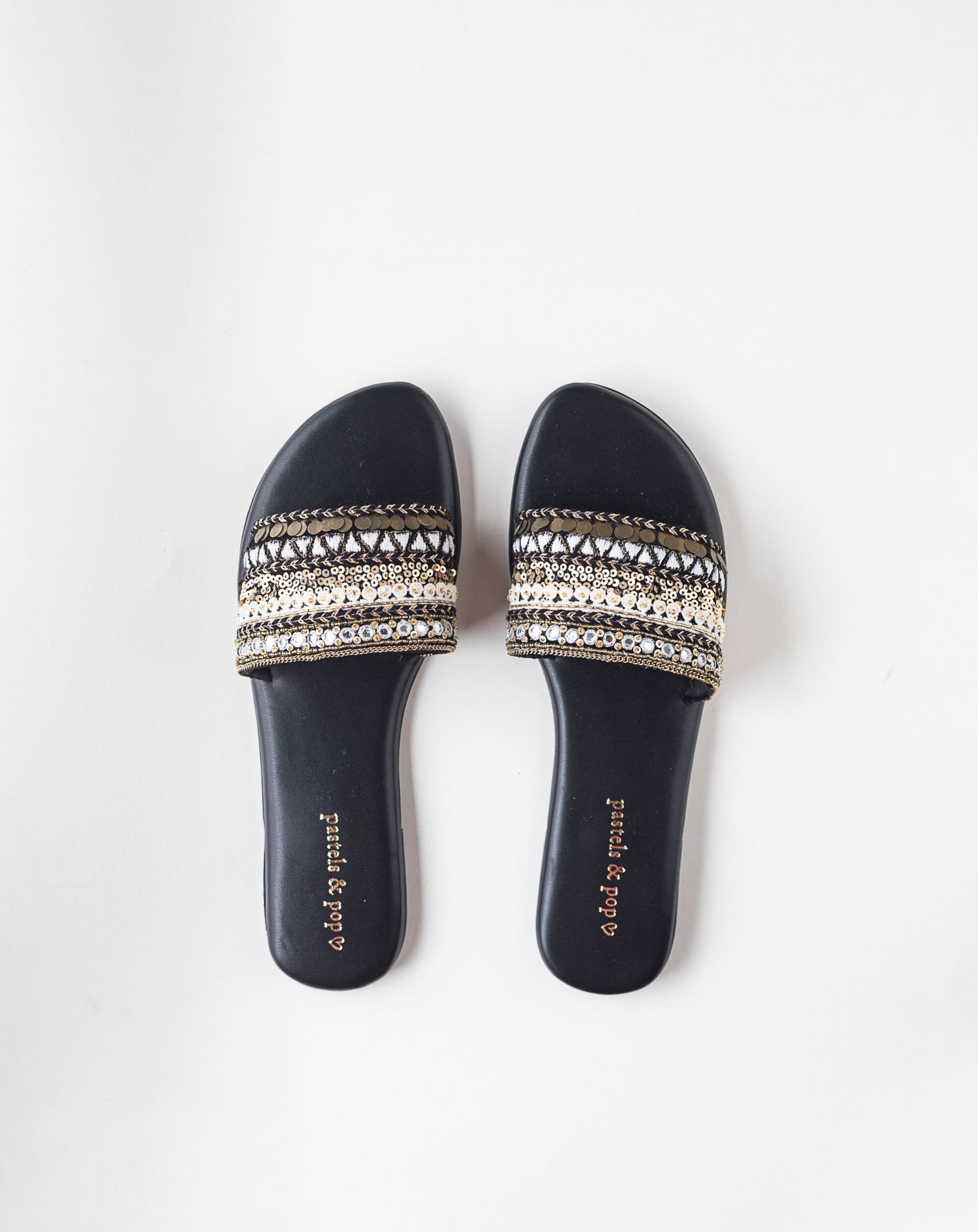 As smooth as its namesake, this beauty is easy on the eyes and flaunt-worthy come day or night. The pattern is an interplay of coins, mirrors, sequins and handmade laces, bordered by black, off white and antique gold chains on a bed of black suede. As with all our slides, the sole is vegan and anti-slip while being double cushioned for extra comfort. The Jazz slides embody the bohemian spirit; slip these on and go where your adventure takes you!