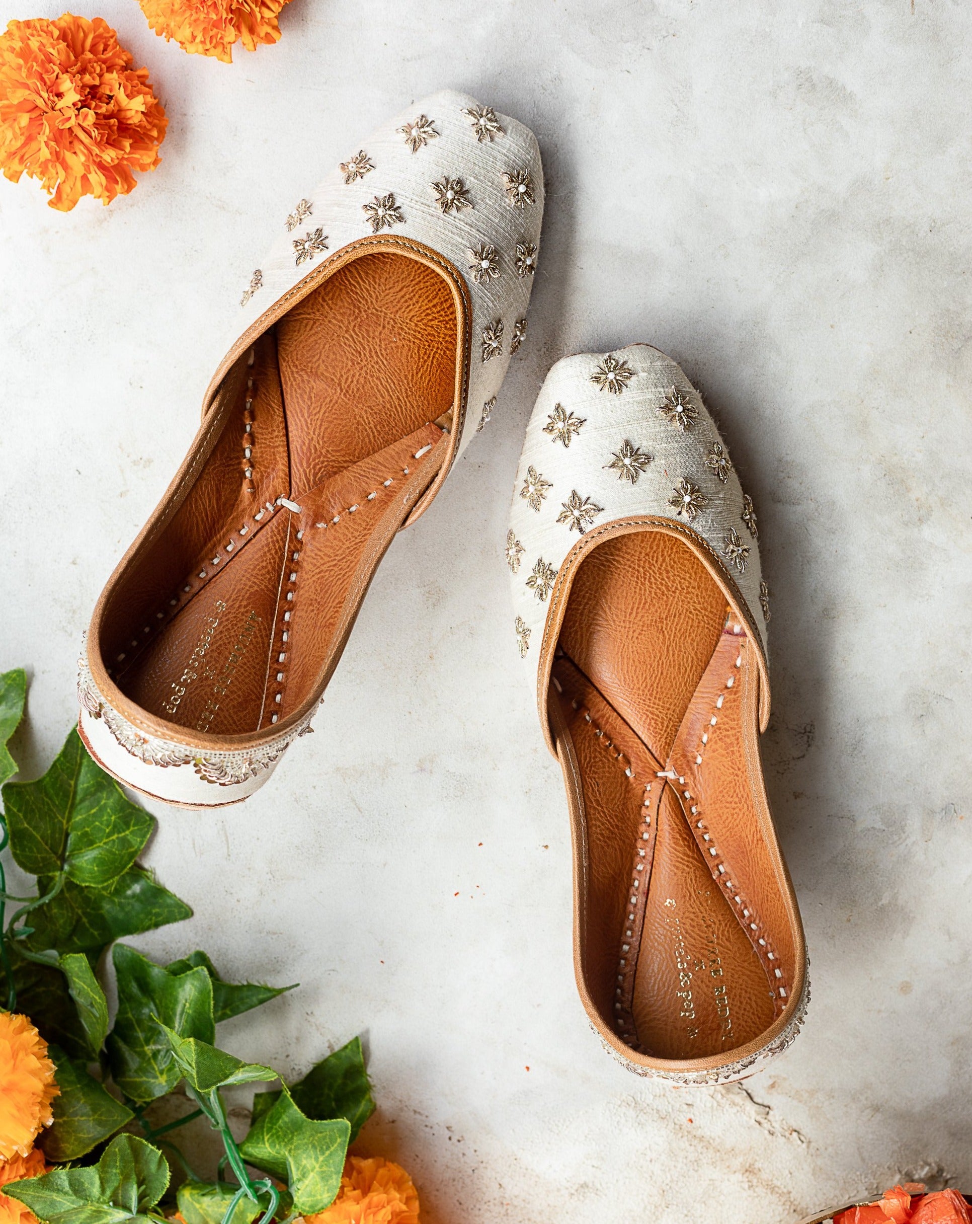 Composition : Upper - silk with intricate hand-embroidery, Back - silk, lining - leather, sole - vegetable tanned leather, double padded for extra comfort.