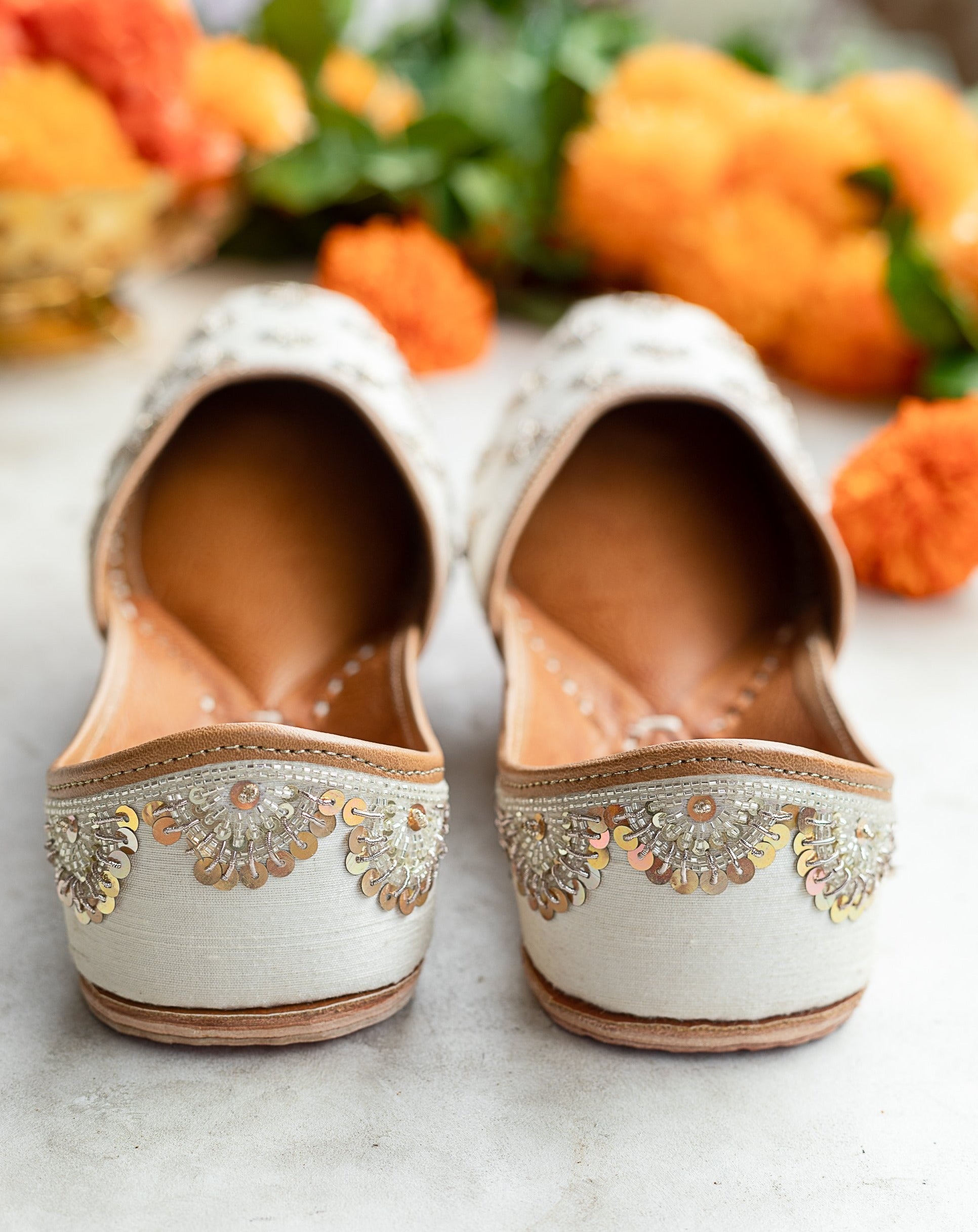 A pristine white base with flowers embroidered in zardosi and delicate tiny pearls spread beautifully all over the front of the jutti. The back of this pair features the signature Anushree Reddy scallop detailing done in lustrous glass beads and sequins. The contrast design styles of the front and back of the jutti, give it a beautiful uniqueness unlike any other!