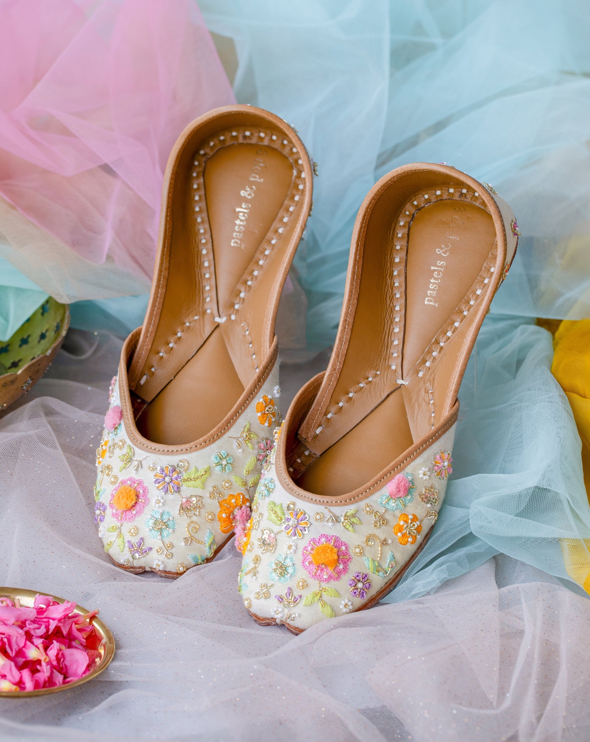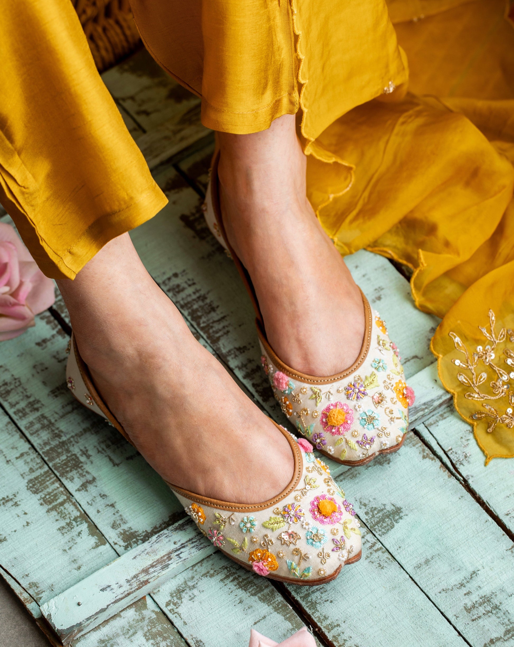 Composition : Upper -tissue with intricate hand-embroidery, Back - tissue, lining - leather, sole - vegetable tanned leather, double padded for extra comfort.