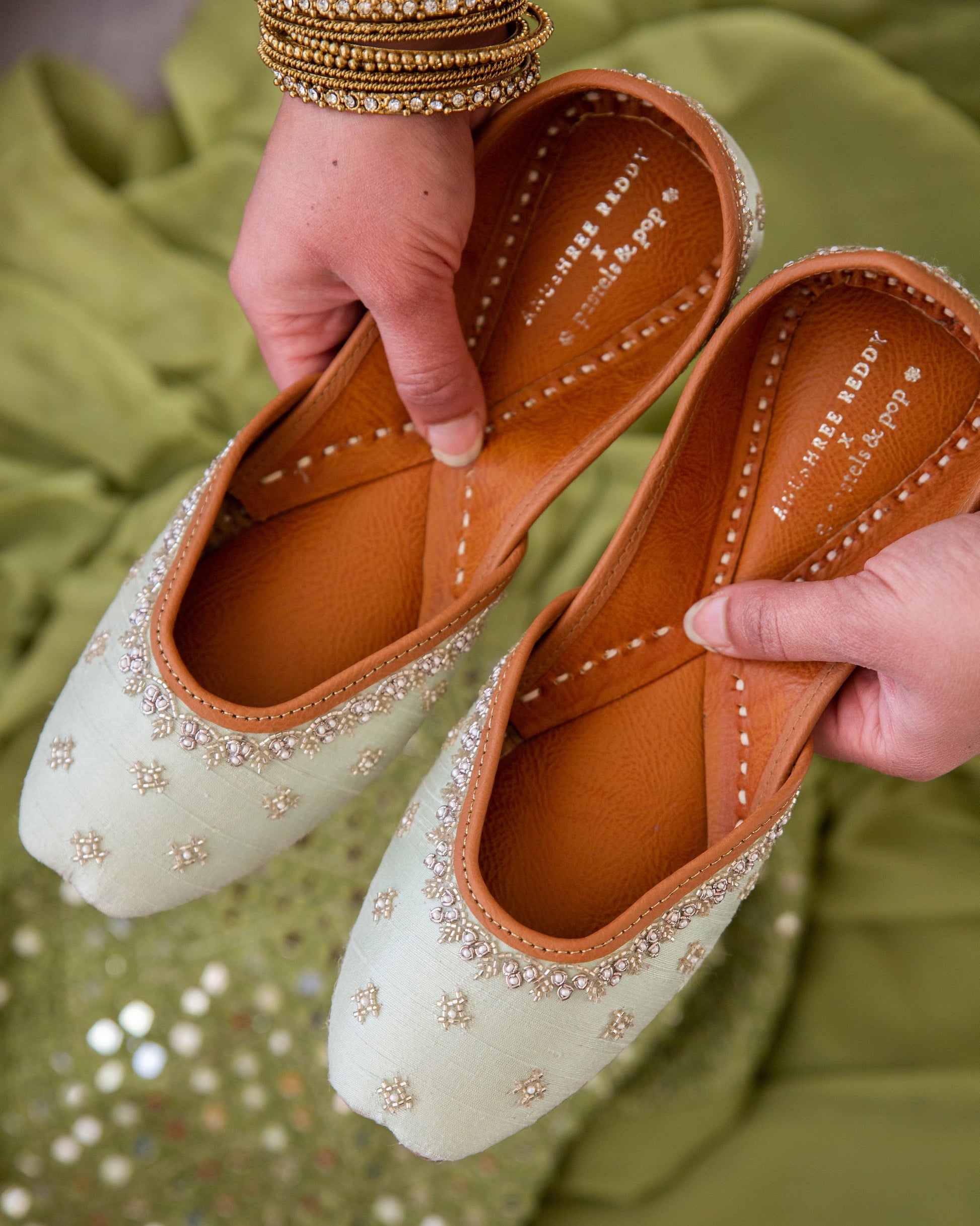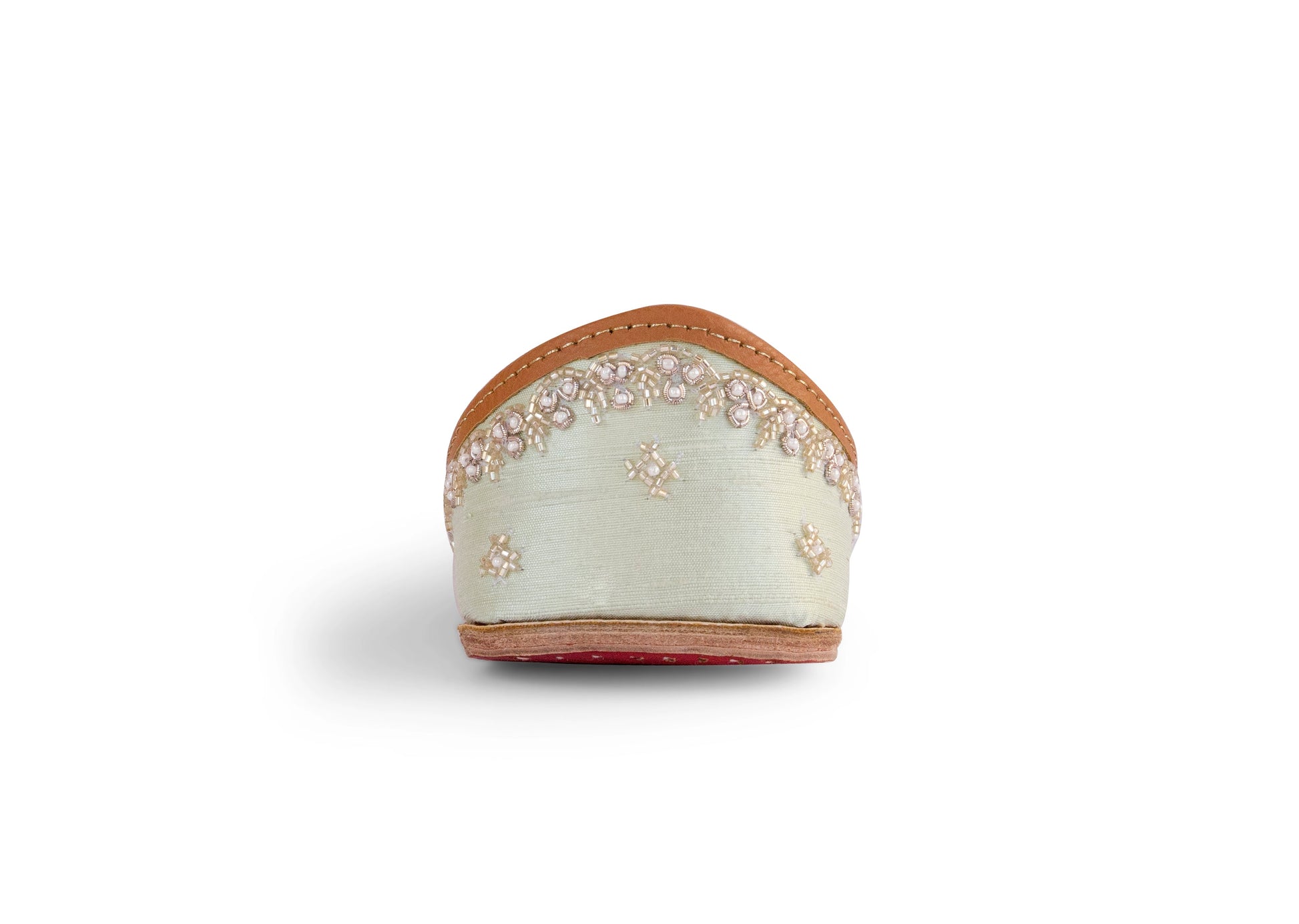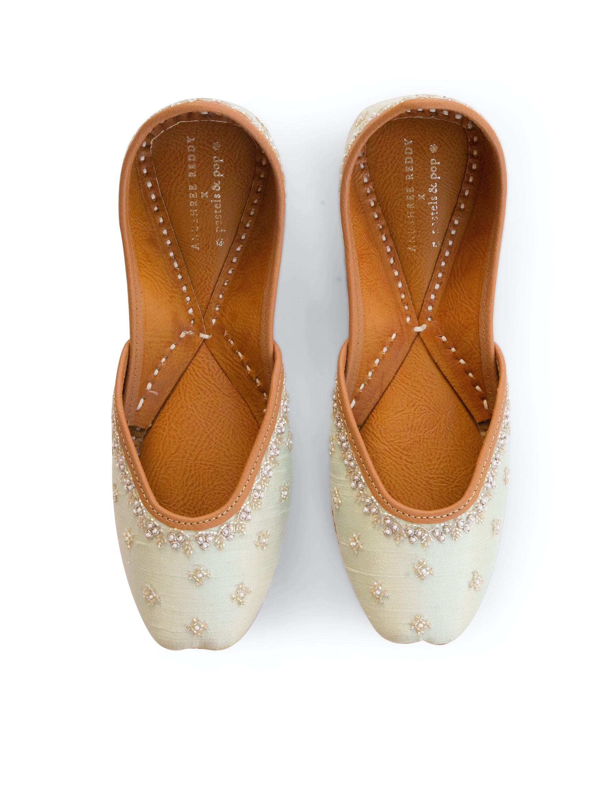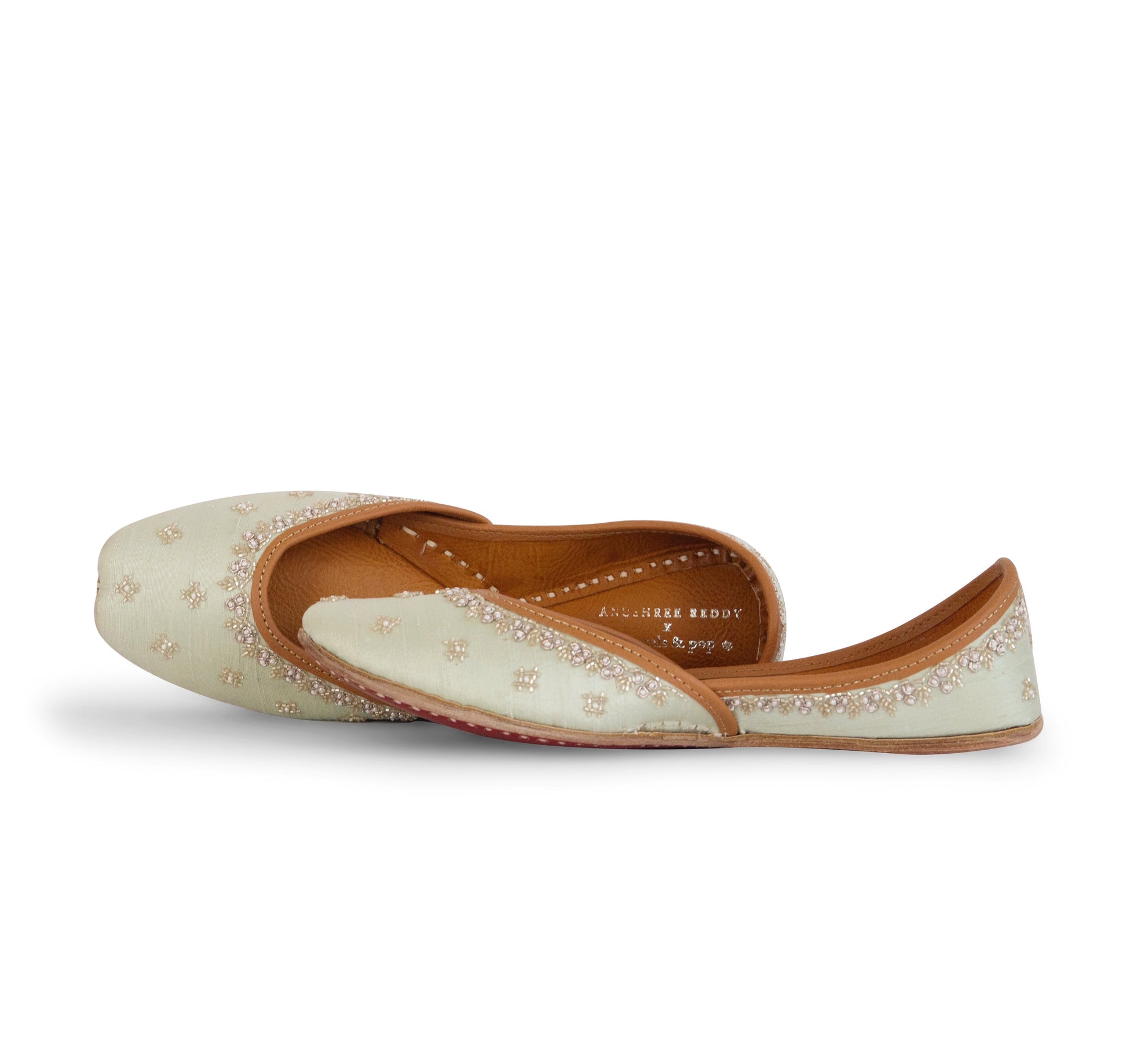 Kiara - a jutti as chic as its name. With delicate embroidery using champagne gold glass beads and off-white pearls resting on a beautiful pastel green base, this pair features the scallop bead motif that has become a distinctive feature of Anushree’s designs. If your colour preferences lean toward the subtle neutrals then this beautiful pair is a must-have in your shoe closet. Versatile and classy, this jutti can be seamlessly paired with both Indian and western outfits.