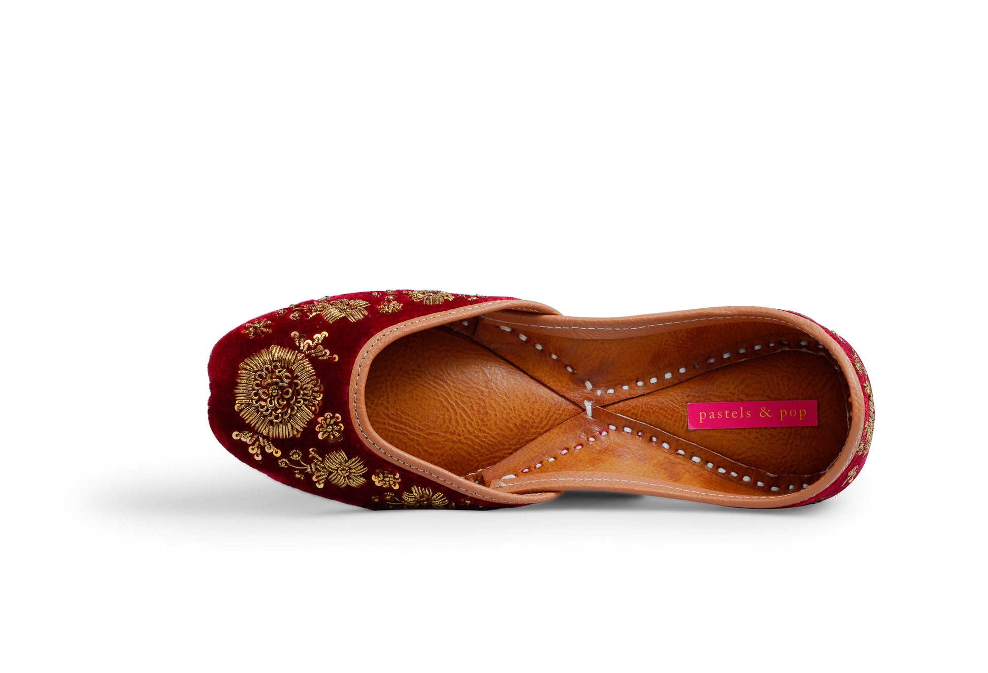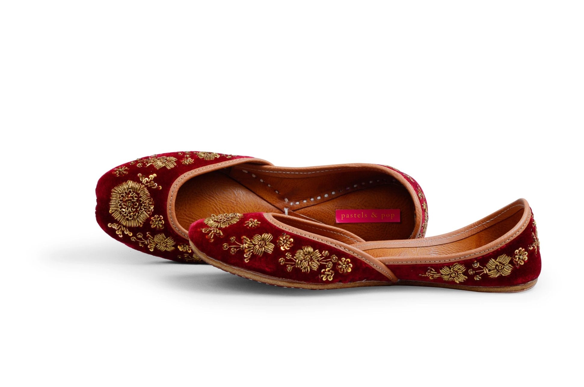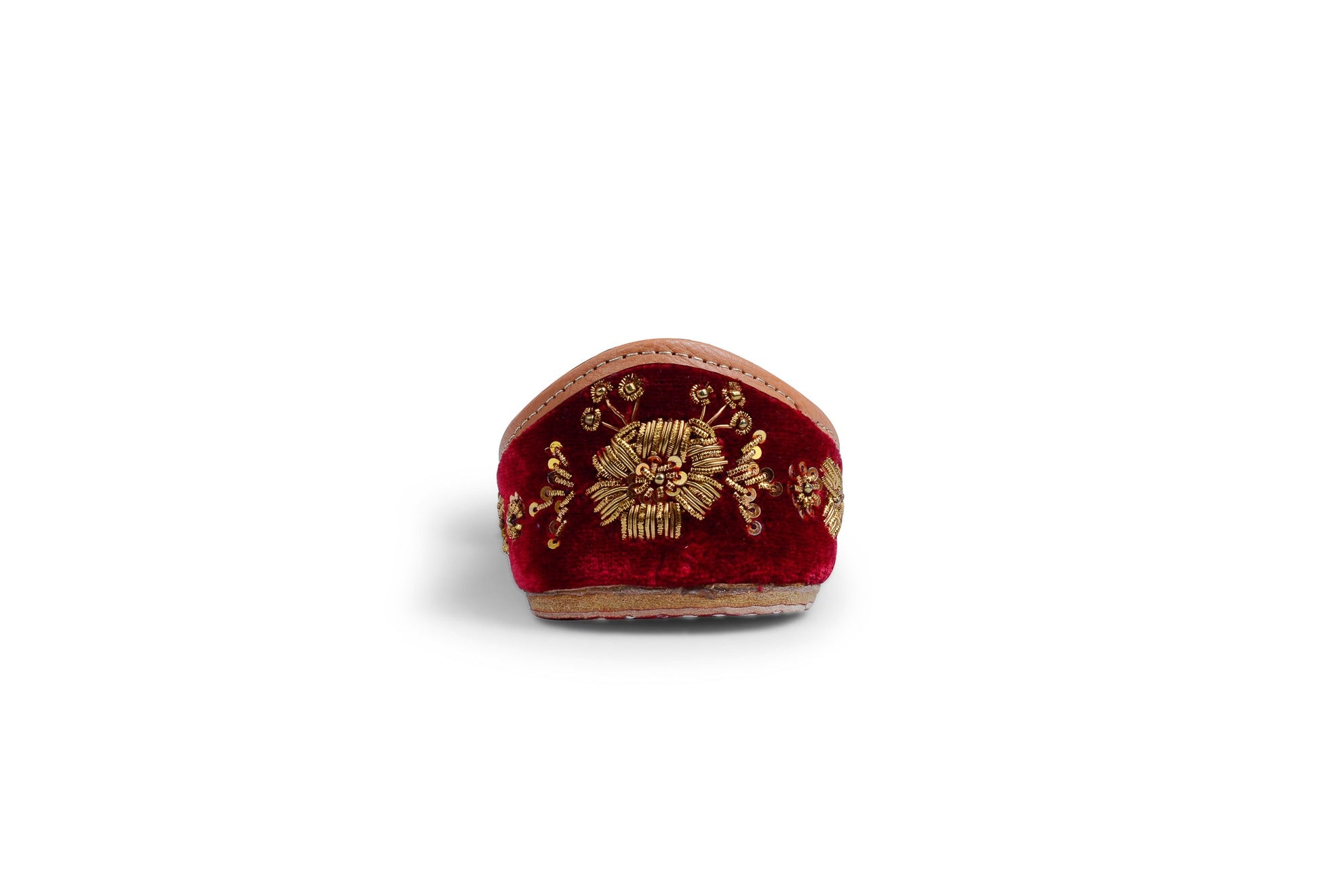 "A thing of beauty is a joy forever", perfectly describes this stunning pair. Rich maroon velvet base hand-embroidered with antique gold metallic thread using zardosi technique, to form a beautiful pattern all over the jutti. There is something very regal and timeless about the combination of velvet and zardosi!