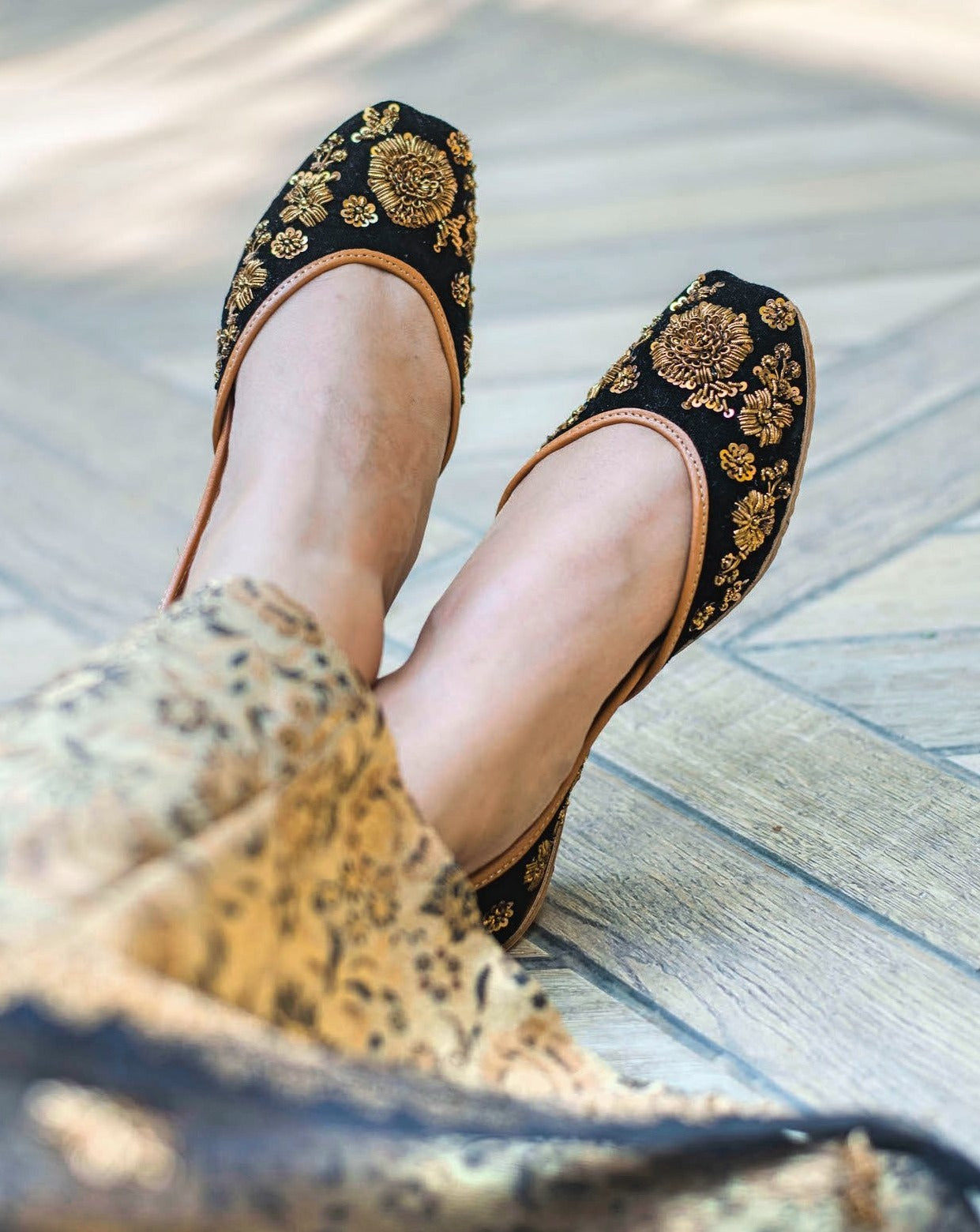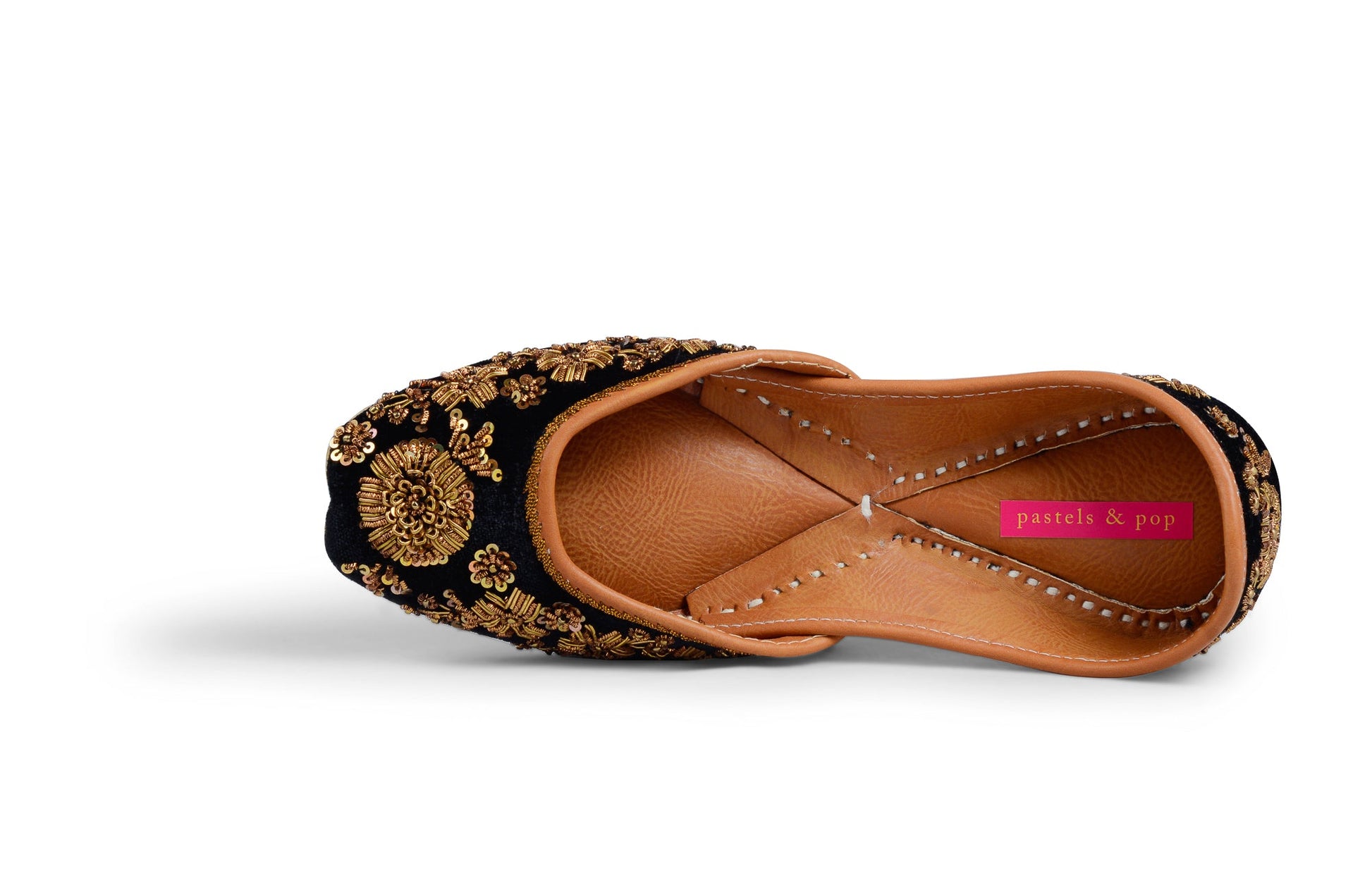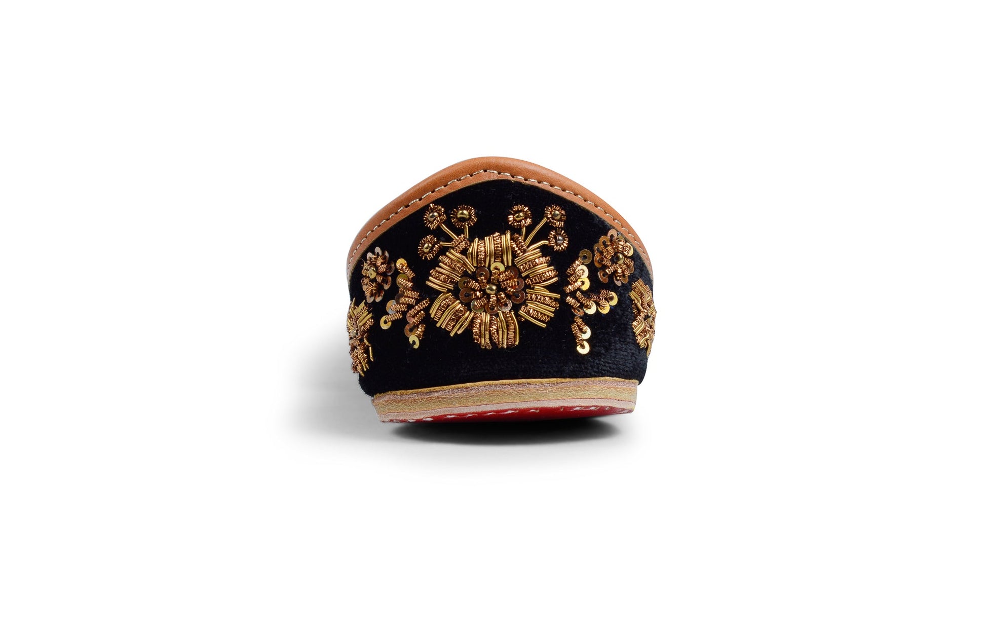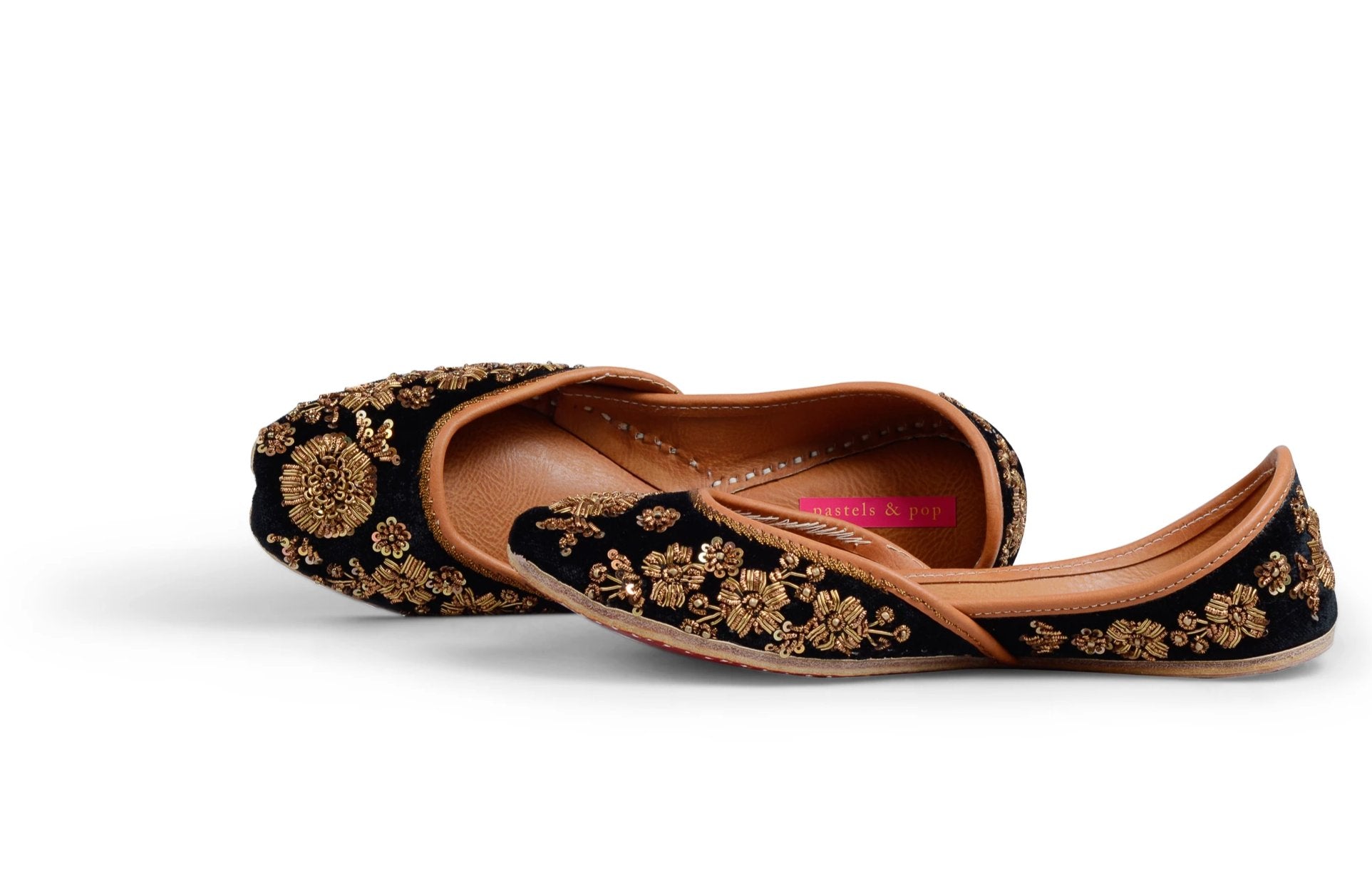 "A thing of beauty is a joy forever", perfectly describes this stunning pair. Rich black velvet base hand-embroidered with antique gold metallic thread using zardosi technique, to form a beautiful pattern all over the jutti. The combination of velvet and zardosi embroidery give it that regal, timeless appeal that's so alluring to the eye.