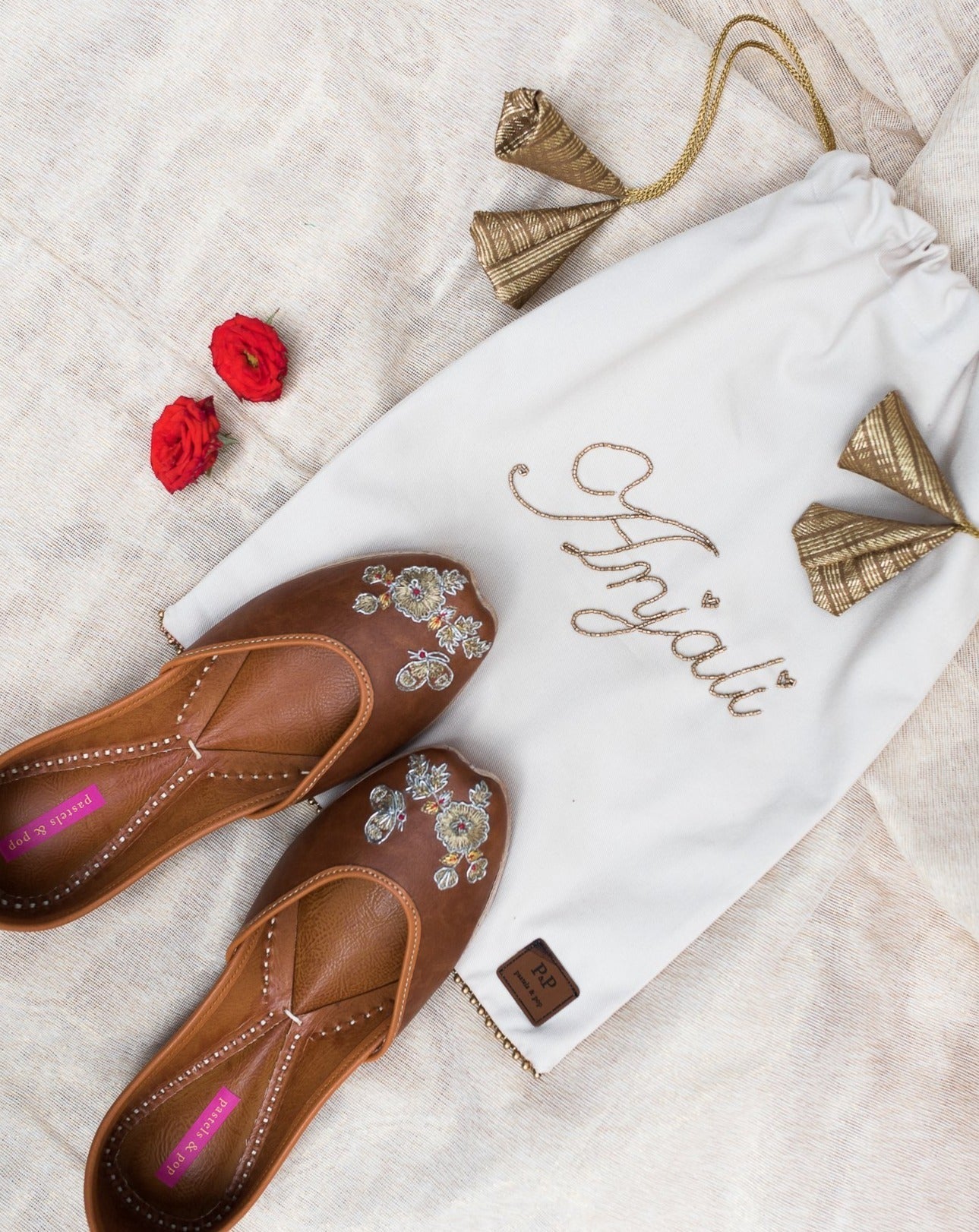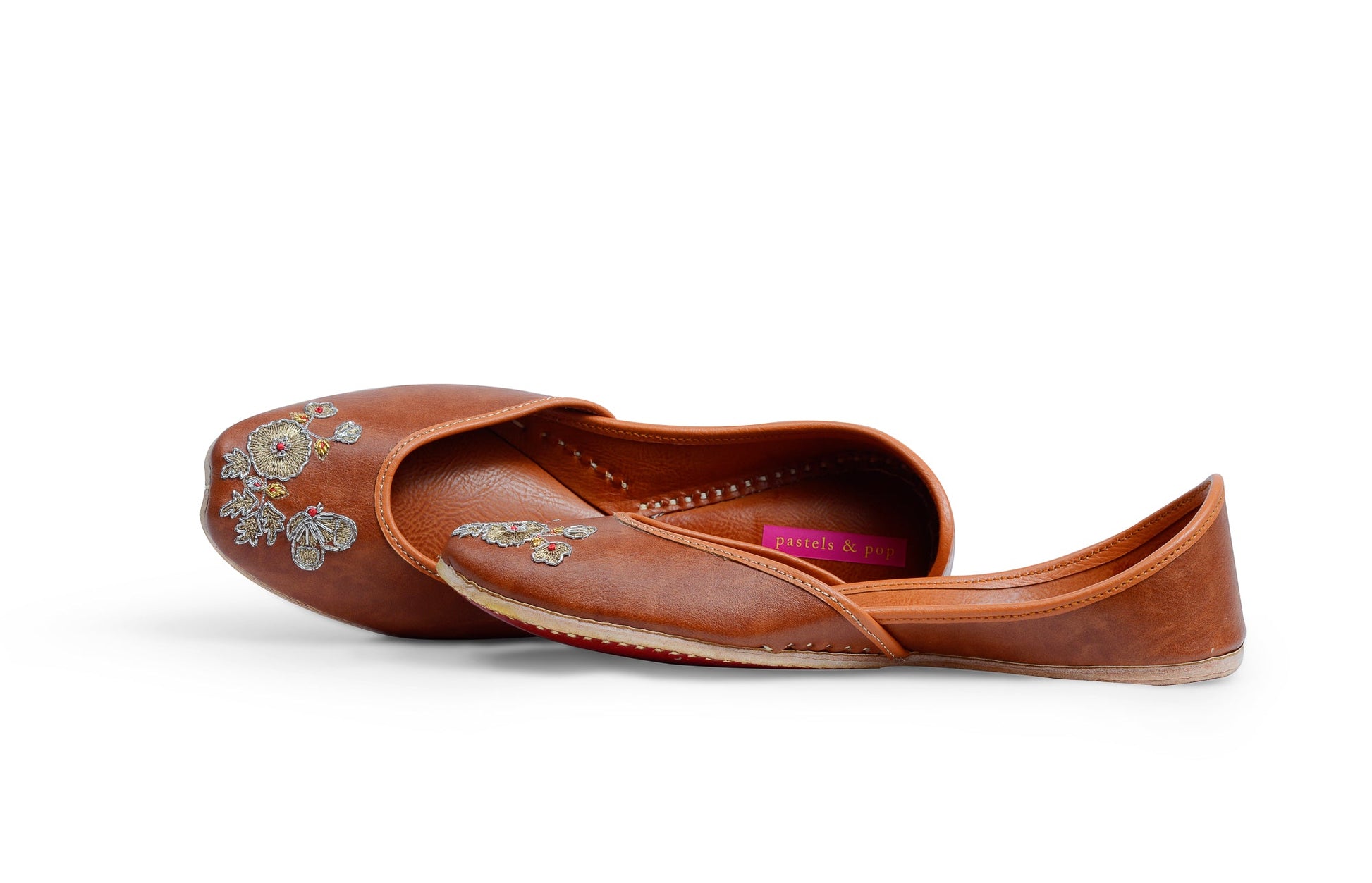 The embroidery uses elements such as zardosi, zari, and silk thread to fashion a flower and butterfly motif, with a hint of red to give that little bit of zing. This is definitely every outfit’s cup of coffee as these juttis can be paired with any attire in your wardrobe. Make them the hero of your outfit or a perfect complement to a heavy set. You just cannot go wrong with this one!