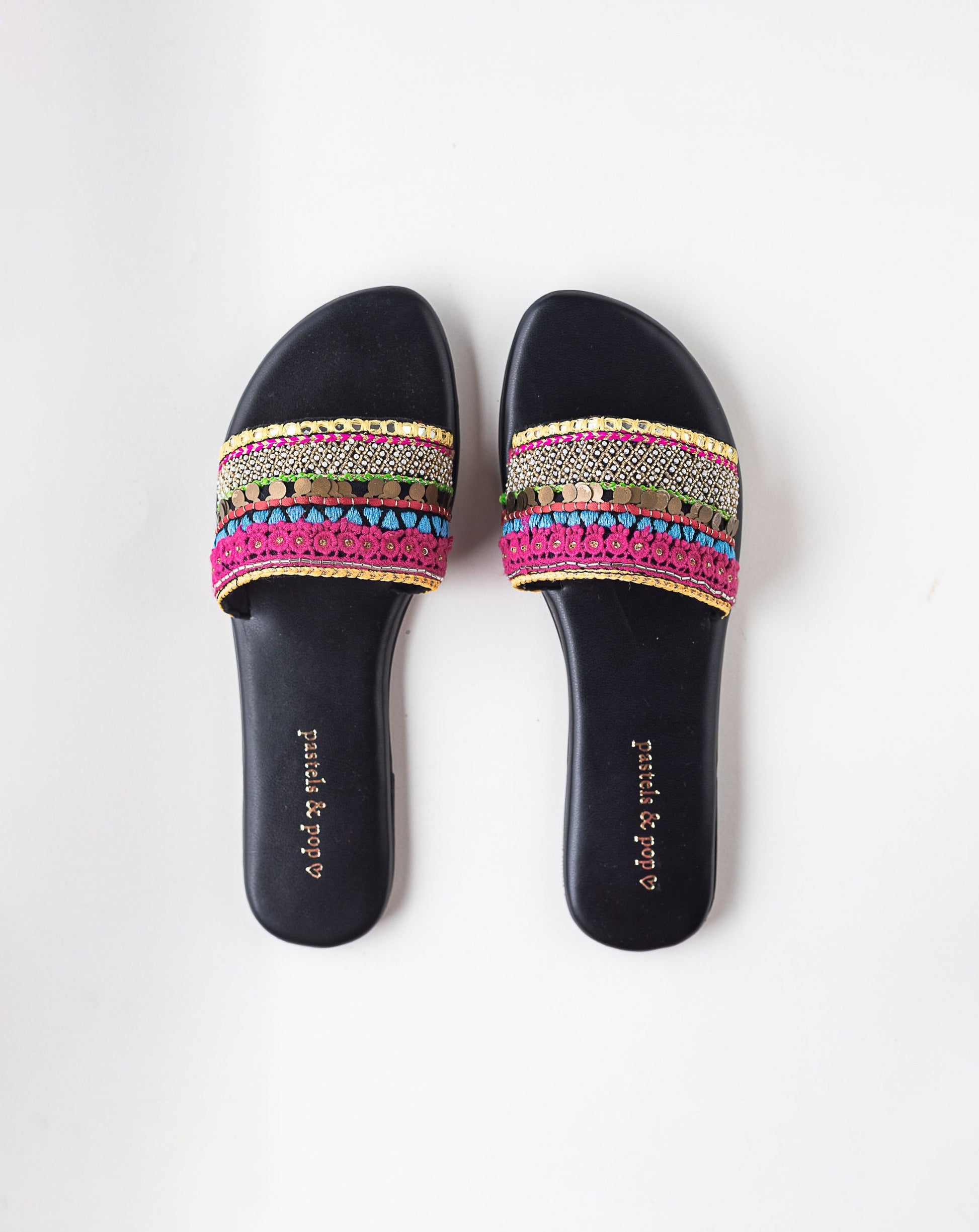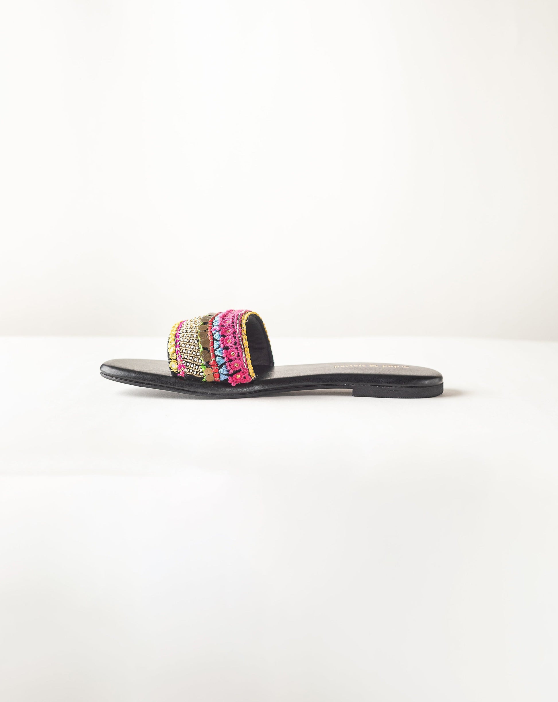 The ‘Nomadic’ slide is a true masterclass in superlative embroidery. This pair comprises of a multitude of elements - silk threads, mirrors, lace, copper coins, pearls and bugle beads brought together on a suede base to create an extravagant symphony of colours and motifs. True to its name, the Nomadic is a goes-with-everything kind of pair, and is especially useful if you want to add a head-turning pop to a your all black look!