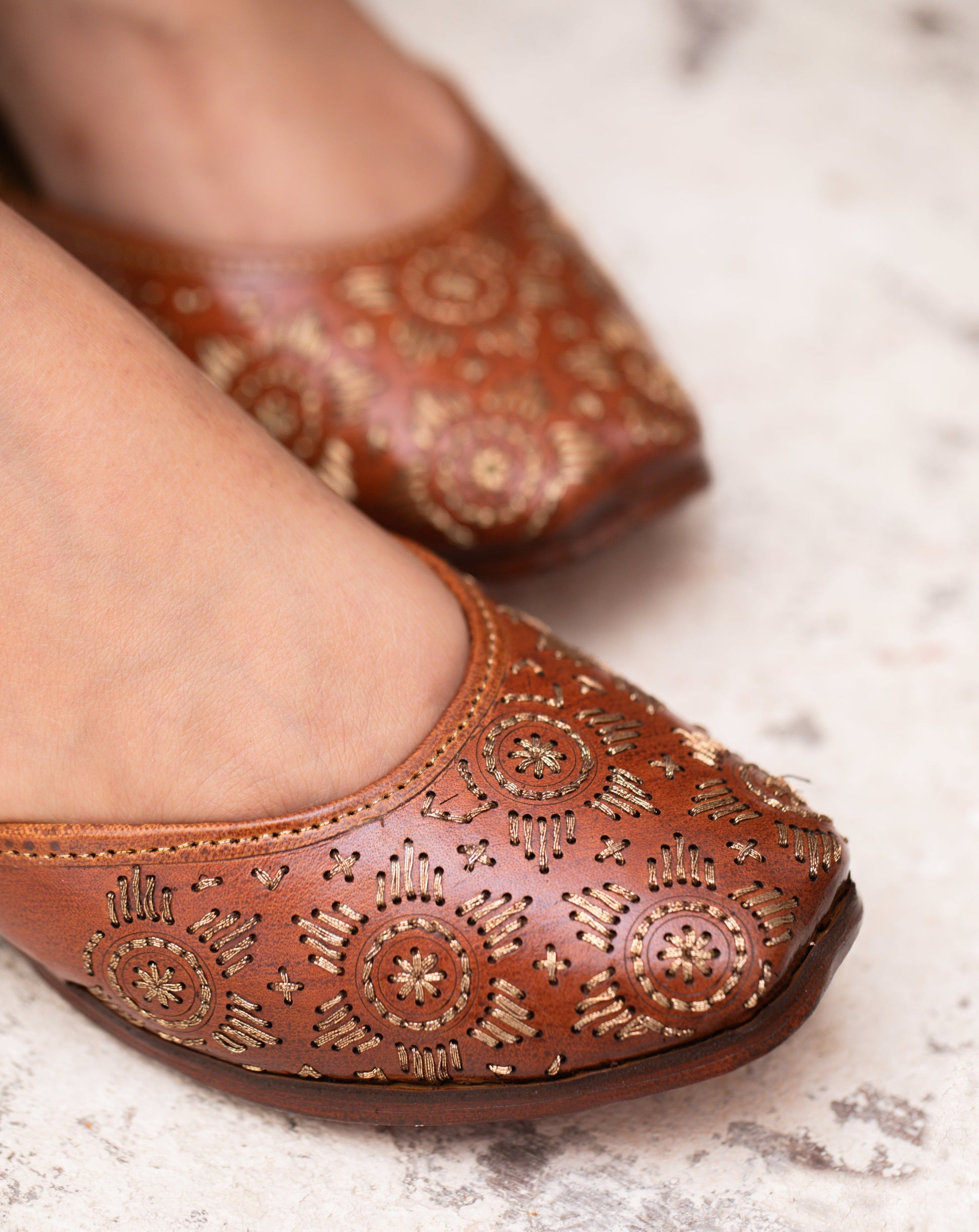 Phulkari is a stunning brown caramel-colored jutti adorned with antique zari embroidery in traditional Phulkari patterns. This elegant design pays homage to the rich heritage of Punjab, offering a versatile and stylish addition to your wardrobe.