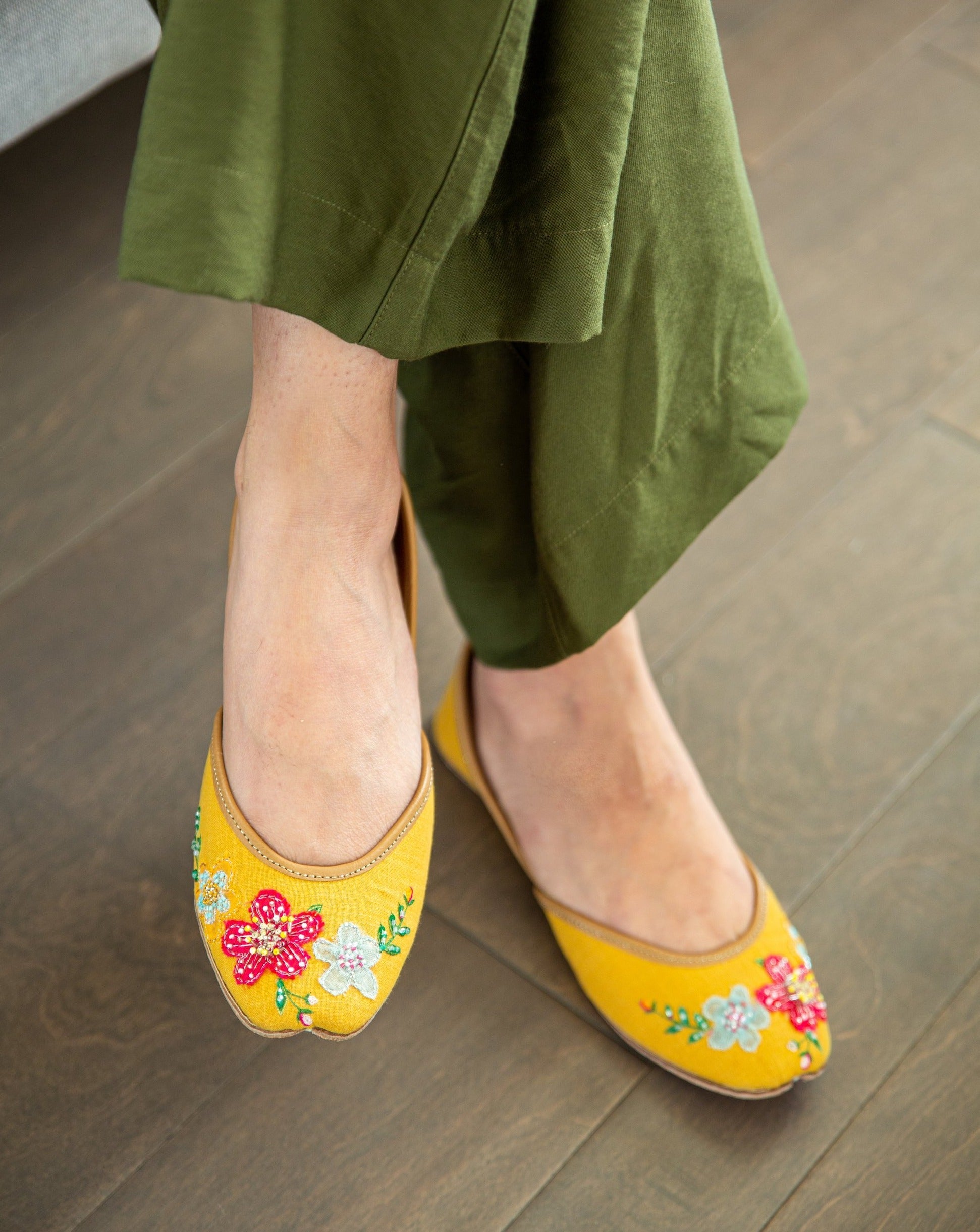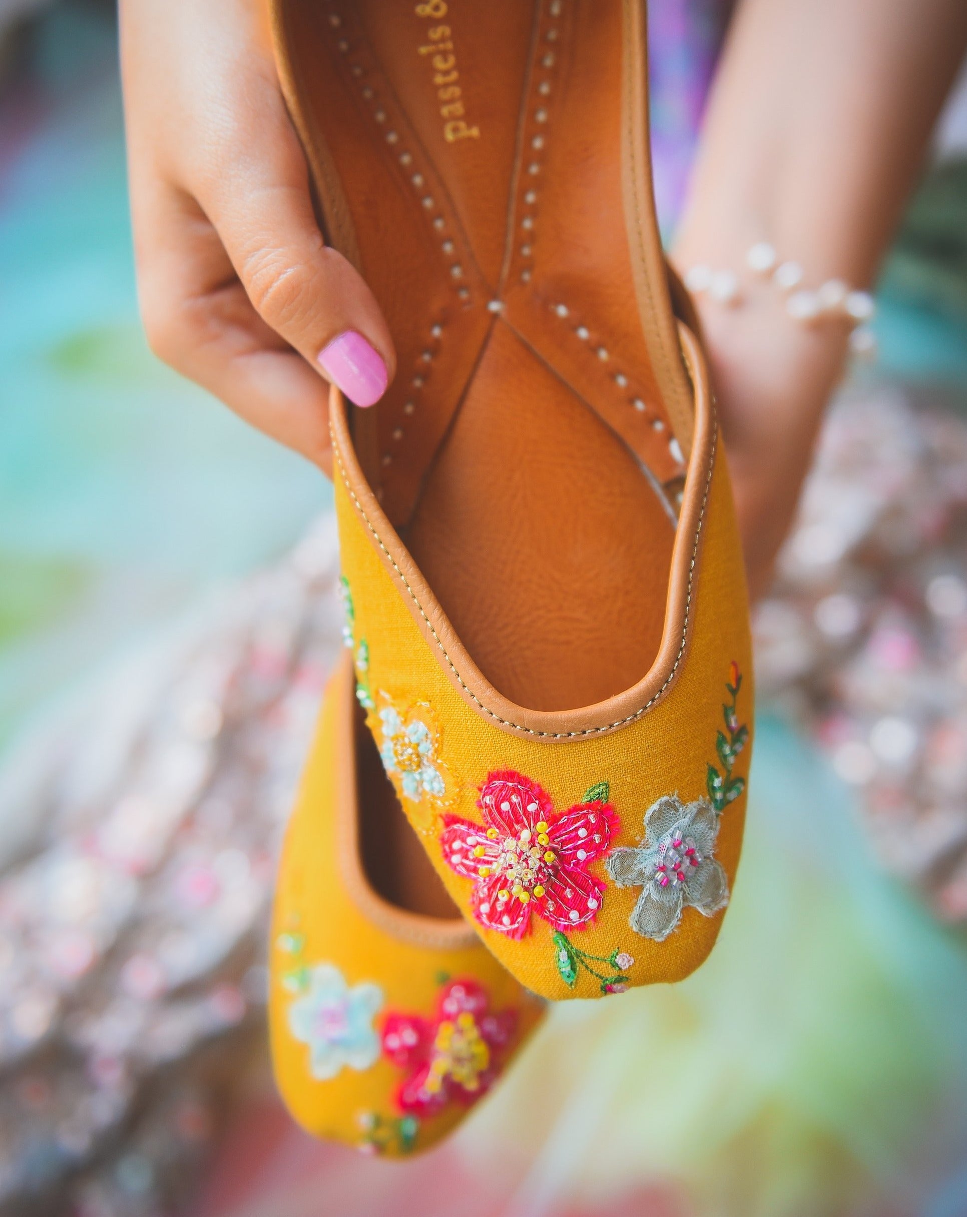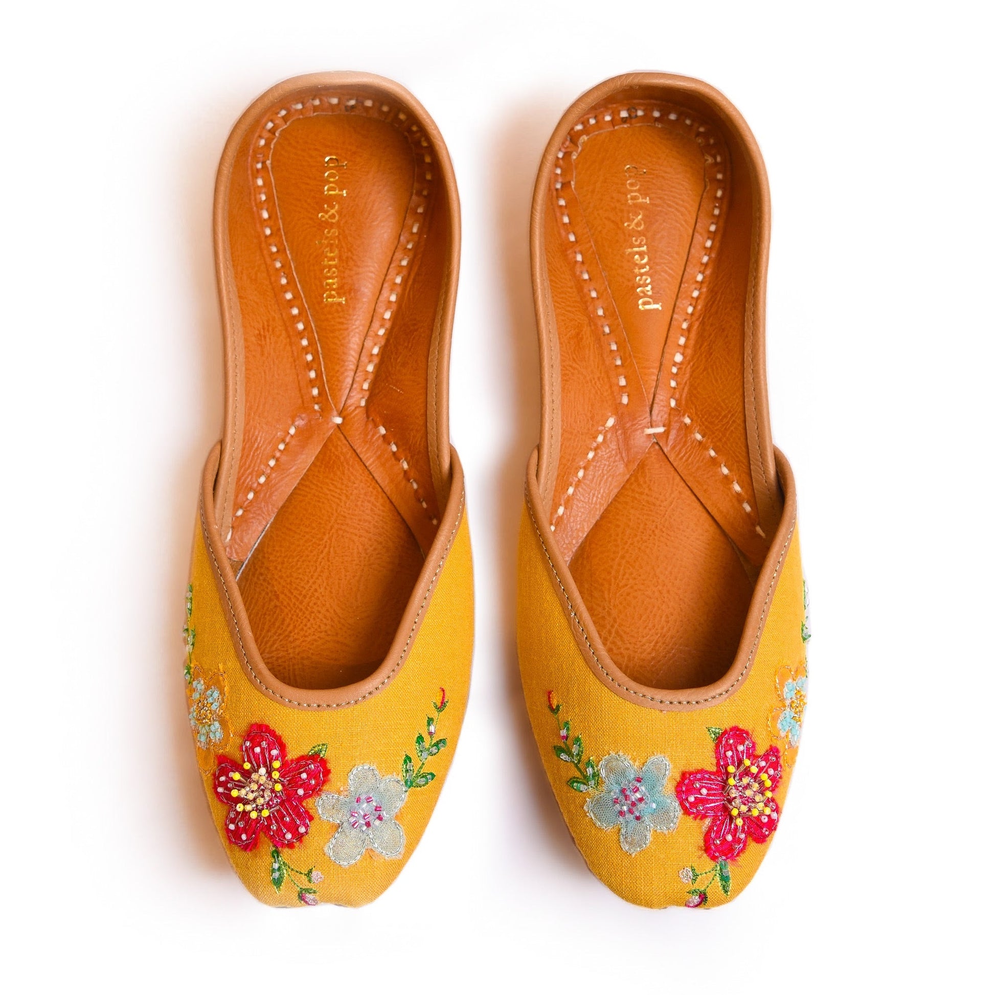 Introducing the super fun pair - Posy. This Jutti sports a turmeric yellow base beneath a patchwork of flowers in bright, festive colours. The floral motif features a neat 3D effect, thanks to the bugle beads, sequin and tule embellishments. This is a great pair for anyone who loves to carry a little colour on their toes, or simply to infuse a bit of flavour and fun to an otherwise somber outfit. A big plus? It goes with most of the outfits in your wardrobe!