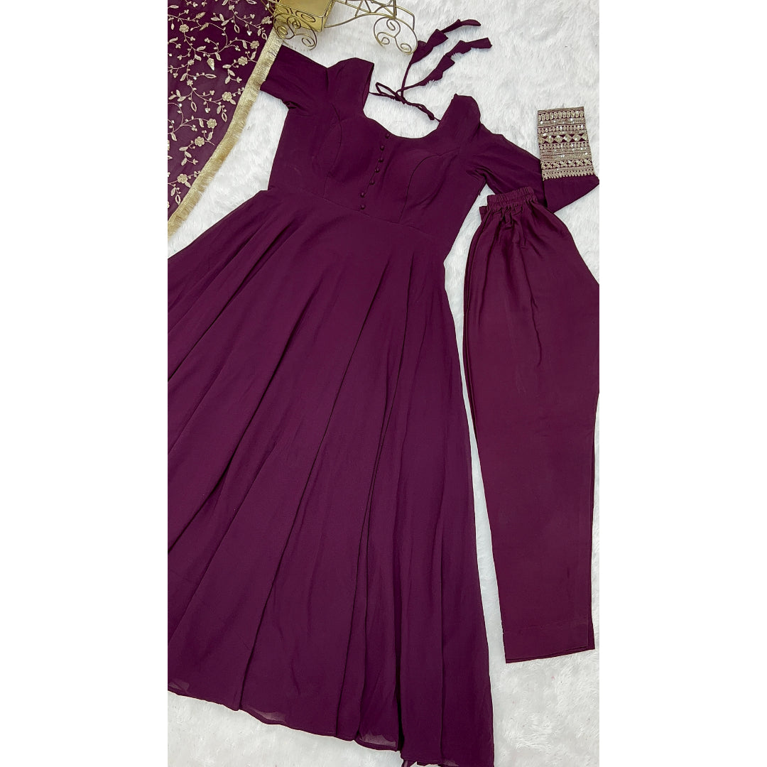 Presenting New Wine Georgette Gown Dupatta Full Set With Pent Ready To Wear