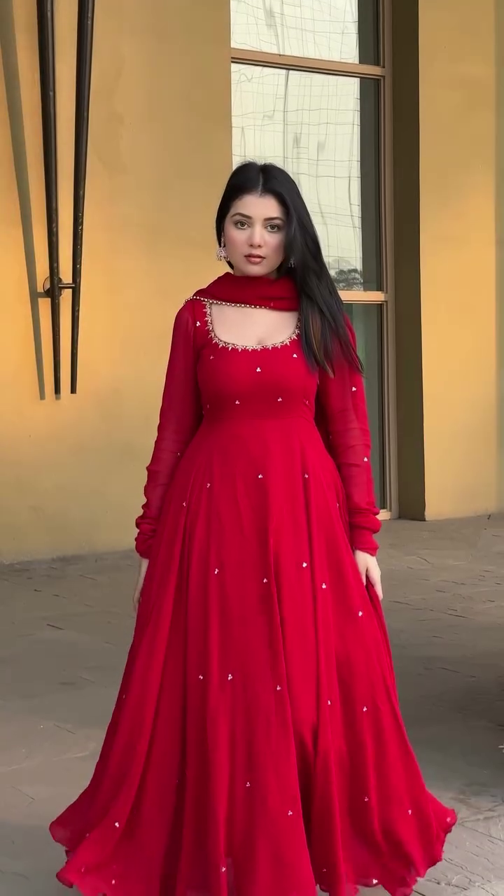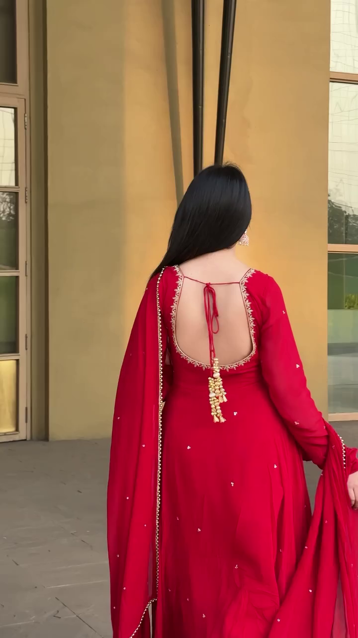 Make a bold statement in this luxurious Red Hand Work Anarkali Suit – the epitome of grace and sophistication!