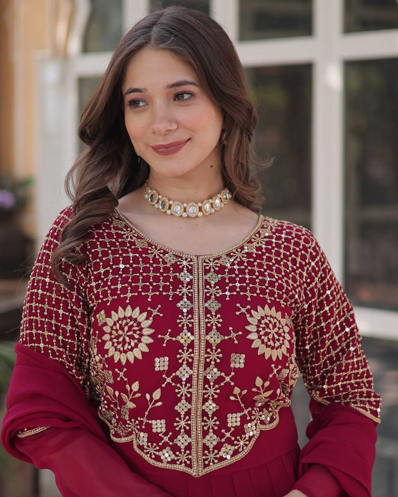 Rani pink color faux blooming georgette gown with embroidered dupatta