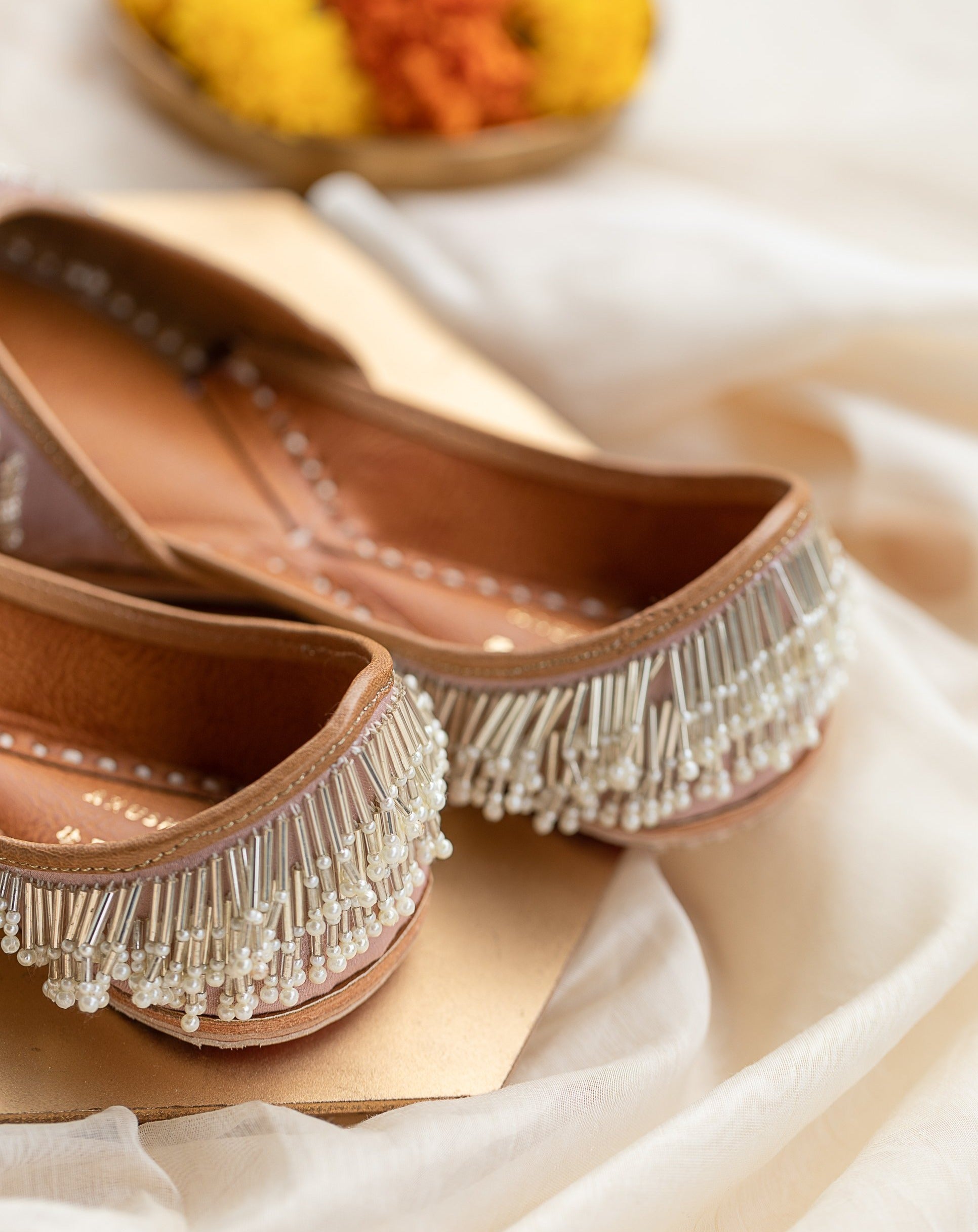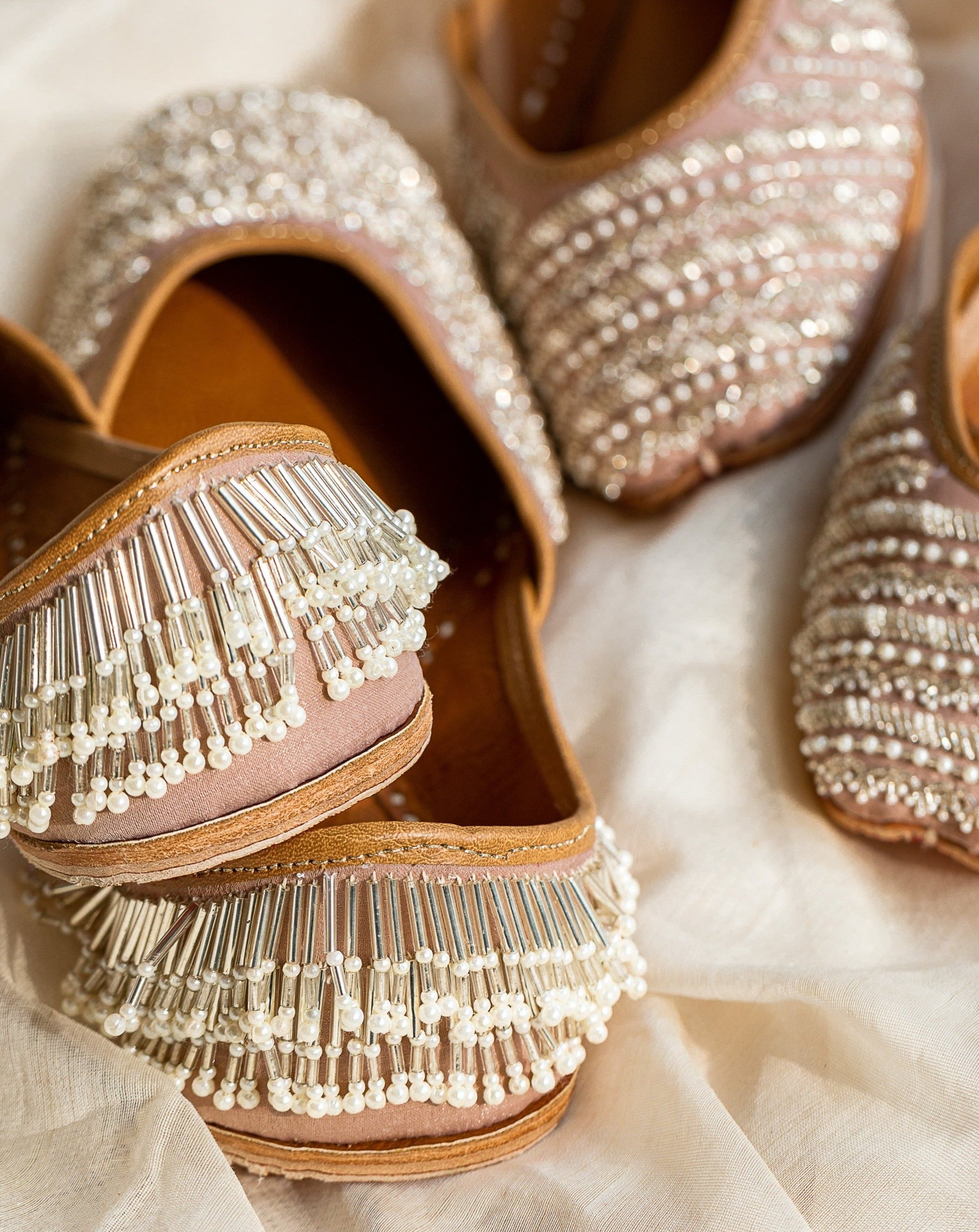 Introducing the showstopper of this collection - Rimjhim. Alternating rows of cutdana and pearls on an elegant nude base cover the face of the jutti. The back features gorgeous tassels, made up of long glass beads and pearls, which add that extra shimmer to your overall look. This pair caresses on the delicate and the feminine, and settles on the festive! We recommend the Rimjhim as a must-have this wedding season.