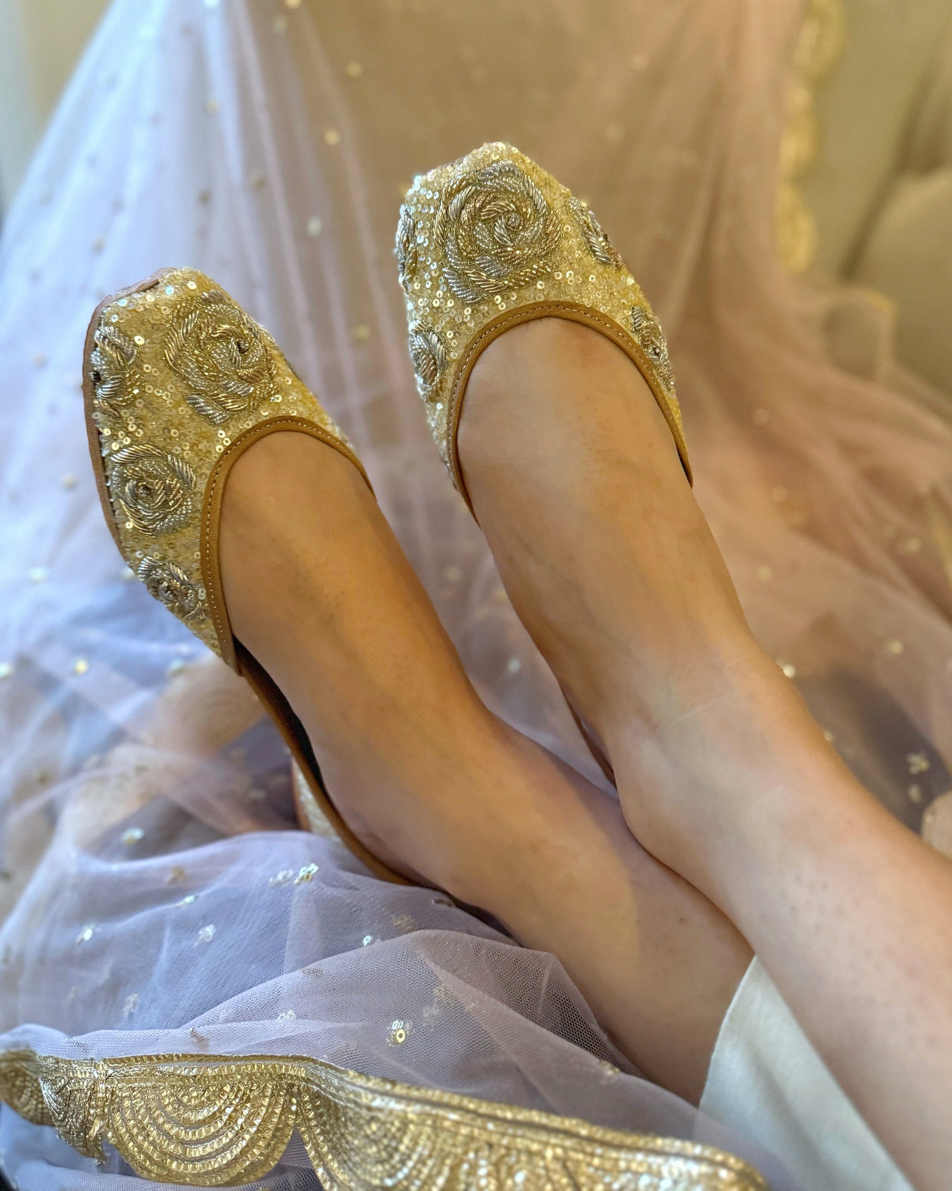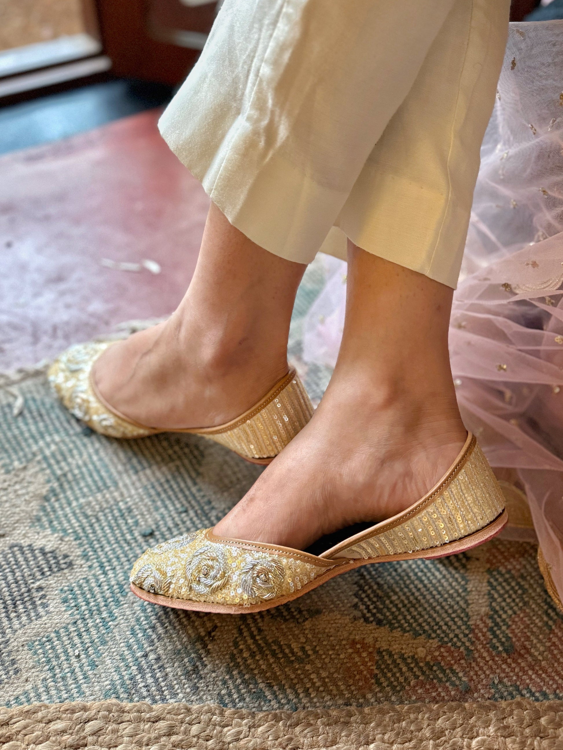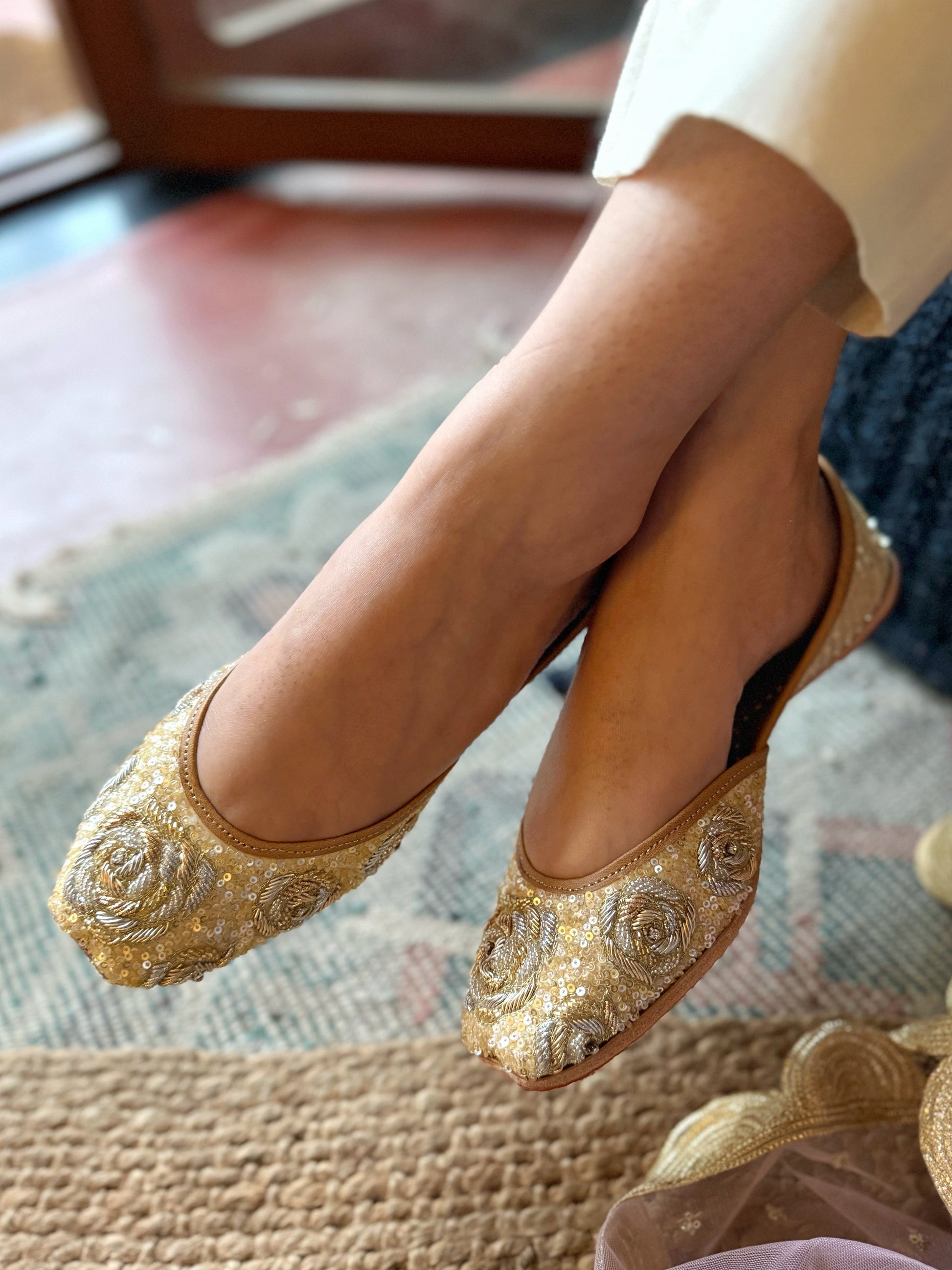 A dreamy jutti adorned with blooming roses in gold, silver, and rose gold, nestled on a bed of sequins. Crafted with saadi, glass beads, and glimmering love – it's perfect for weddings, festive soirées, or just a sparkle-kissed day.