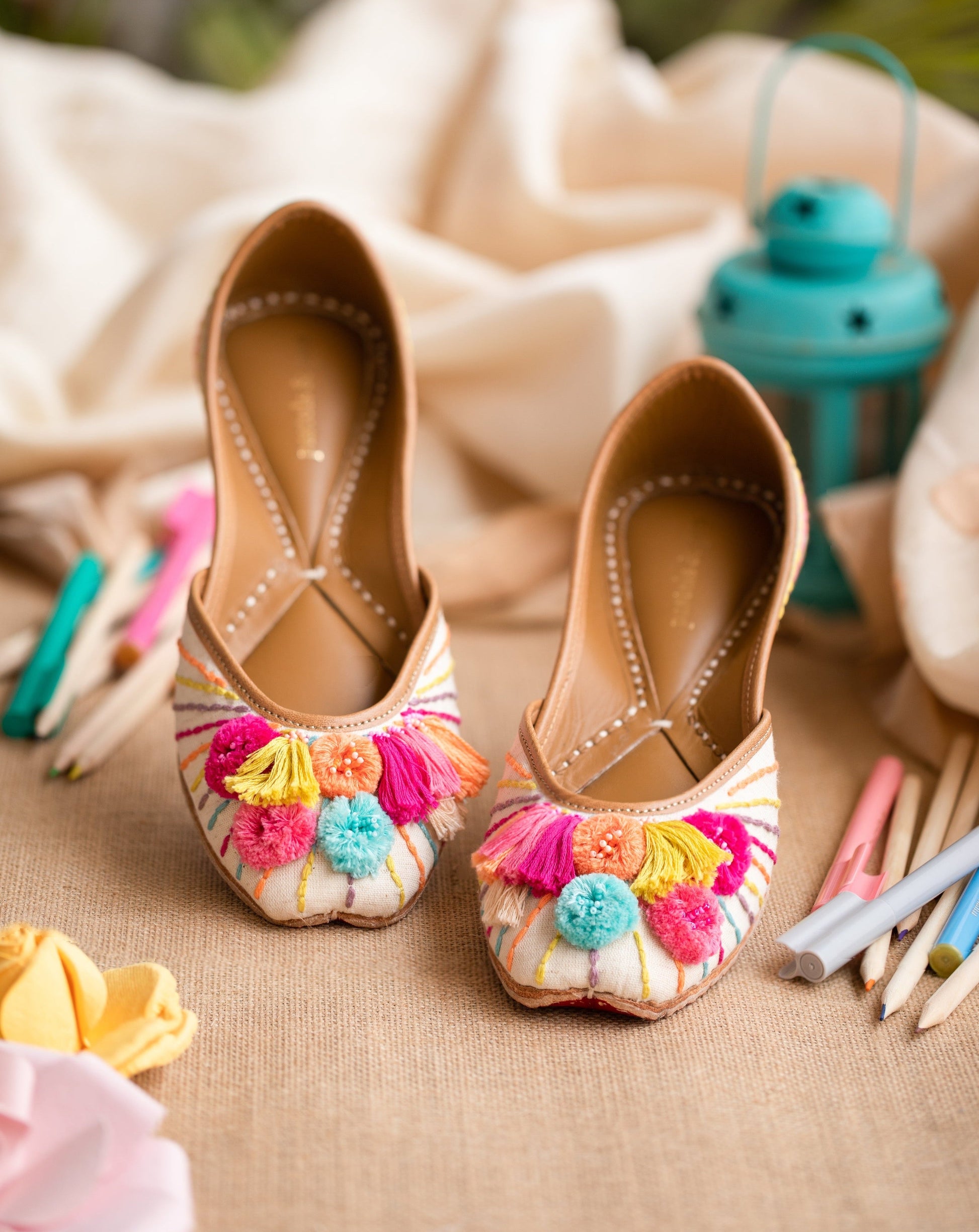 This Jutti sports an off white base which flirts with a burst of colours on top. The keen observer will also notice the Kanta embroidery technique used here with a modern twist. The pom poms and tassels centrepiece is made with anchor threads in shades of pink, teal blue, orange and beige, topped off with beads of many hues. You can set up any outfit in your closet with this jazzy pair. Also, look how pretty ❤️