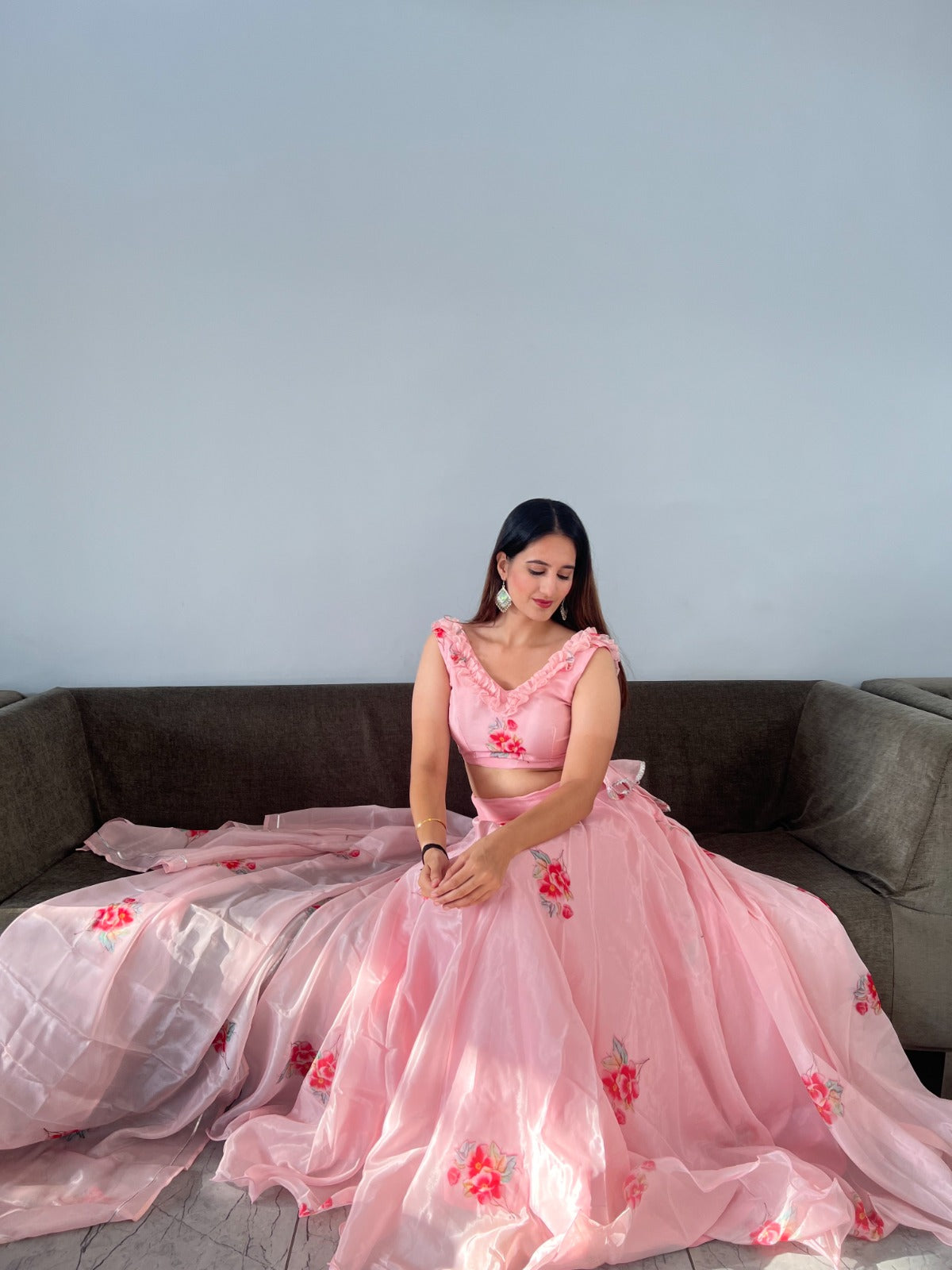 Lehenga Fabric Pure Jimmy Organza Silk Work Digital Printed Type Fully stitched Length 42" Size Up To 44" Size Flair 8 Meter Lehnga With Canvas Patta Choli Fabric Pure Jimmy Organza Silk Type Fully stitched Size Size 38 Padded Blouse (Margin Given) Dupatta Fabric Jimmy Organza Dupatta With Lace Border Type 2 Meter Occasion Party Wear, Ceremony Wear Product Care Instructions Dry Clean Only