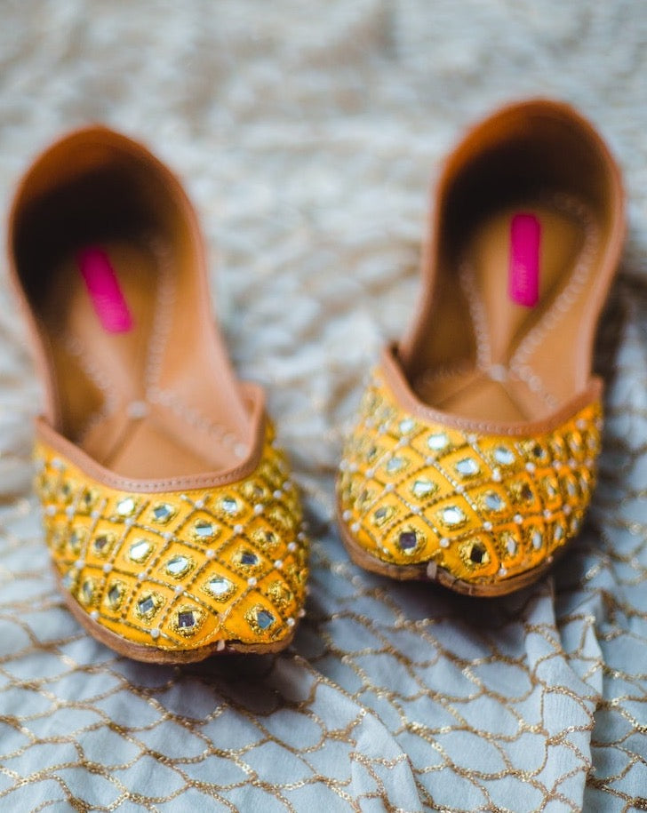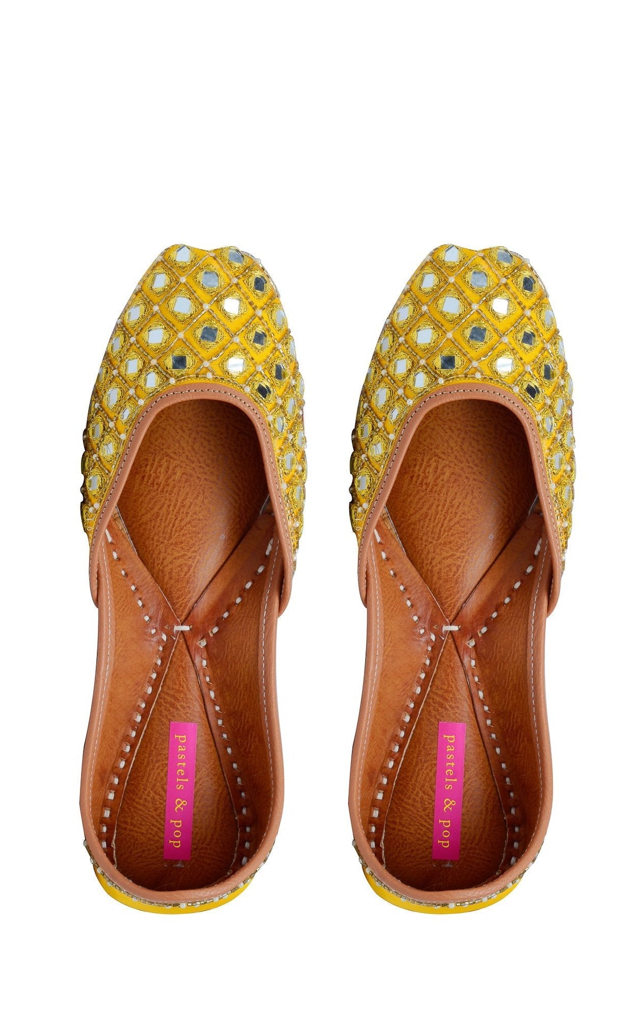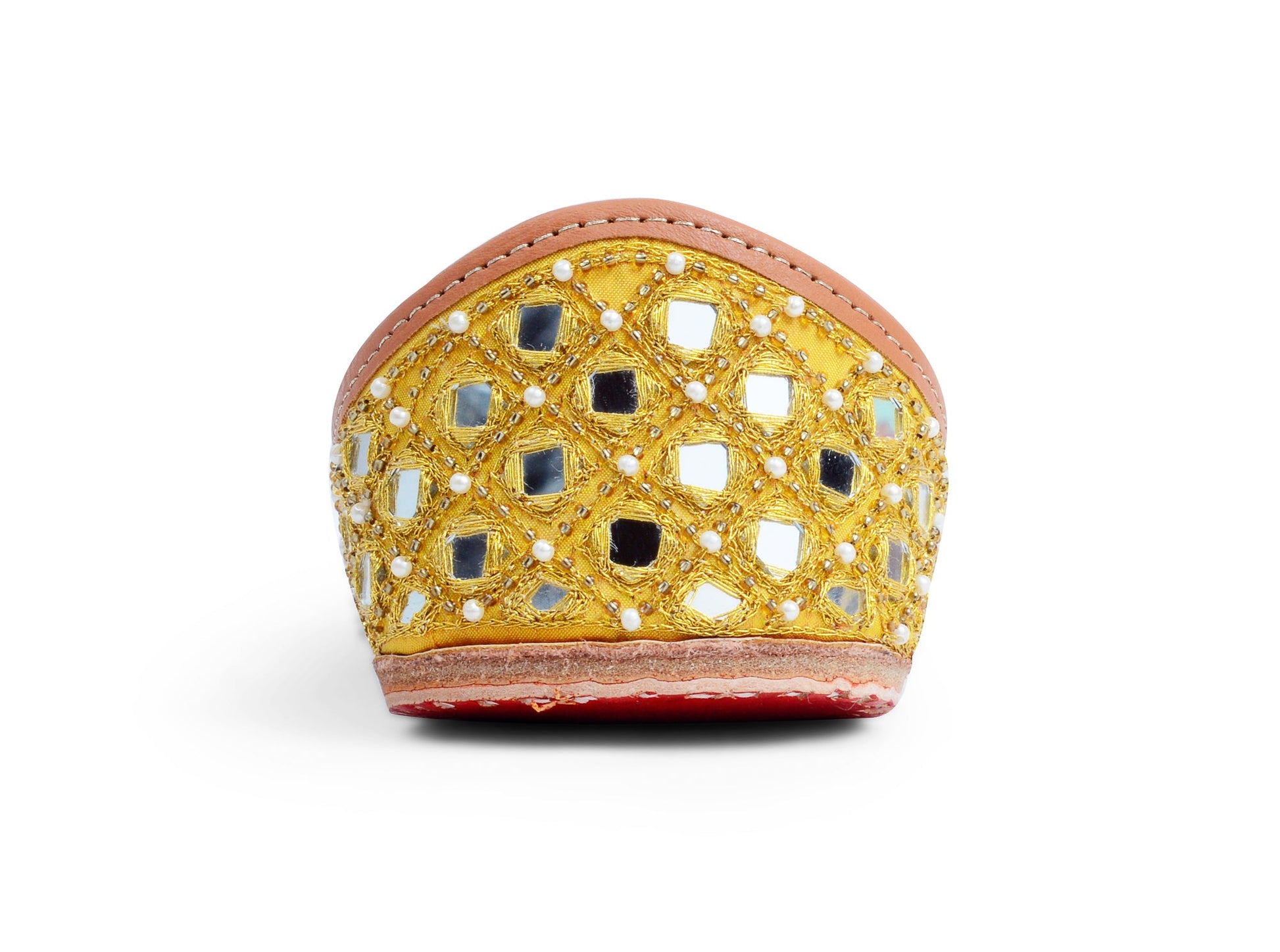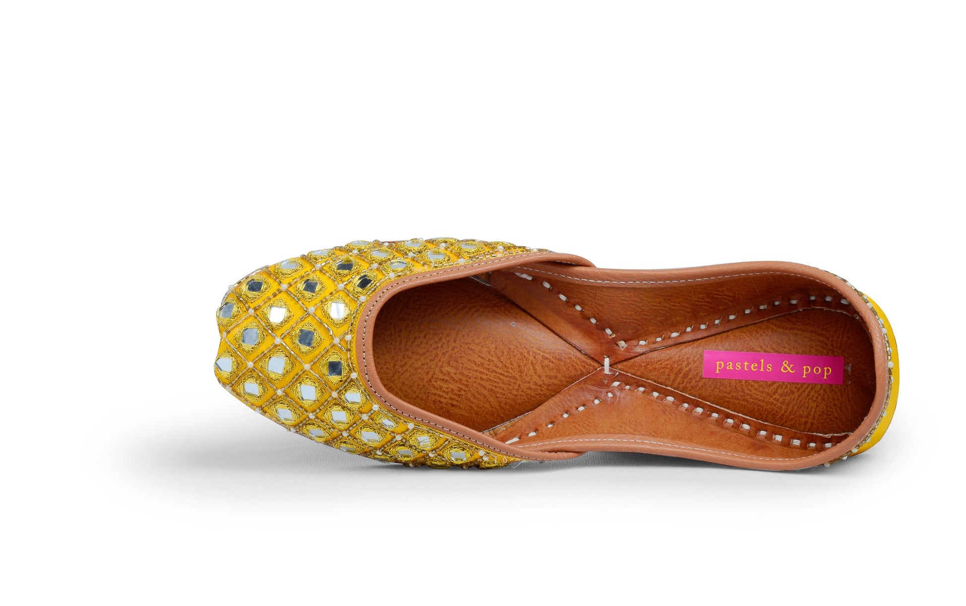 Sunshine yellow base with silver mirrors, gold beads and tiny pearls spread beautifully all over the jutti! The shade of yellow is just so happy, regal and absolutely beautiful! It's one of our all time favourite!