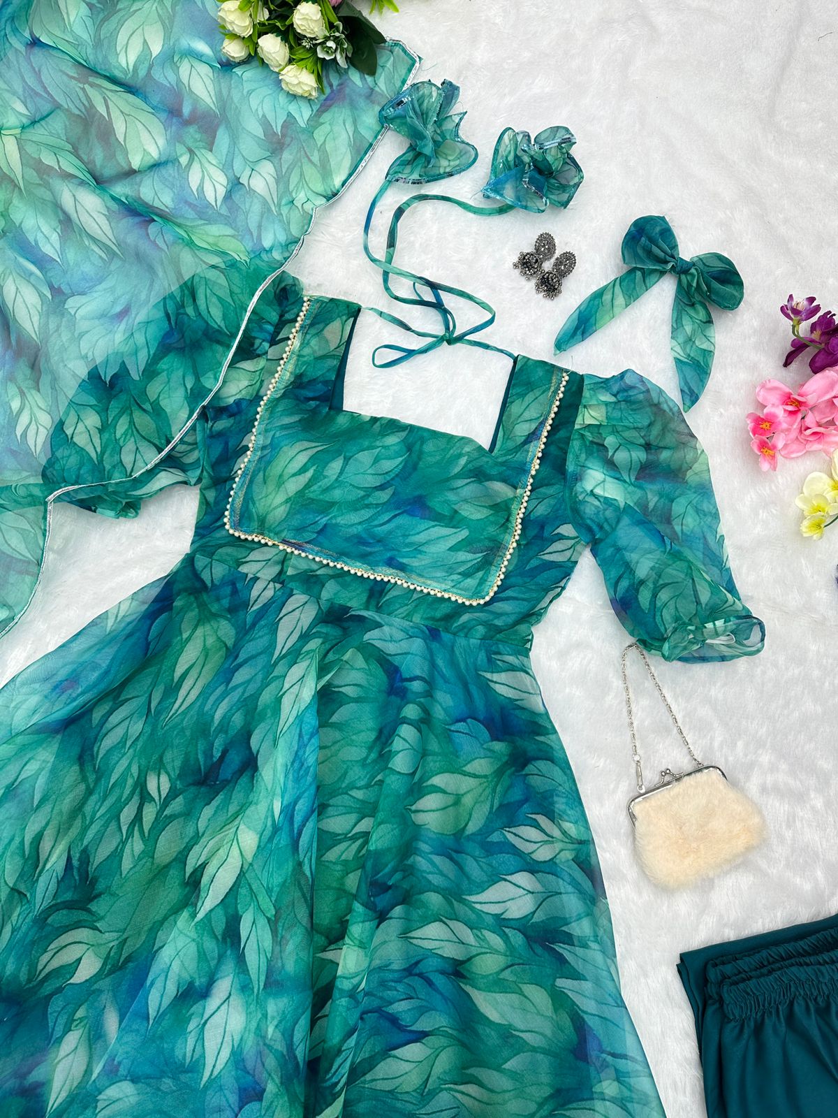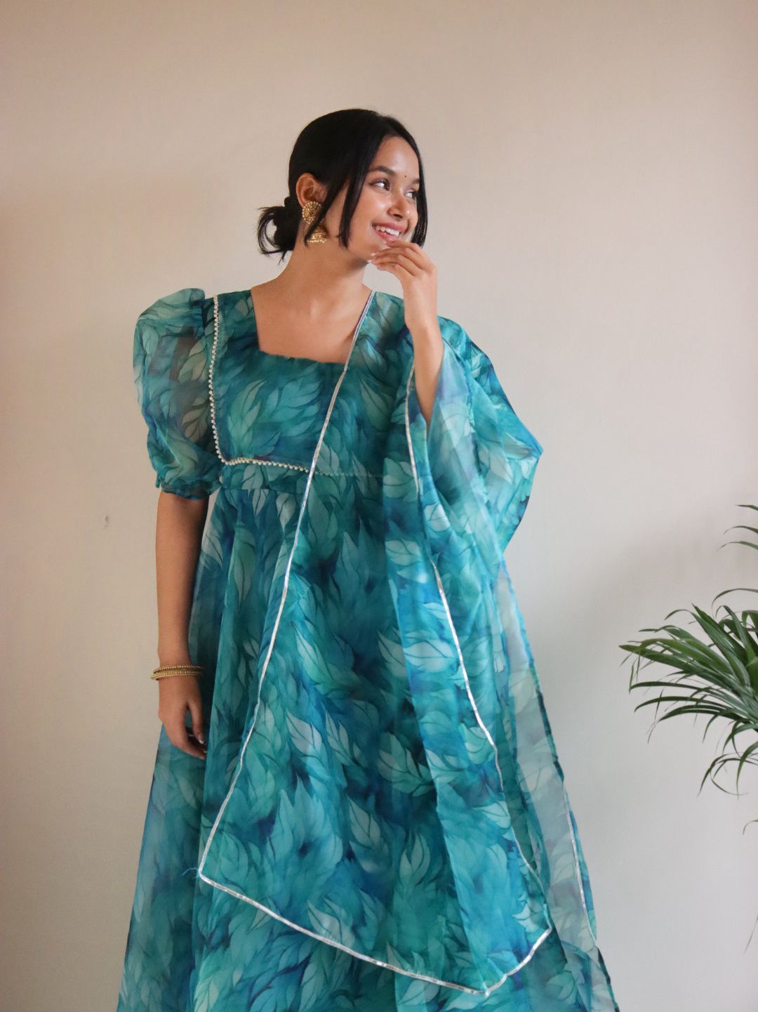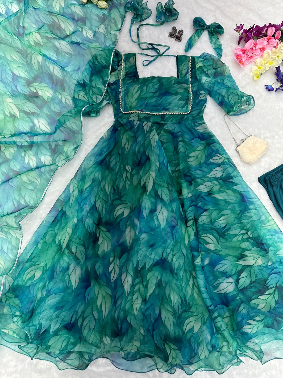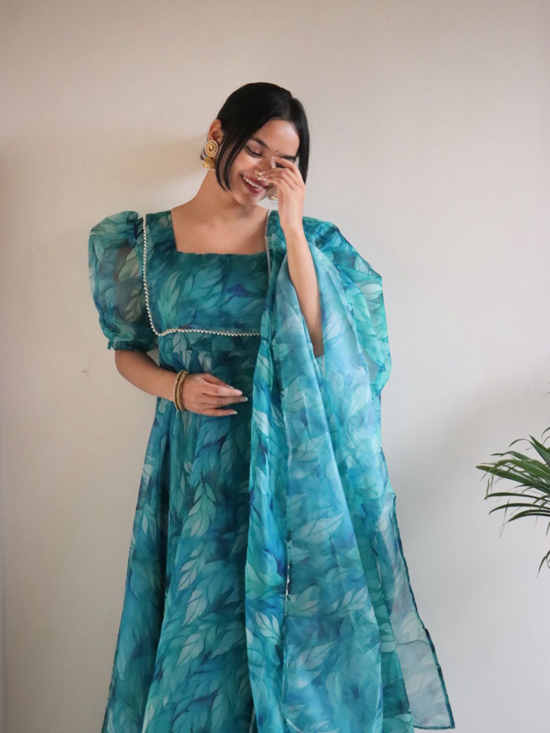 Trending Aqua Blue Printed With Beautiful Work Aliya Cut Suit