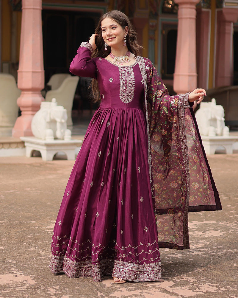 This wine-colored gown, made from rich chinnon fabric, features stunning sequin embroidery that adds a touch of sparkle and elegance. Ideal for festive occasions and special events, this gown combines traditional allure with modern sophistication, making it a standout choice.