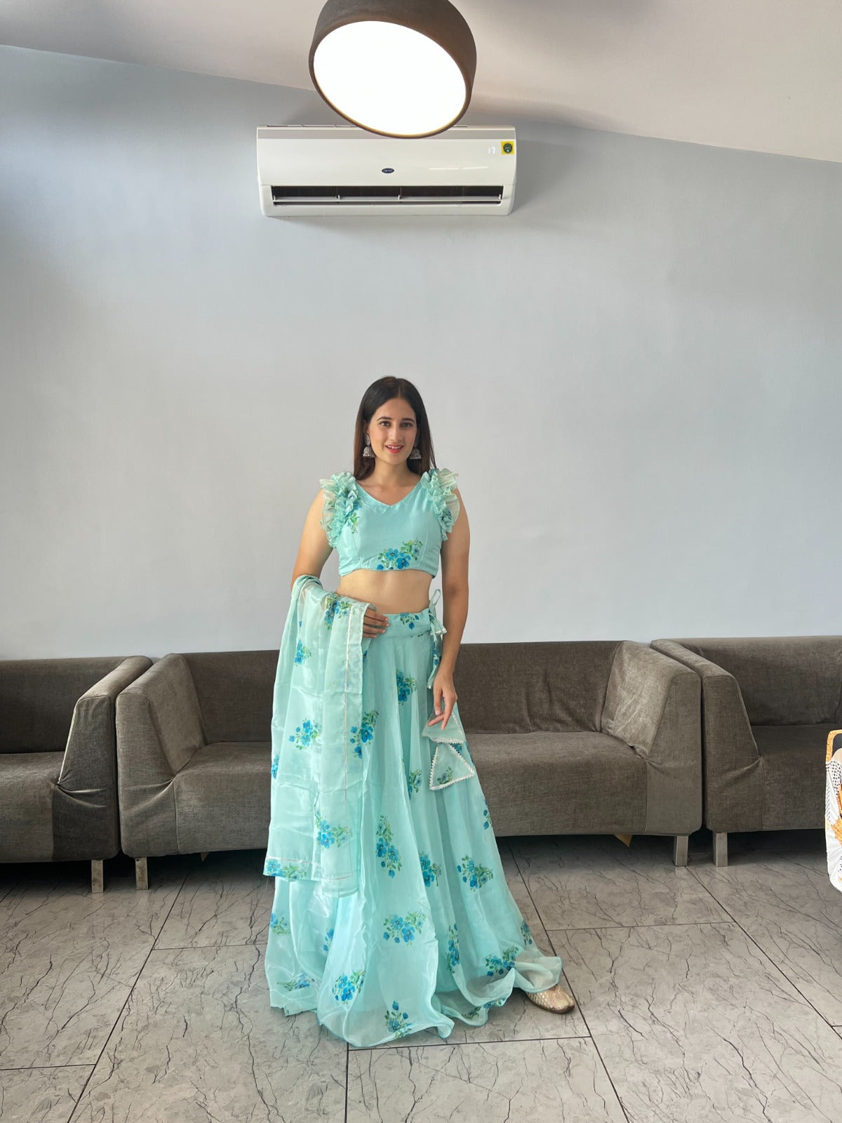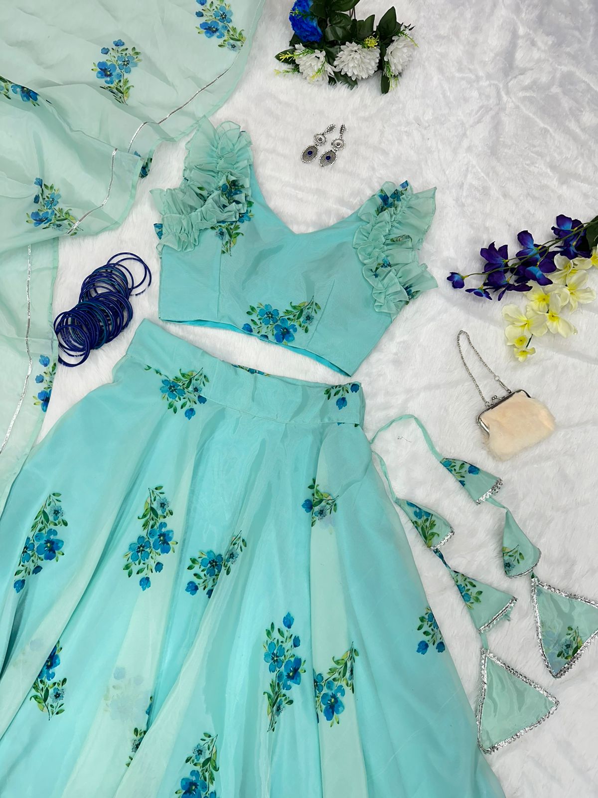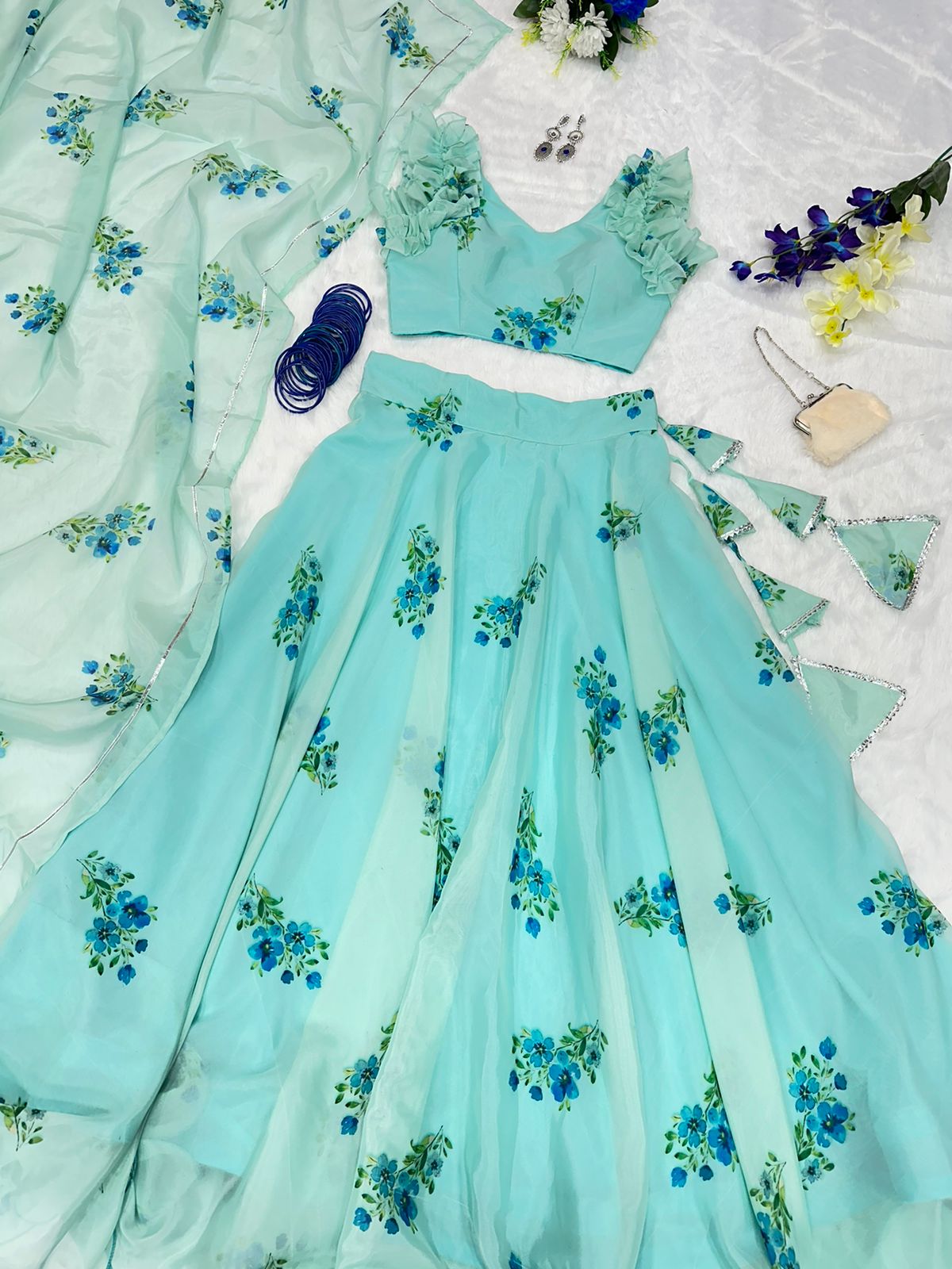 Wonderful Aqua Green Color Organza Silk Lehenga Choli