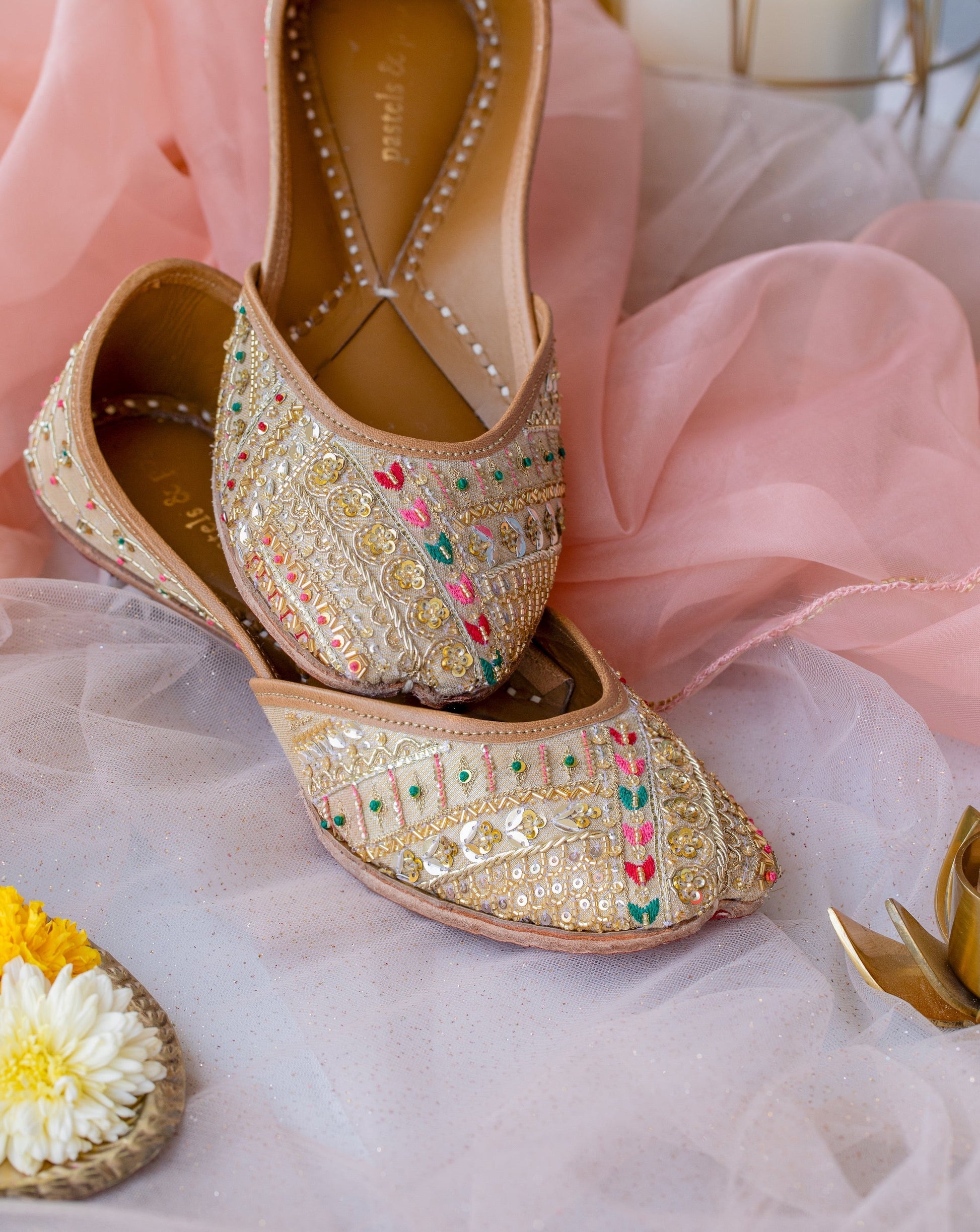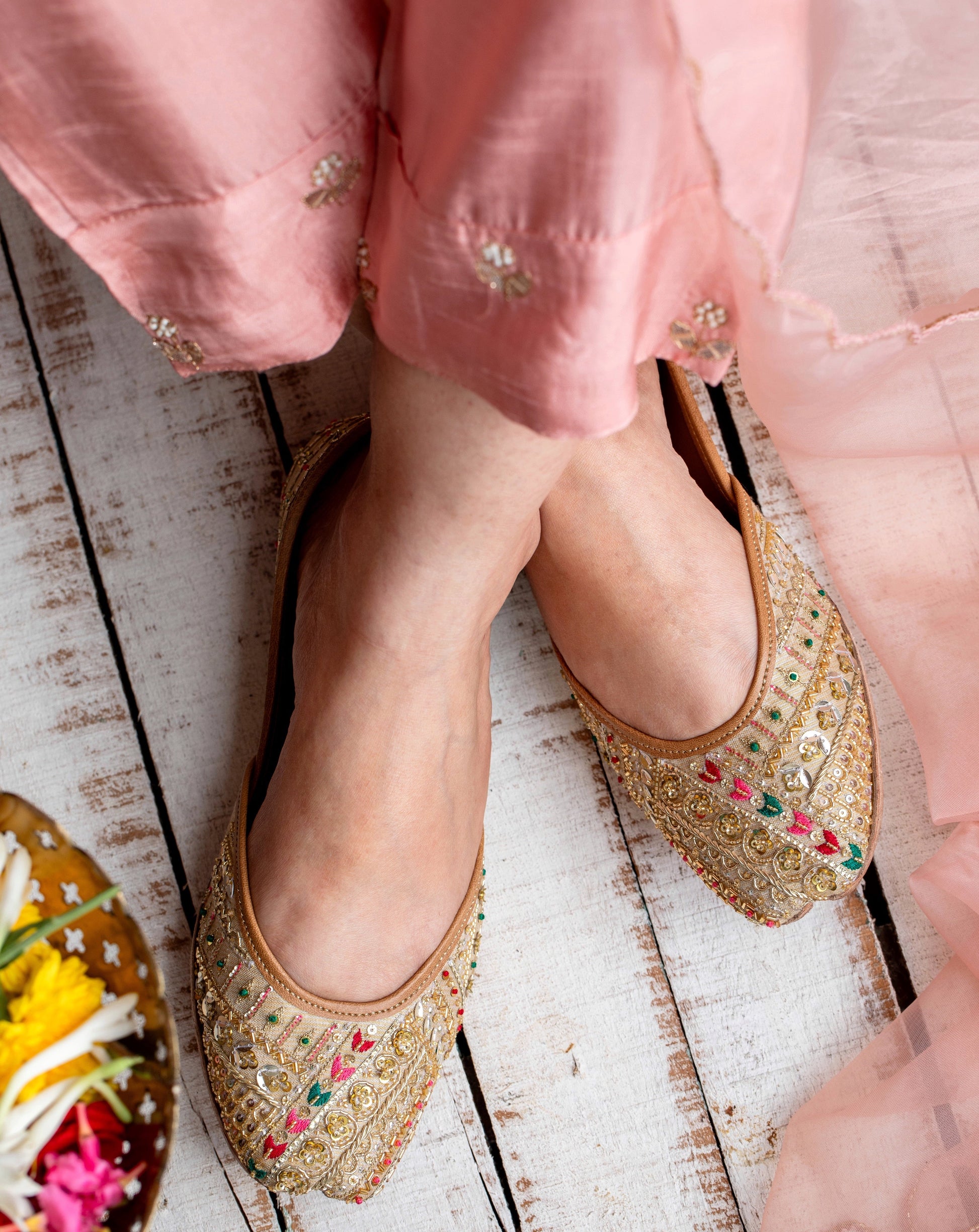 Composition : Upper - tissue with intricate hand-embroidery, Back - tissue, lining - leather, sole - vegetable tanned leather, double padded for extra comfort.